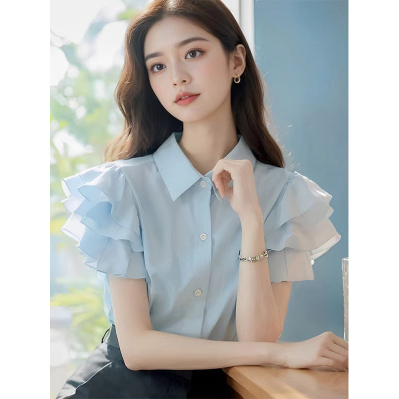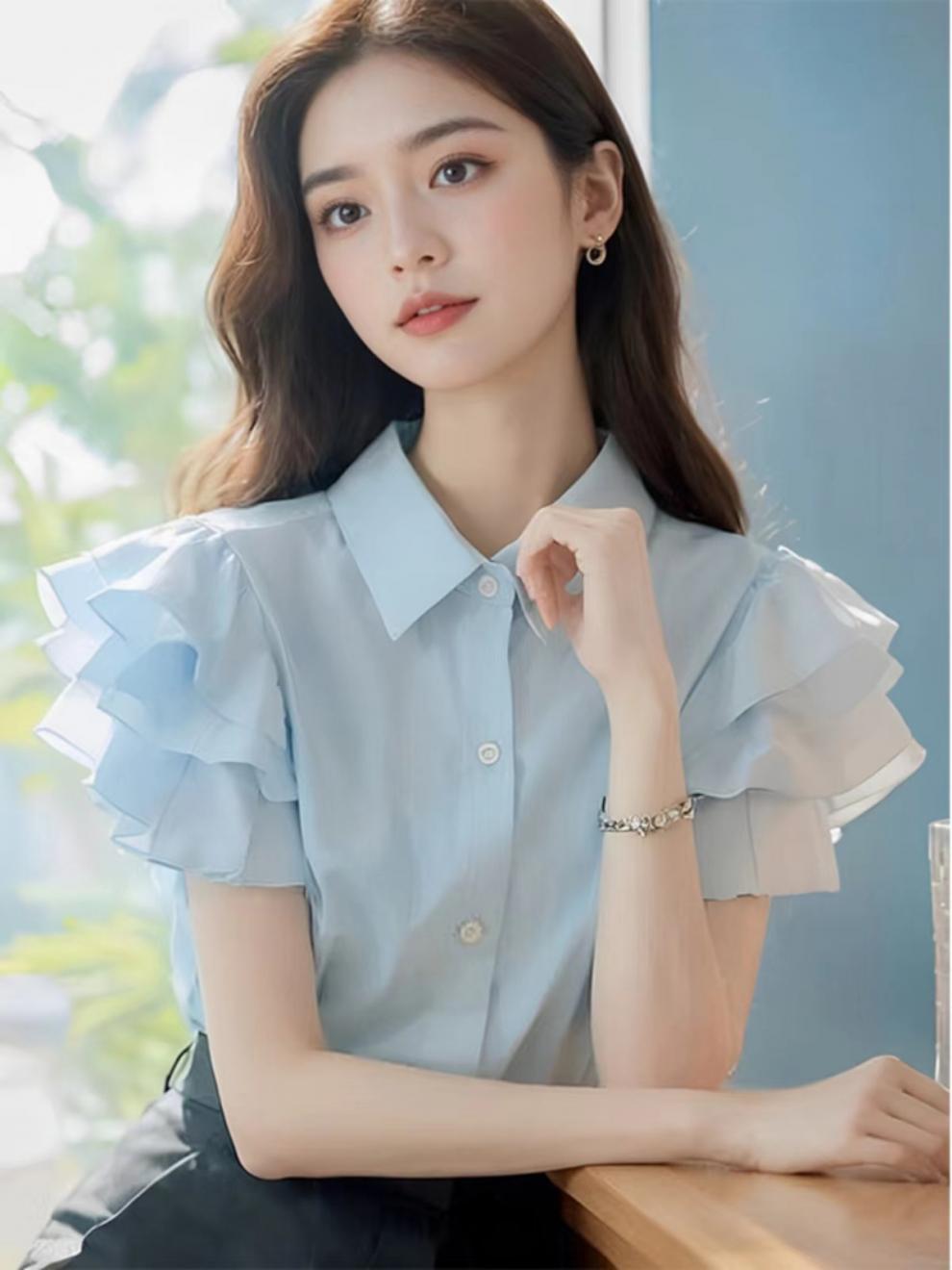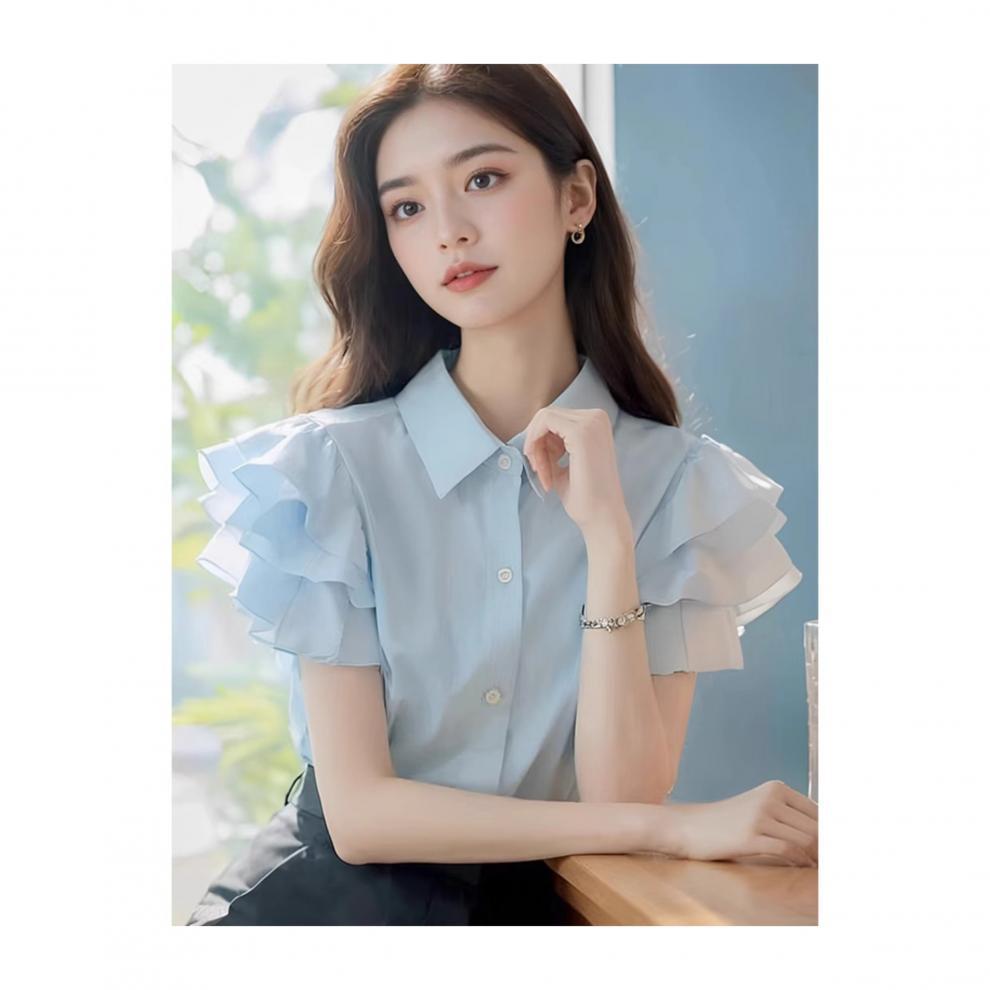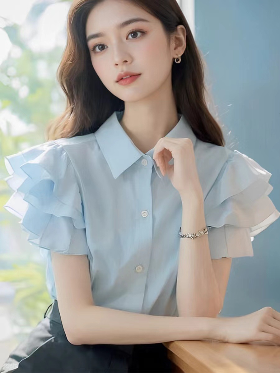 유럽의 아름다운 패션 캐주얼 기질 높은 감각 슈퍼 잘 생긴 탑 블루 프릴 짧은 소매 셔츠 여성의 여름스토어 가기