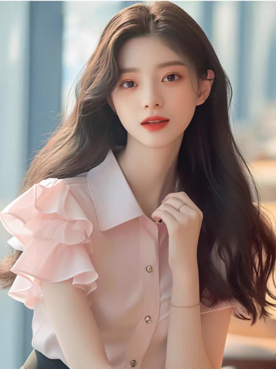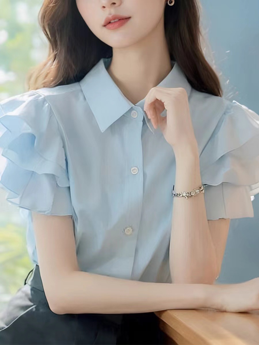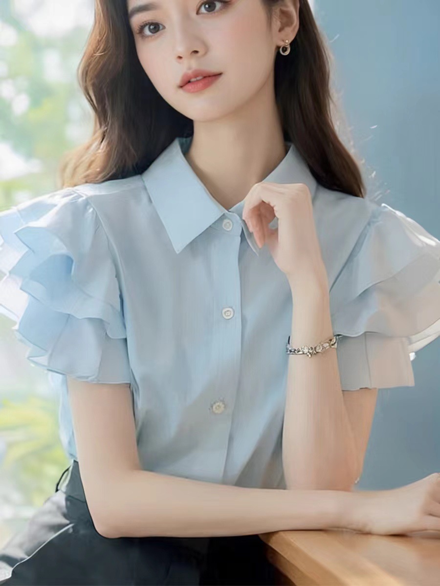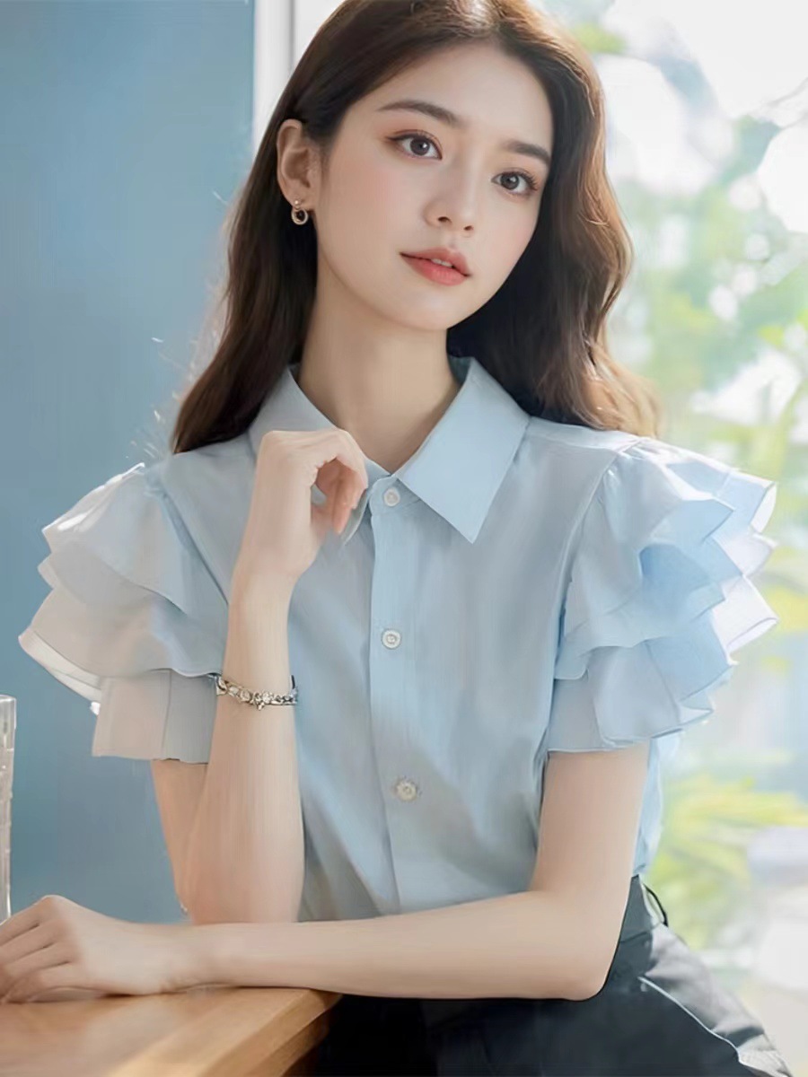 유럽의 아름다운 패션 캐주얼 기질 높은 감각 슈퍼 잘 생긴 탑 블루 프릴 짧은 소매 셔츠 여성의 여름스토어 가기