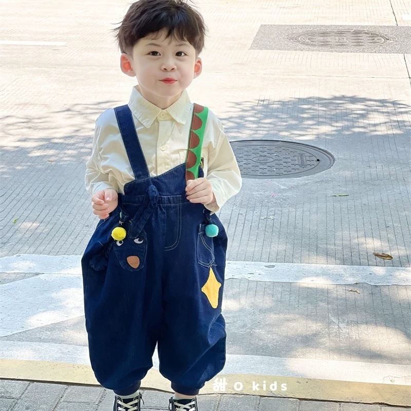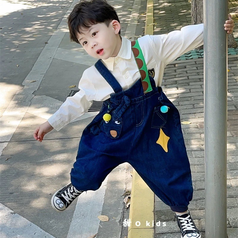 [매장 핫셀링] 한국판 어린이 봄, 가을 광대 데님 작업복 소년 소녀용 귀여운 만화 중공업 루즈스토어 가기
