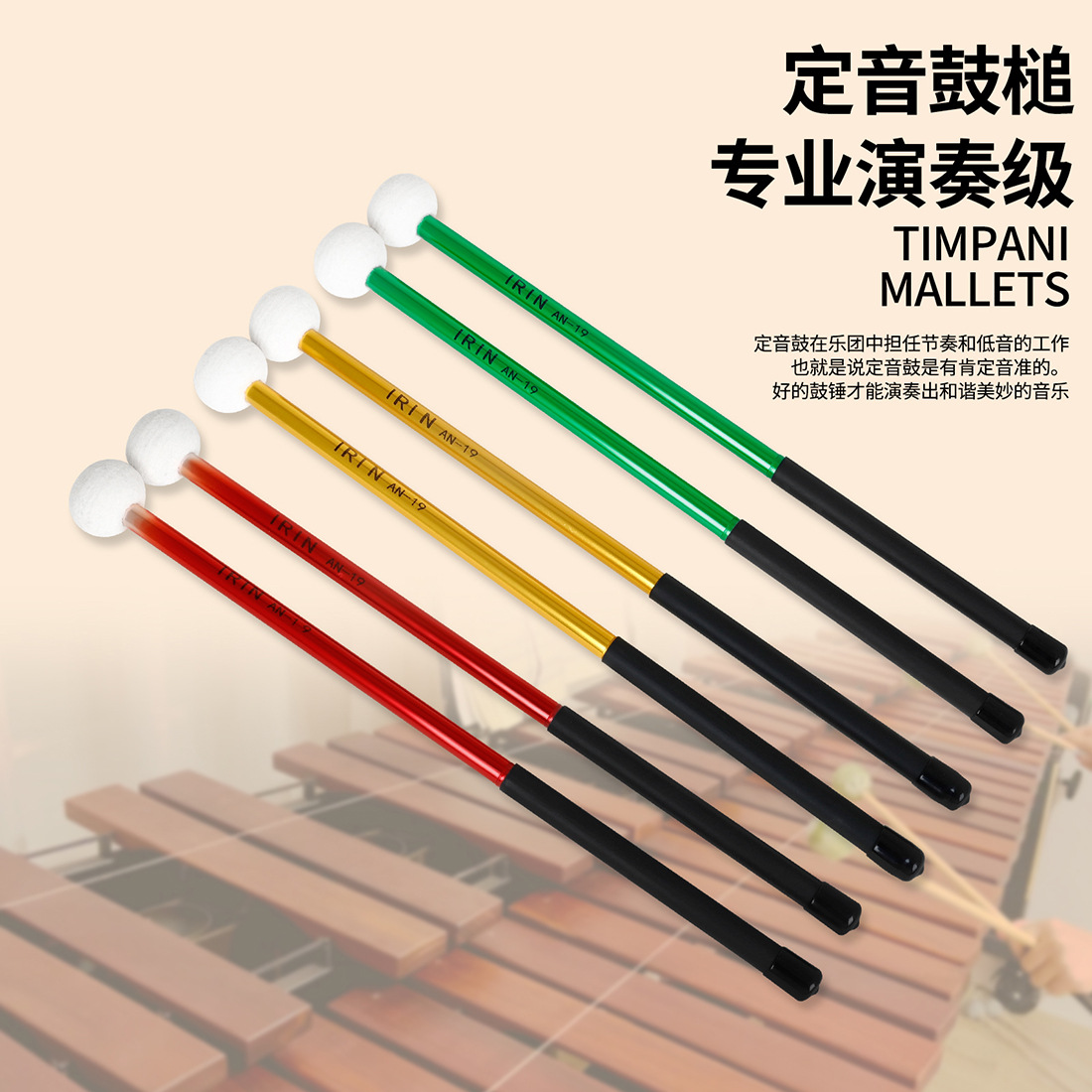 用途卖点:IRIN艾琳AN-19定音槌毛毡头铝合金材质防滑手柄合金手柄,重量轻,强度高,不变形,不退色,防滑手柄,握感舒适,羊毛毡槌头,适合多种场景使用,行进鼓、定音鼓、镲片等各种场景