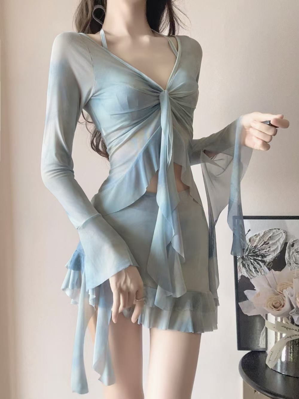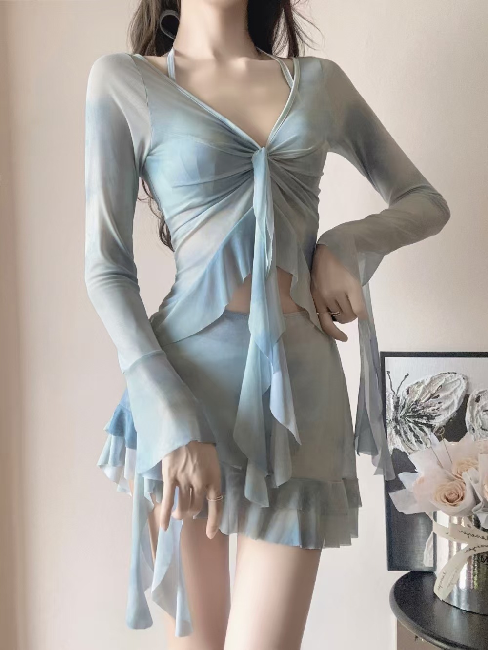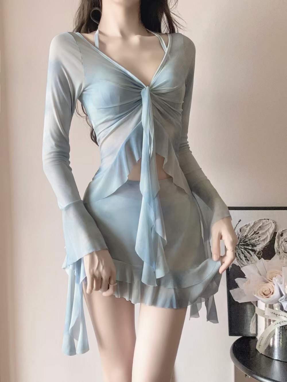 피난 공주 수영복 여성 2025 새로운 핫 스타일 비키니 4 피스 세트 섹시한 긴팔 블라우스 아름다운 온천
