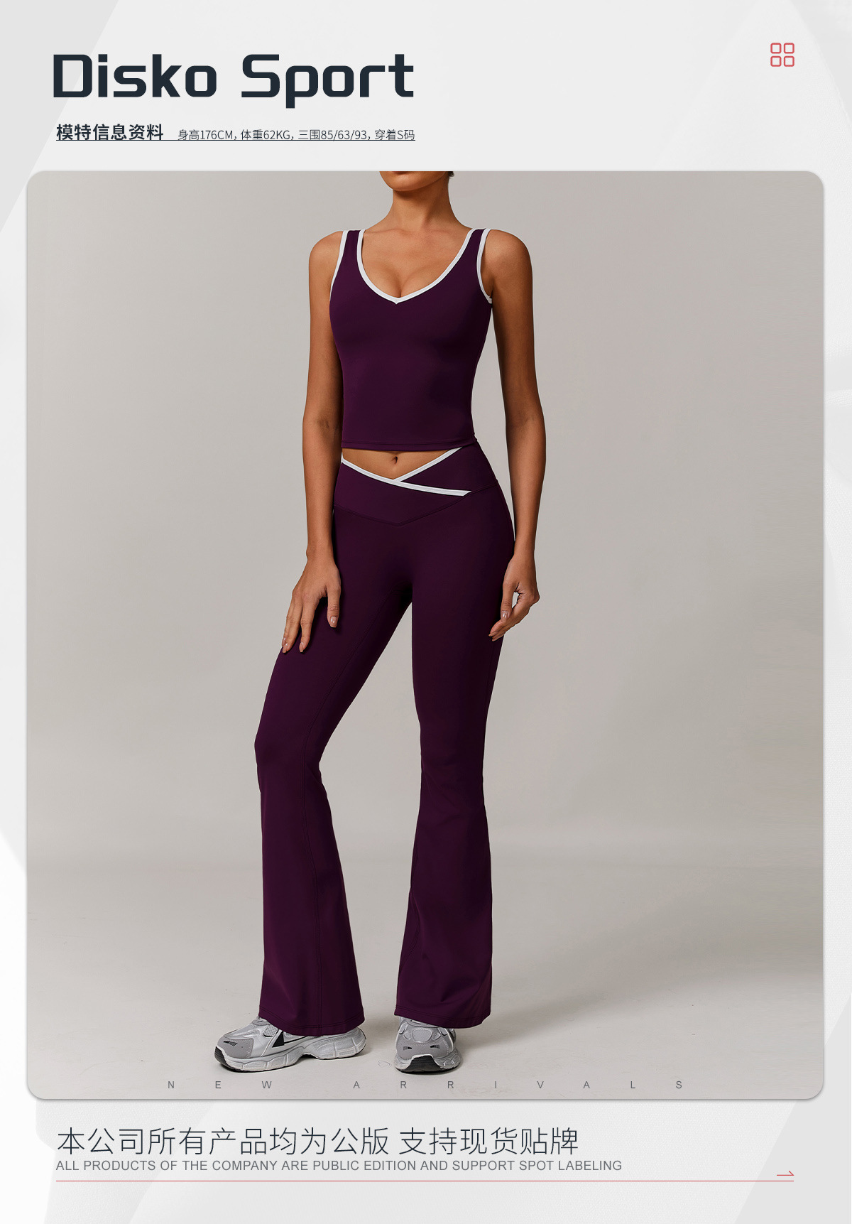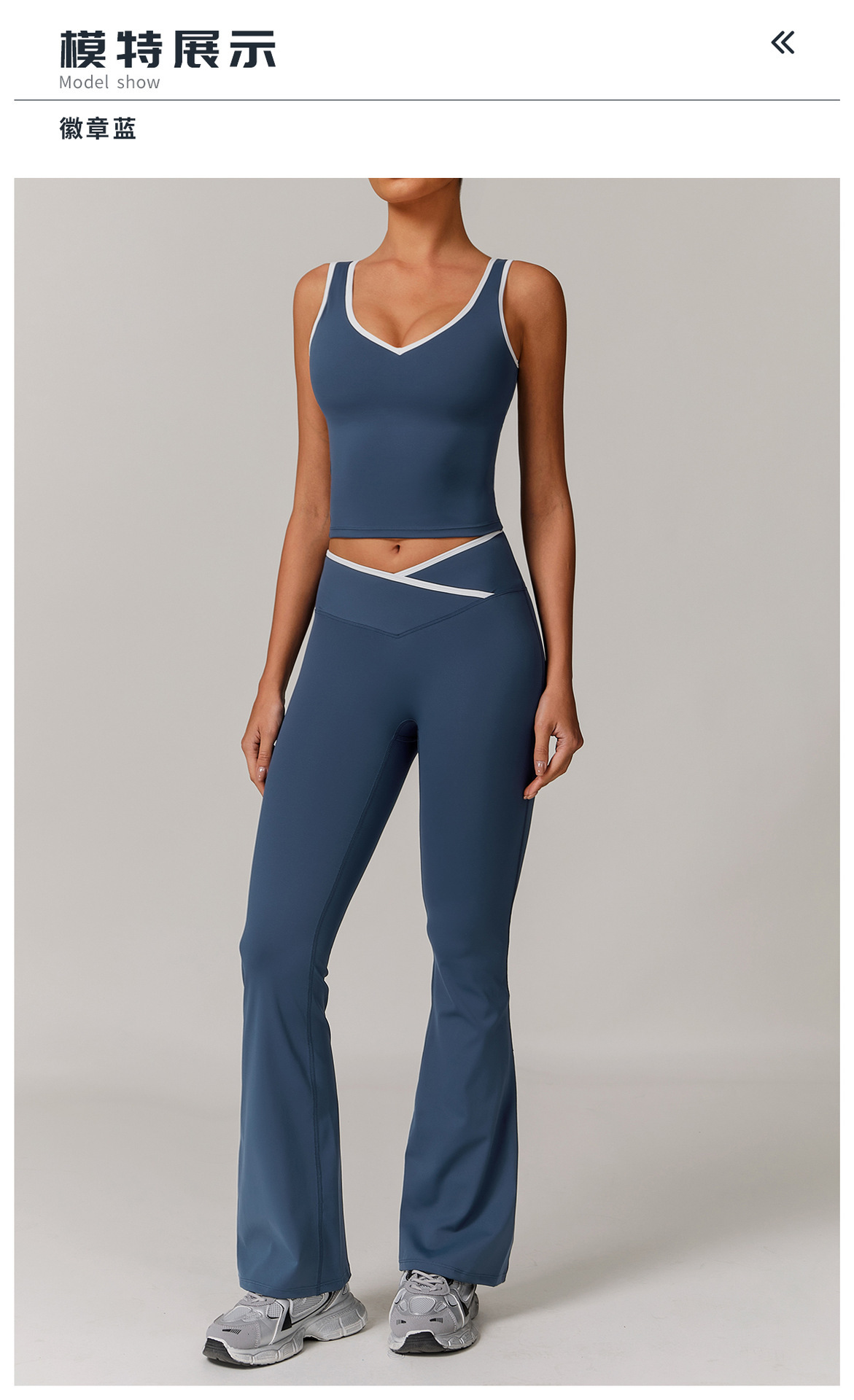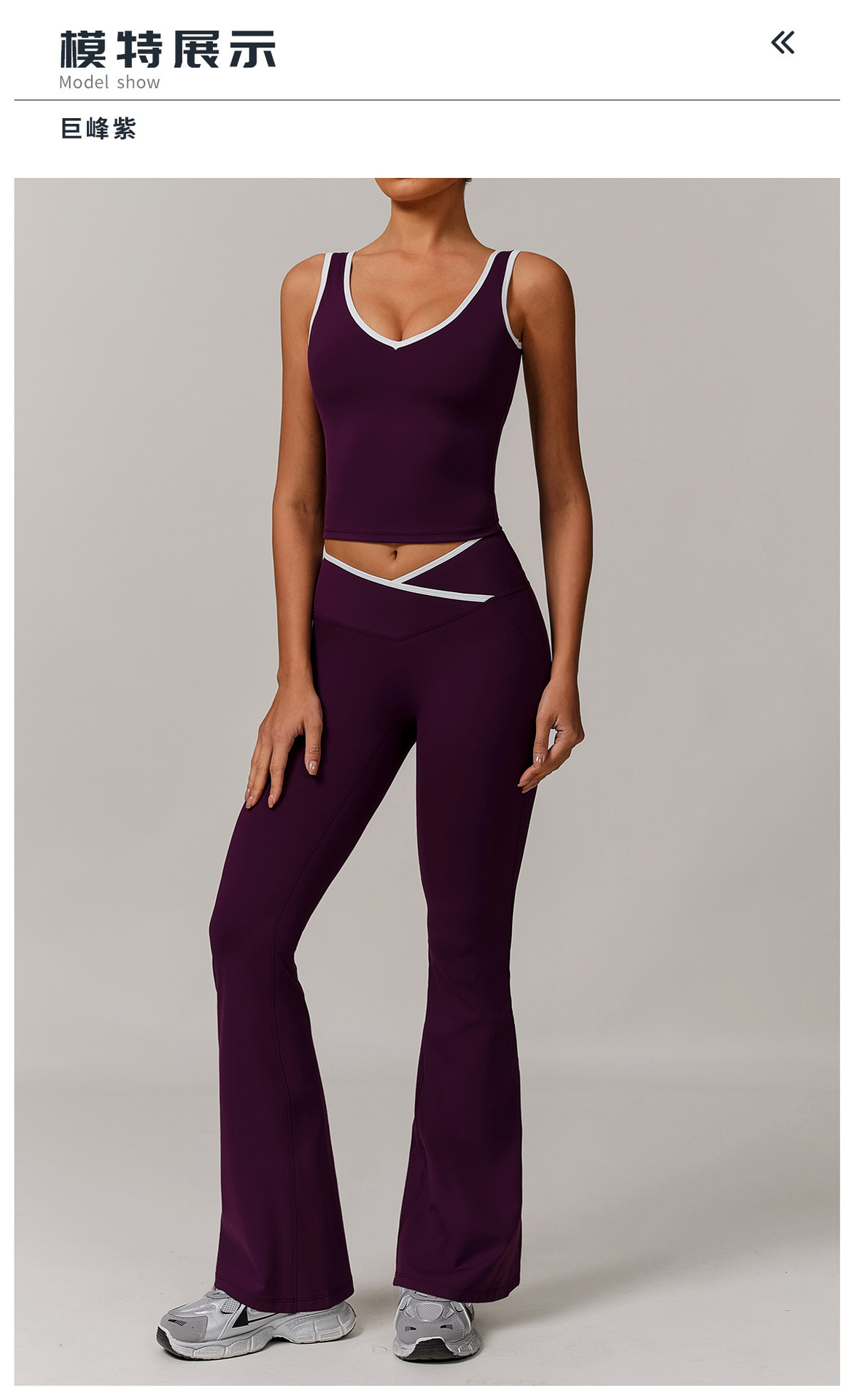 대조적 인 색상 섹시한 타이트 피트니스 의류 세트 V-Neck 스포츠 조끼 빠른 건조 높은 허리 크로스 엉덩이 리프팅 요가 플래 드 바지