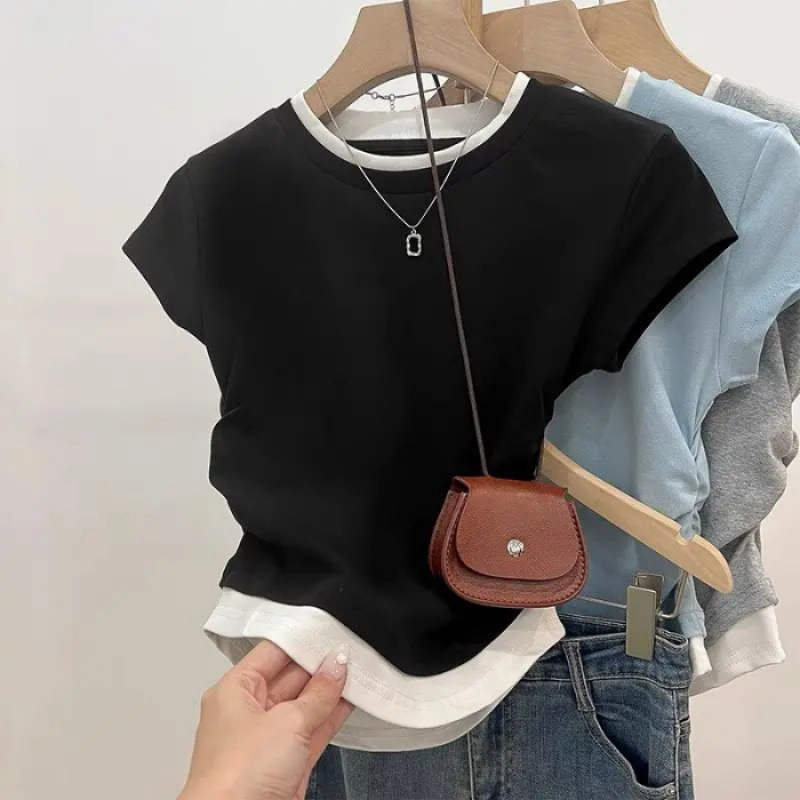 스티칭 크루 넥 어깨 반팔 티셔츠 걸스 여름 새로운 가짜 투피스 세트 Pleasted 짧은 슬림 핏 탑스토어 가기