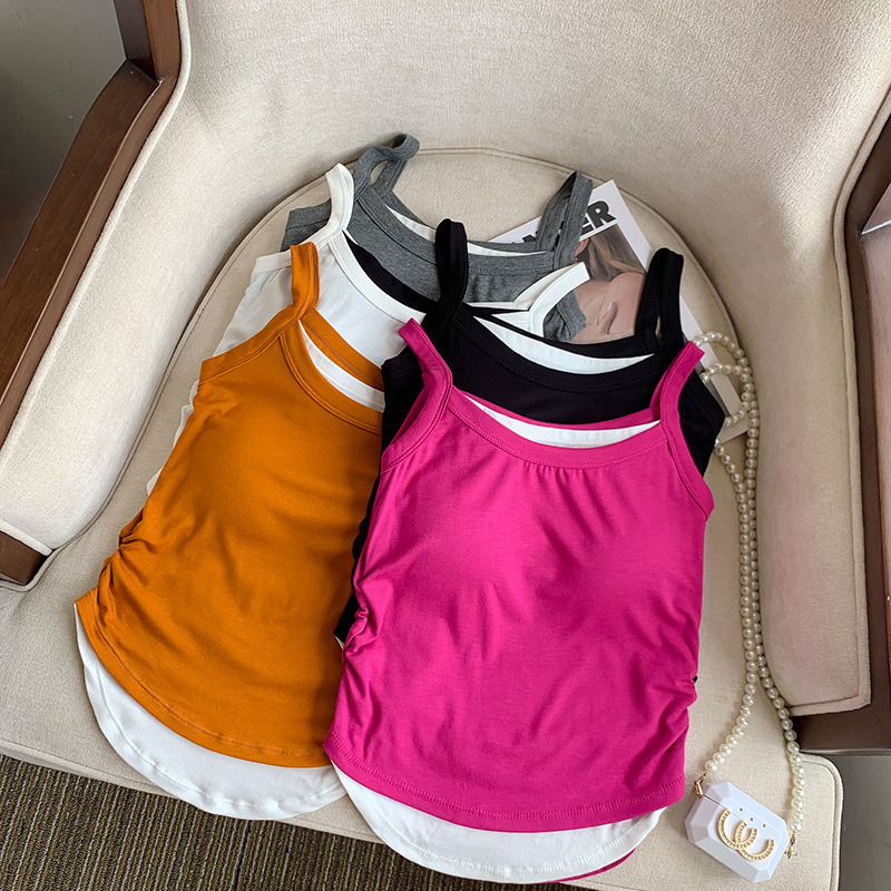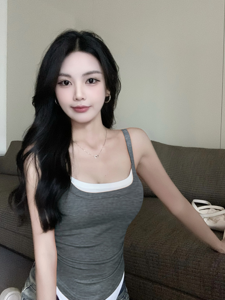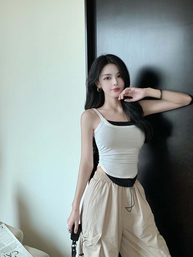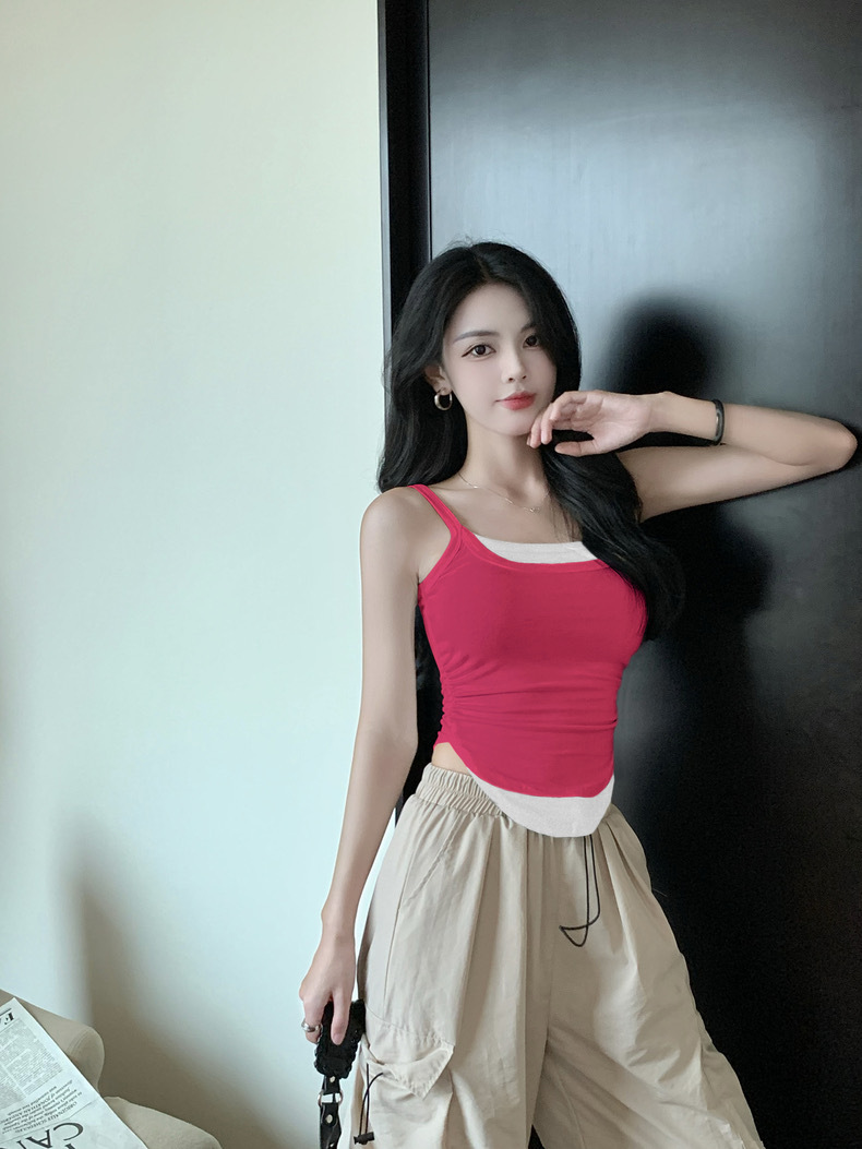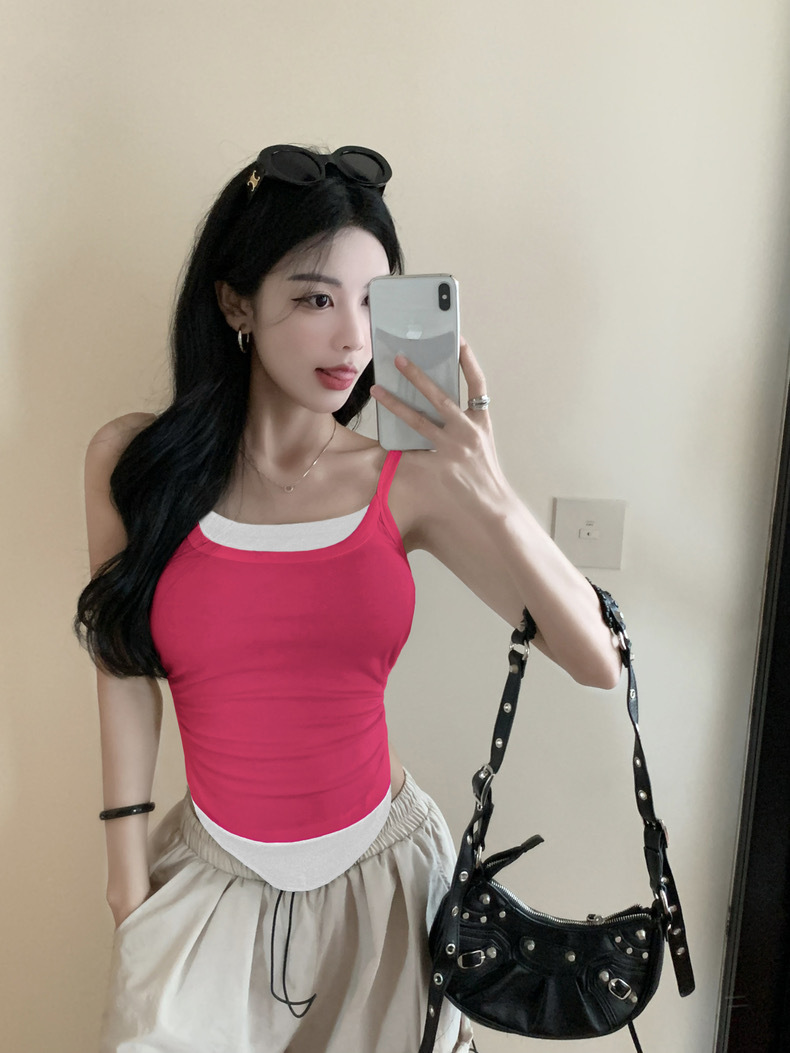 2024 새로운 미국 스타일 스파이스 소녀 U 자형 슬링 대조 컬러 디자인 가짜 투피스 스태킹 웨어 슬리밍 심플 아우터 착용 여성