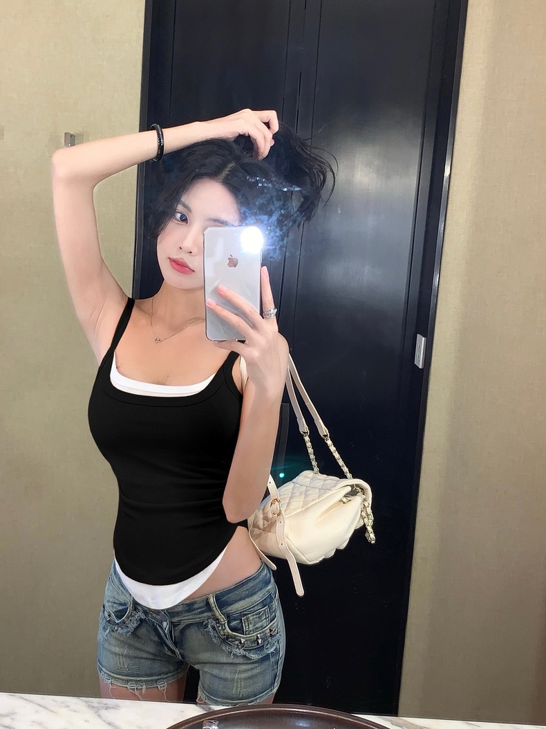 2024 새로운 미국 스타일 스파이스 소녀 U 자형 슬링 대조 컬러 디자인 가짜 투피스 스태킹 웨어 슬리밍 심플 아우터 착용 여성스토어 가기