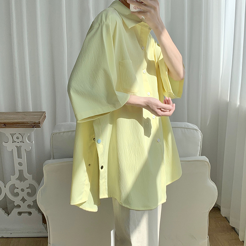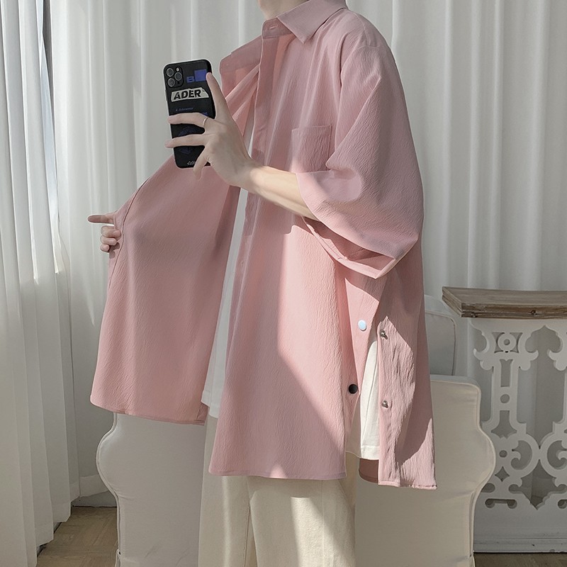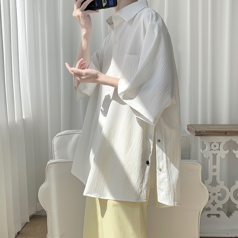 버튼다운 슬릿 반팔 셔츠 남성 여름 디자인 틈새 셔츠 한국 스타일 홍콩 스타일 트렌디 자켓 탑 남성