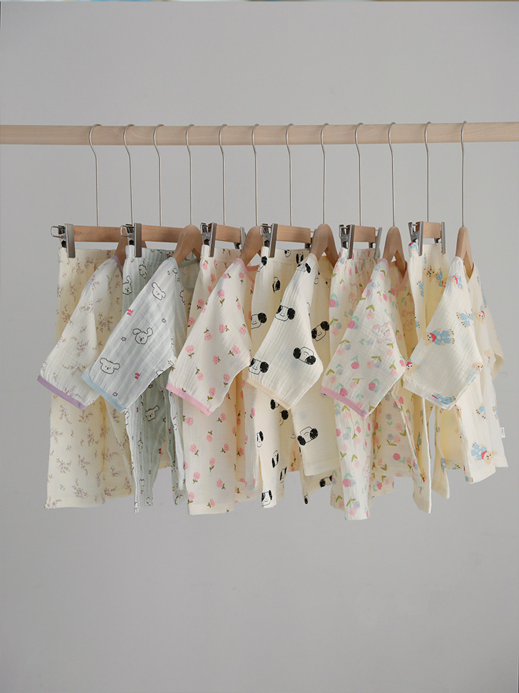 2024 어린이 에어컨 홈 의류 소년 소녀를위한 만화 더블 레이어 코튼 원사 잠옷 순면 여름 얇은 소매 세트