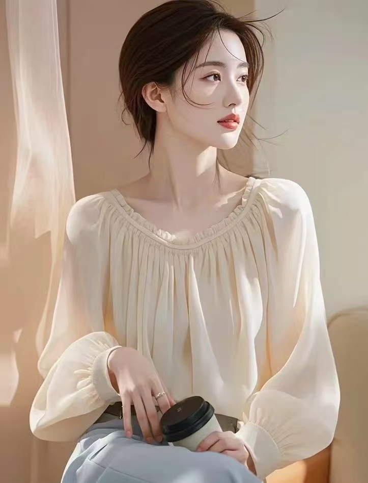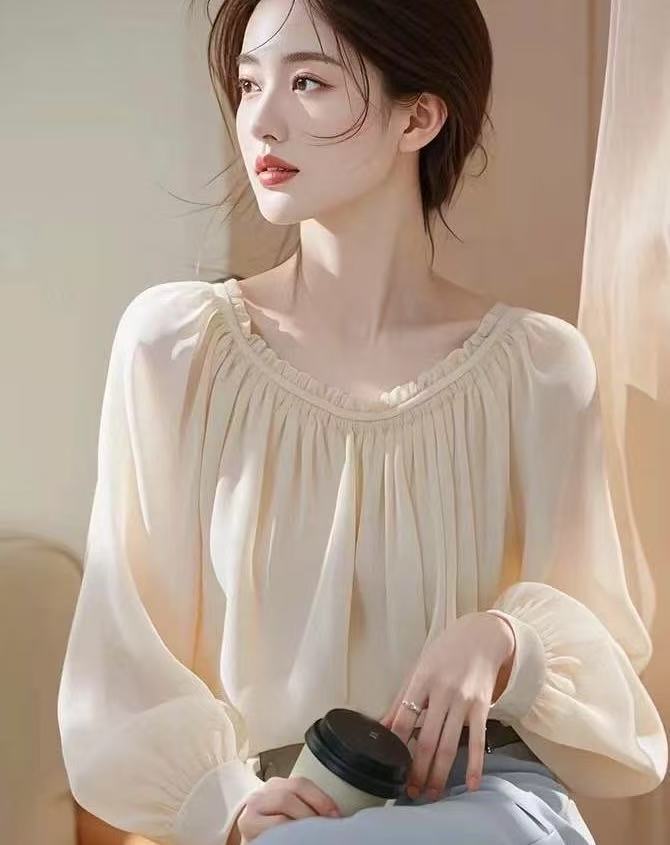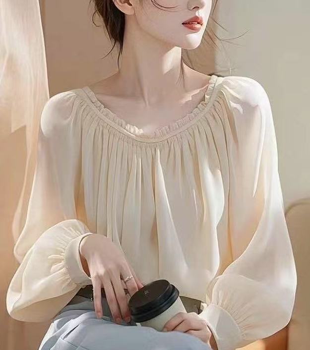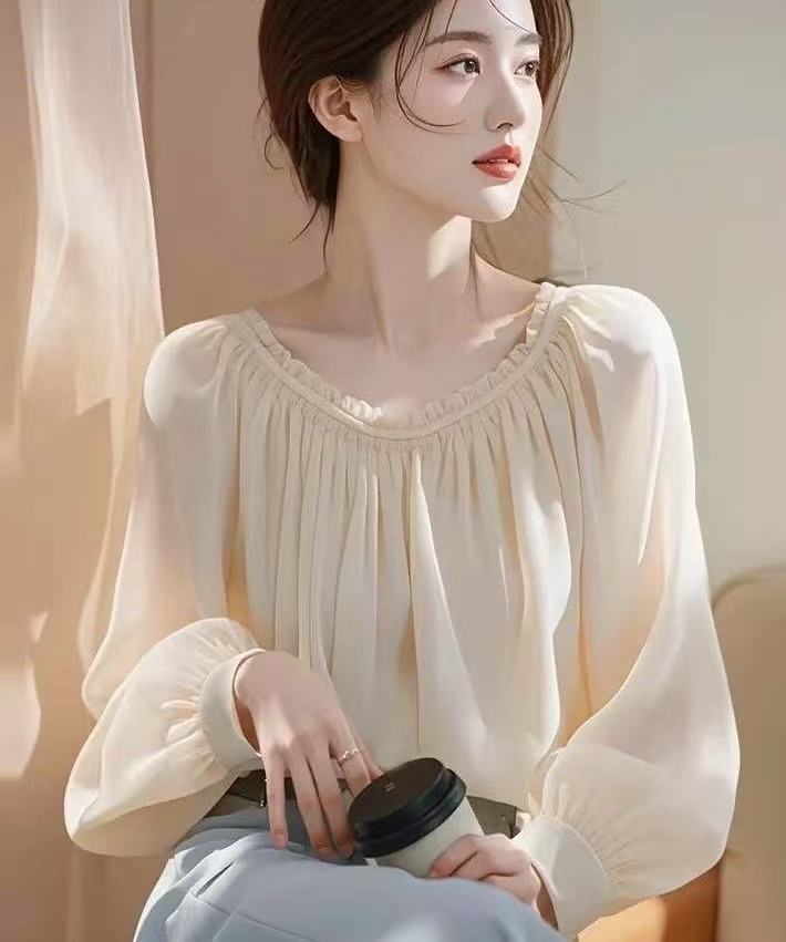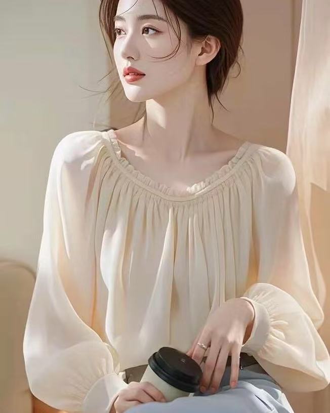 2025 이른 봄 새로운 간단한 올 매치 쉬폰 셔츠 랜턴 소매 핫 스타일 아름다운 쉬폰 우아한 긴 소매 탑