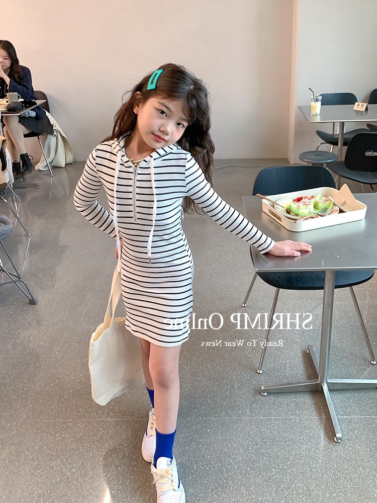 가을 2024 새로운 한국 소녀 크림 스트라이프 후드 슬림 핏 원피스 아기 가을 긴 소매 티셔츠 원피스