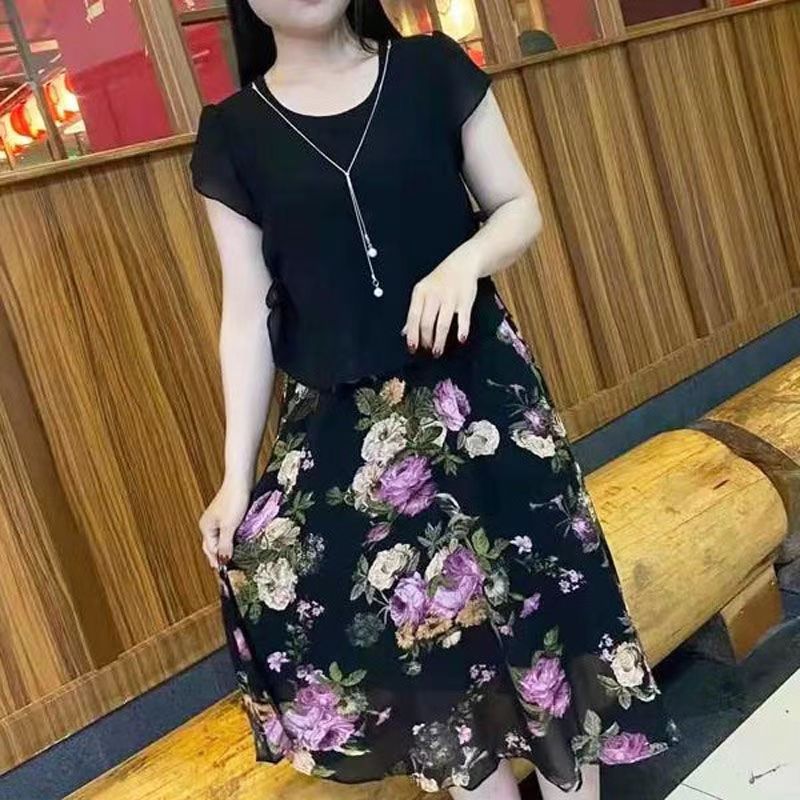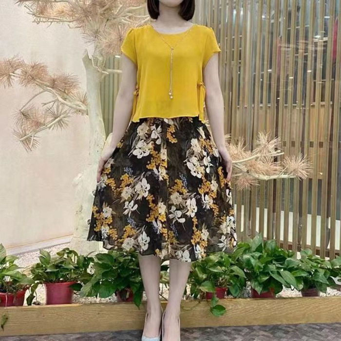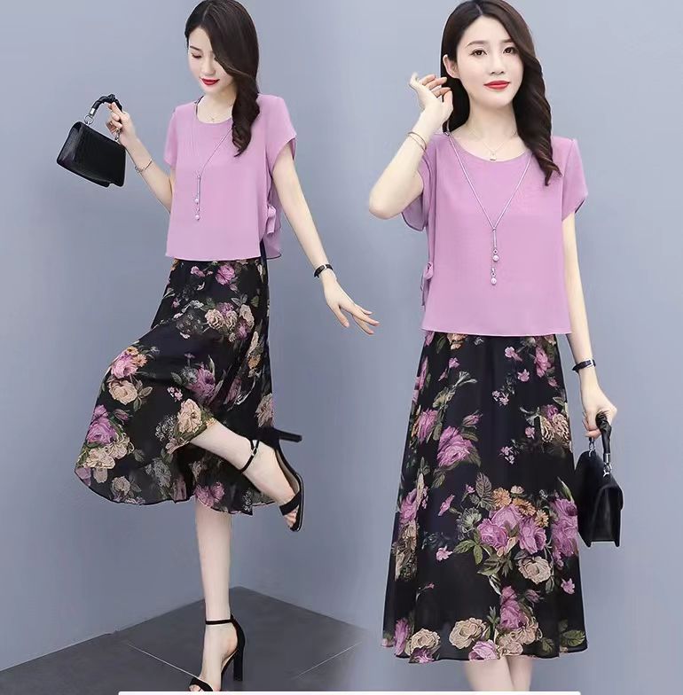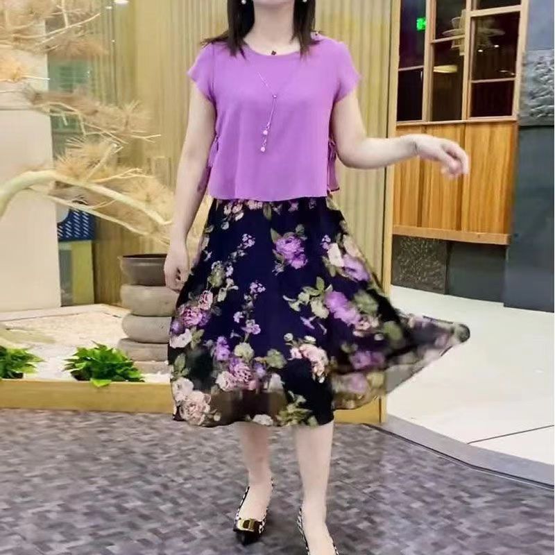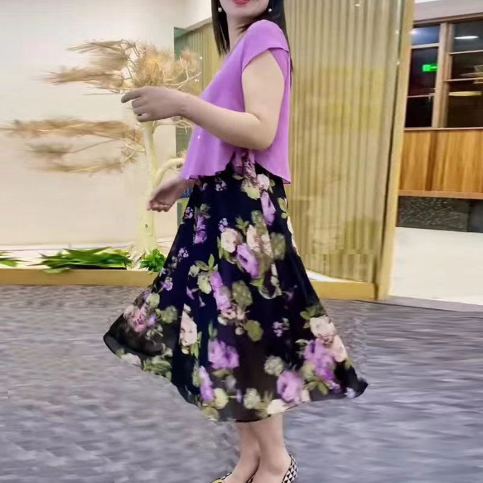 2024 여성 여름 새로운 패션 슬림 핏 투피스 세트 살로 덮인 중년 어머니의 꽃 원피스스토어 가기