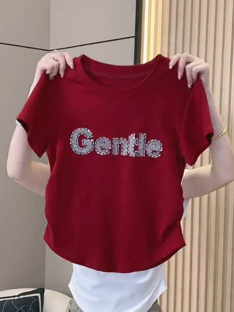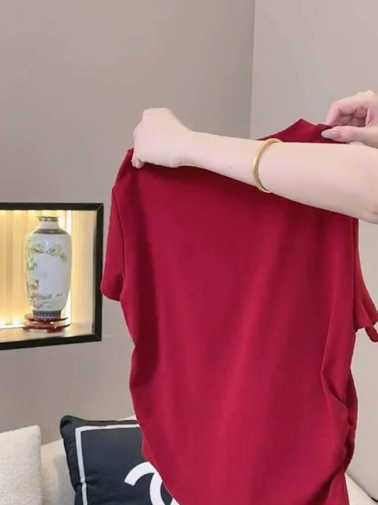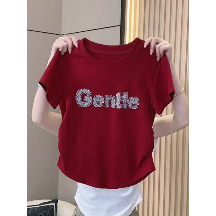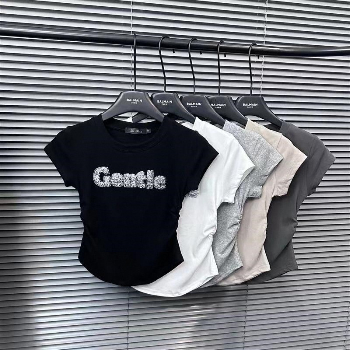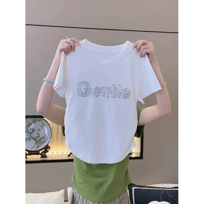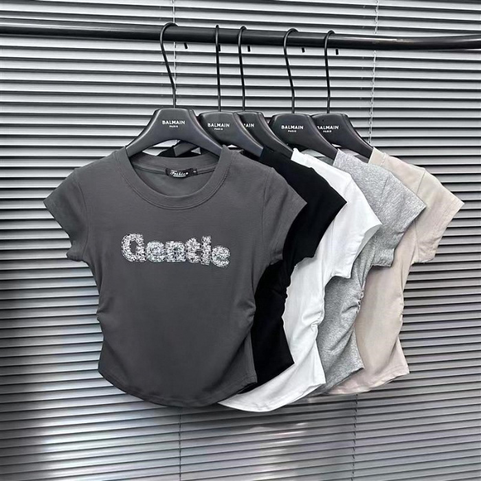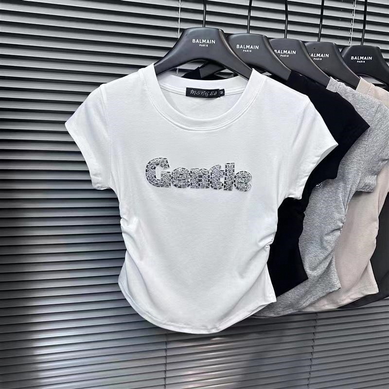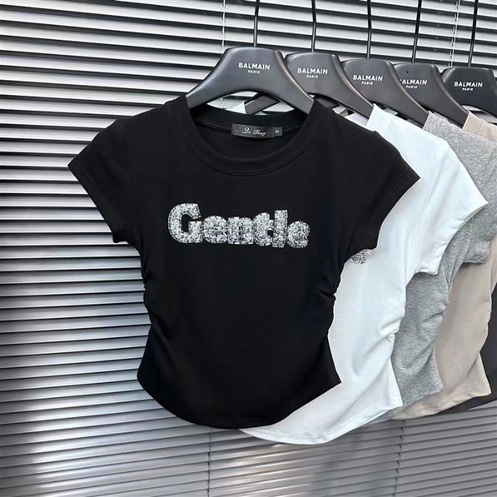 패션 하이 엔드 2024 다이아몬드 올 매치 반팔 티셔츠 여름 새로운 슬림 핏 타이트 허리 주름 스파이스 걸스 슬리밍 탑스토어 가기