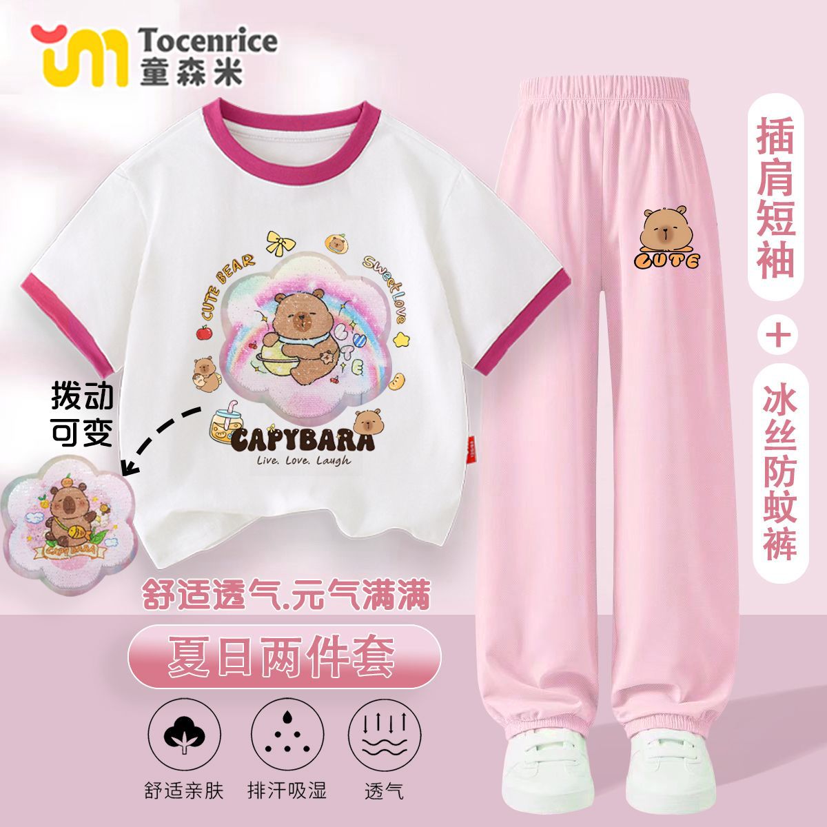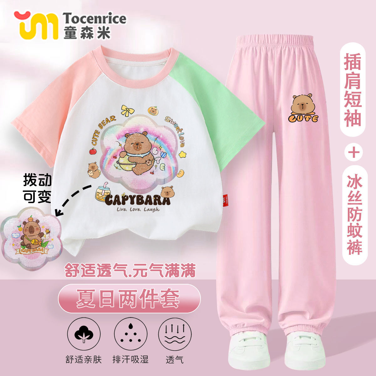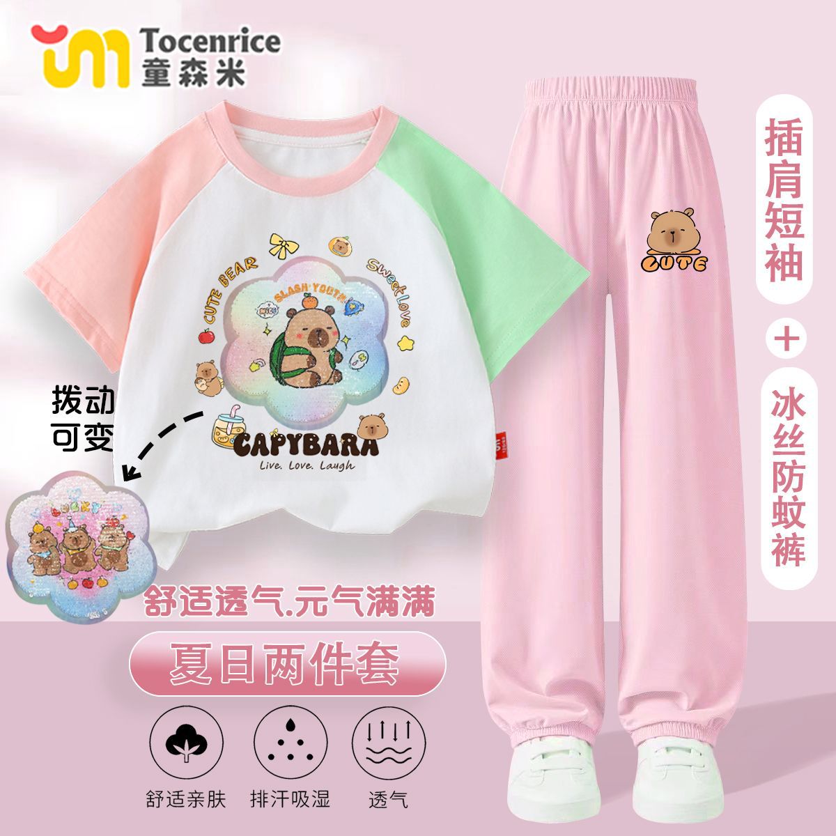 여아 카피바라 스팽글 색상 변경 반팔 모기 방지 바지 정장 2025 여름 중대형 아동 스타일 얇은 스타일