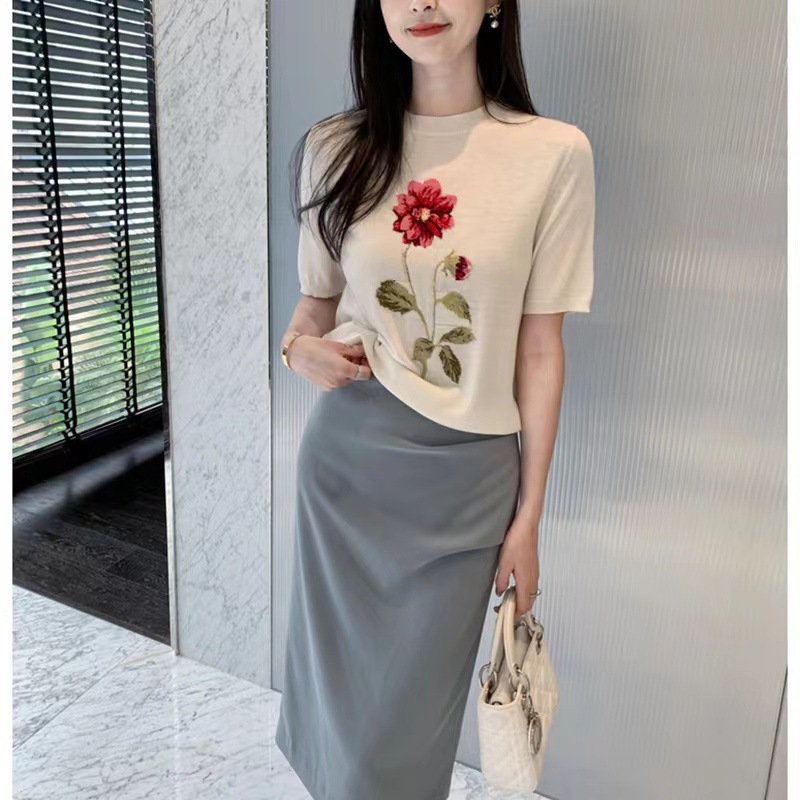 프랑스 스타일 세련된 샤넬 스타일 우아한 슬리밍 아이스 실크 니트 짧은 소매 어깨 티셔츠 여성용 쇼트 탑스토어 가기