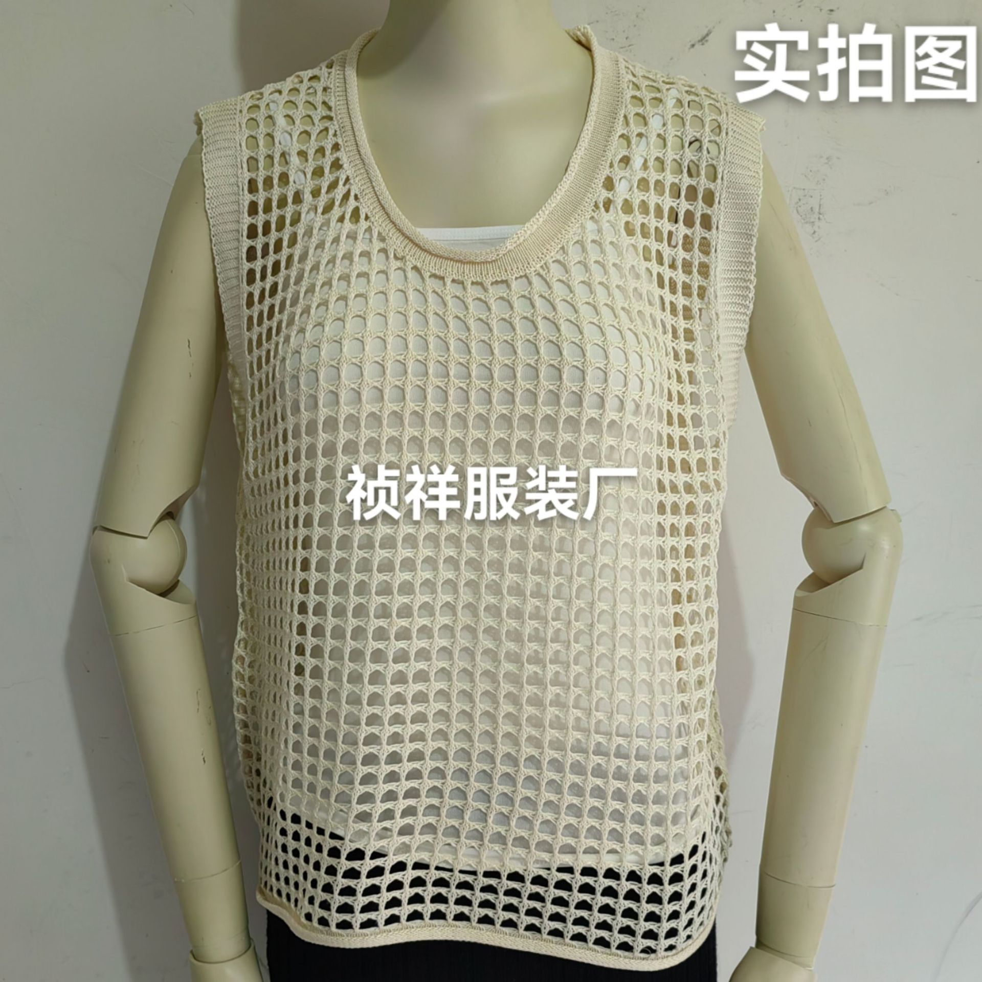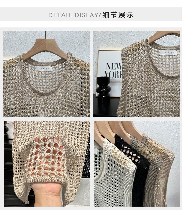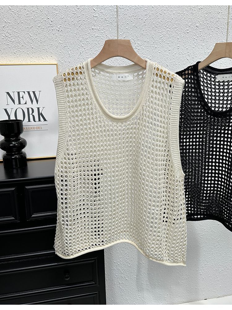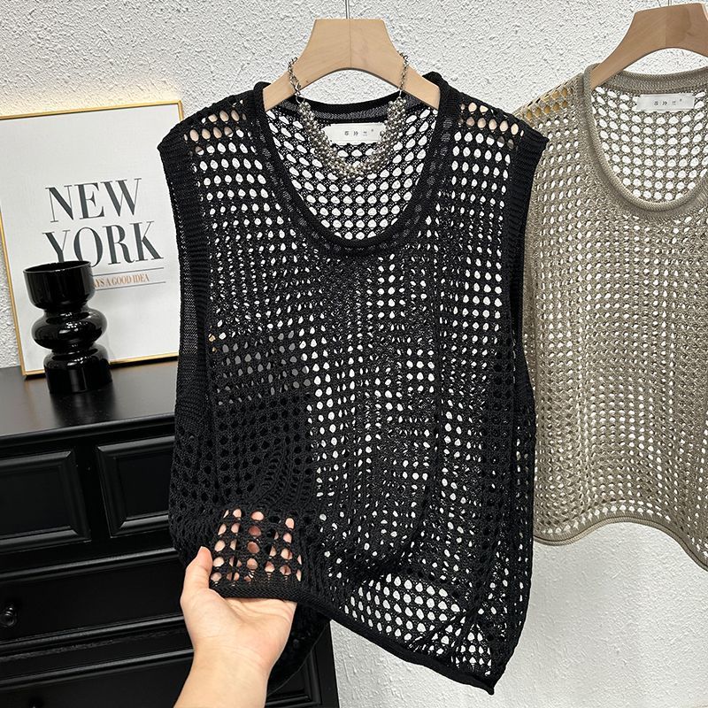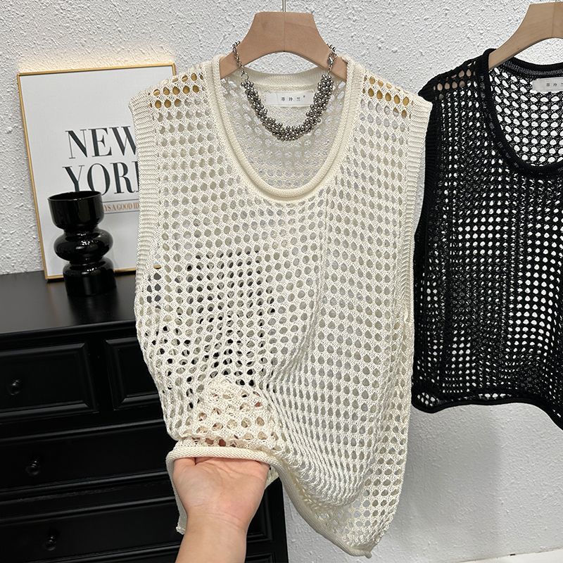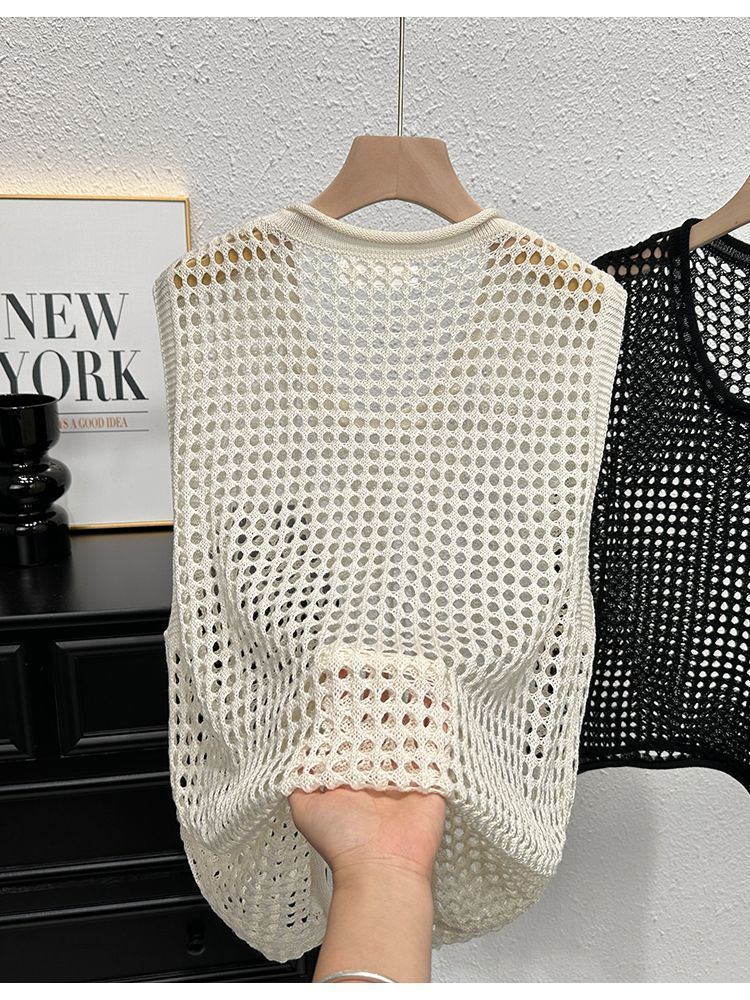 여름용 여성용 중공 니트 조끼, 얇고 다재다능한 루즈한 라운드 넥 레이어드 조끼, 여성용 민소매 핫걸 탑