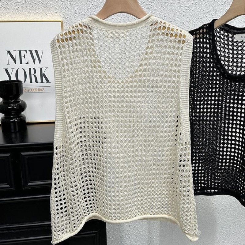 여름용 여성용 중공 니트 조끼, 얇고 다재다능한 루즈한 라운드 넥 레이어드 조끼, 여성용 민소매 핫걸 탑스토어 가기