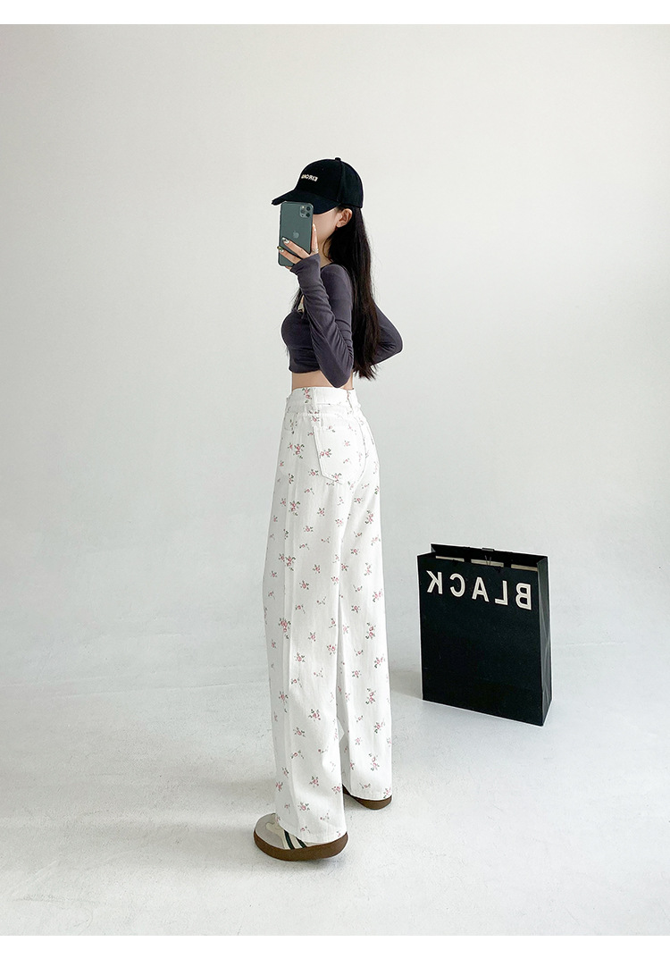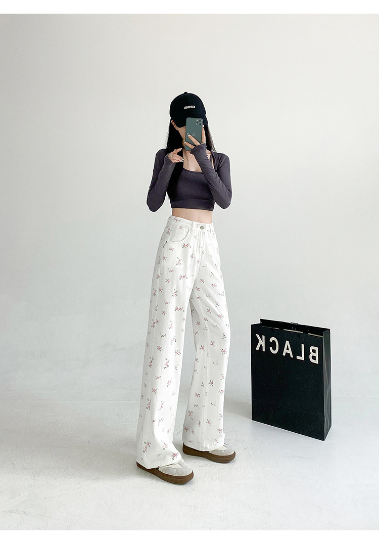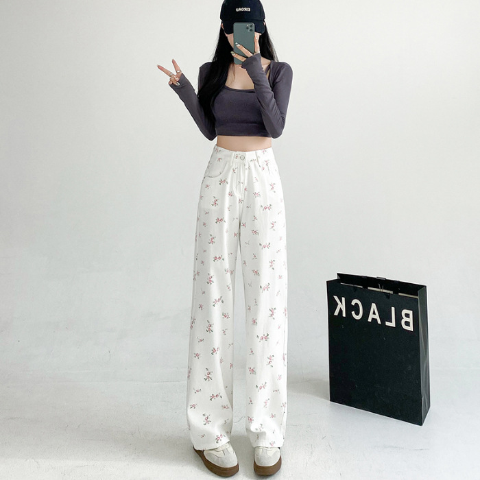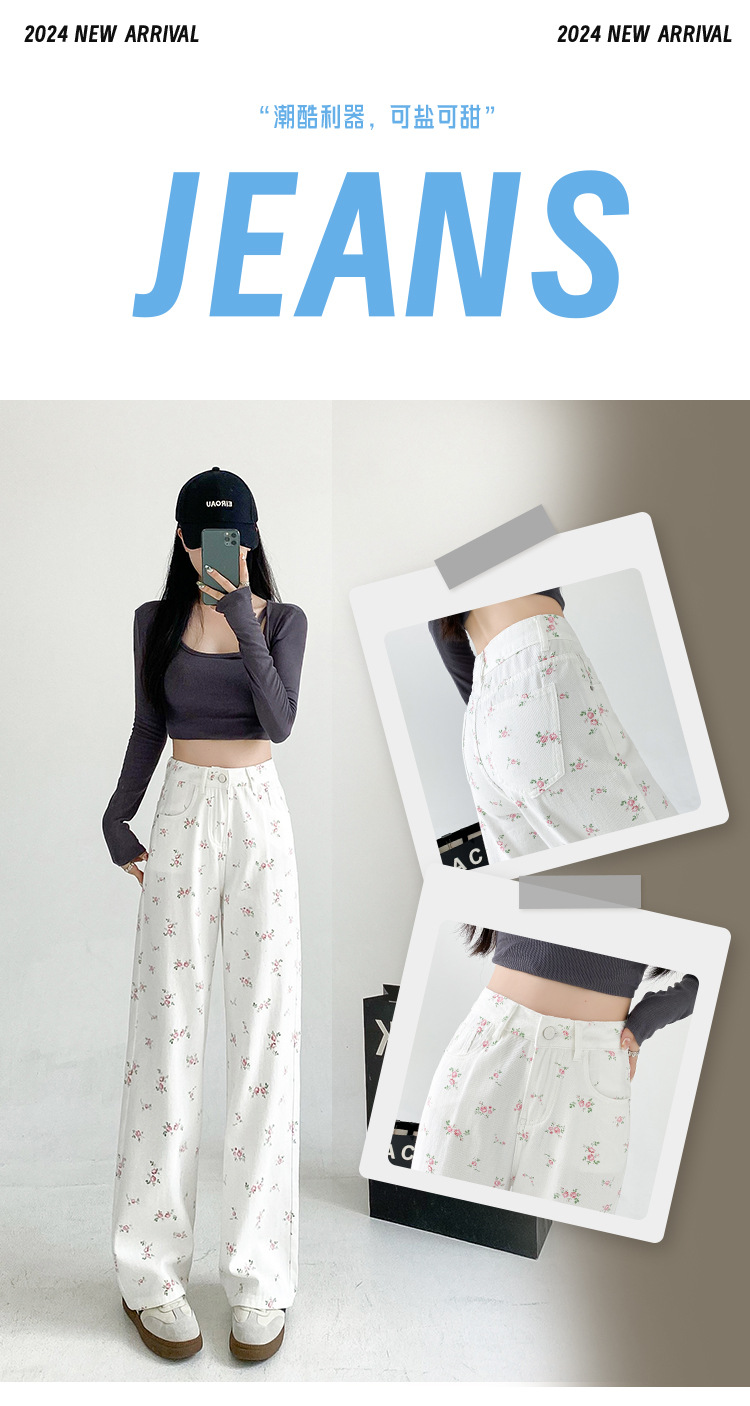 화이트 플로럴 패션 올 매치 스트레이트 청바지 여성의 2024 가을 새로운 높은 허리 슬리밍 넓은 다리 바지