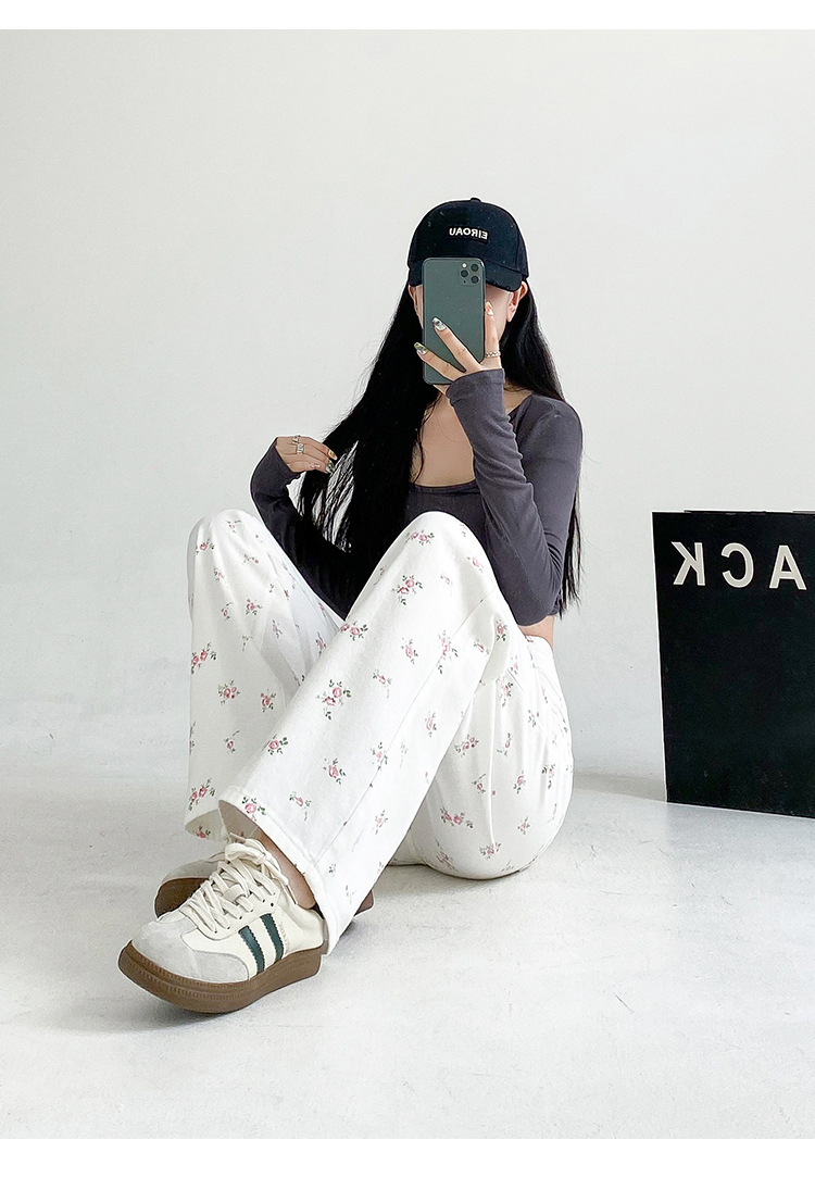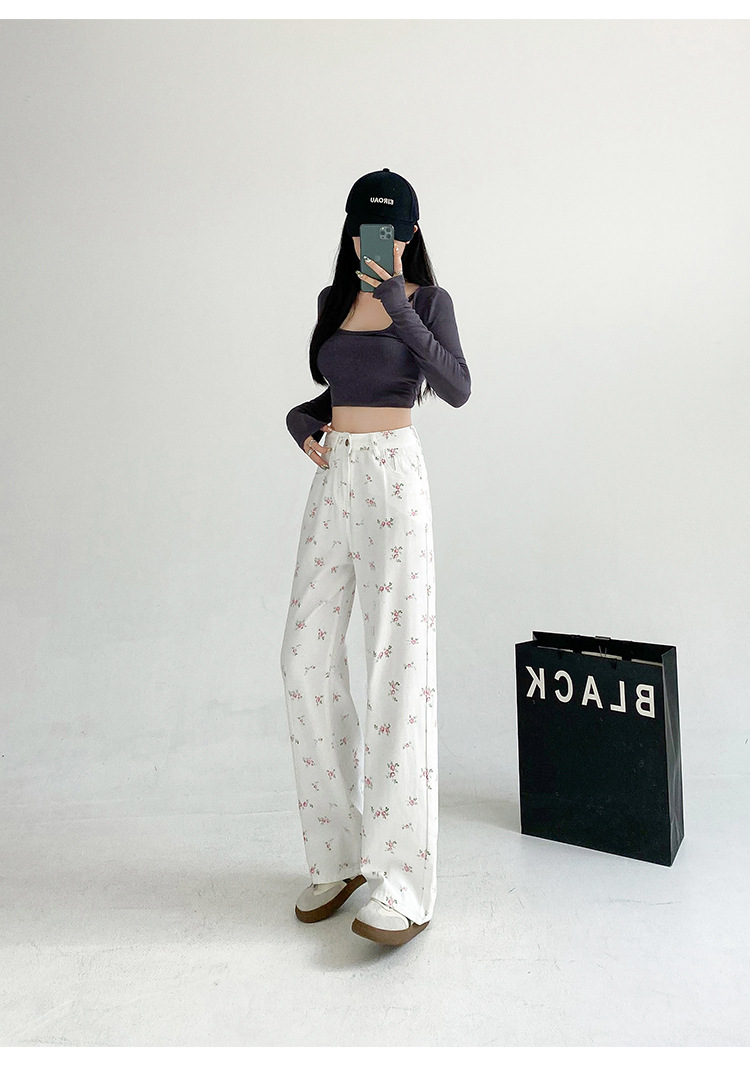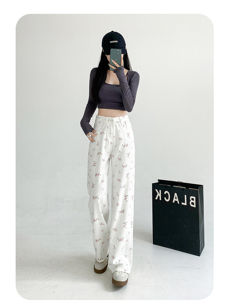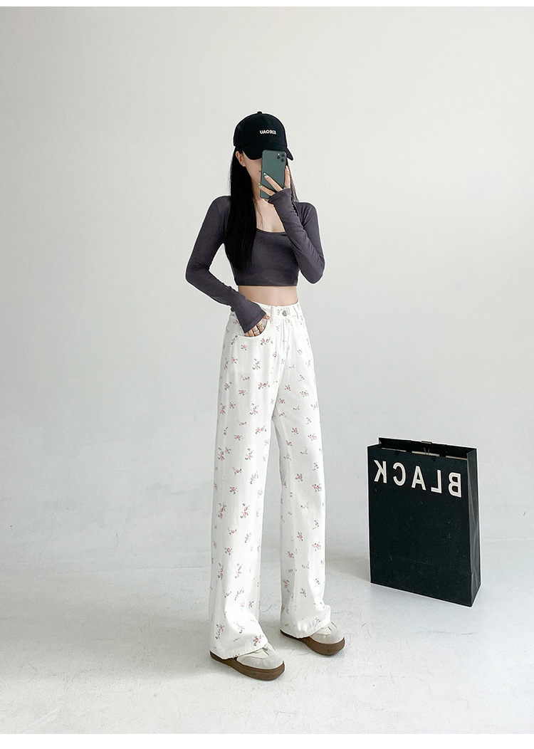화이트 플로럴 패션 올 매치 스트레이트 청바지 여성의 2024 가을 새로운 높은 허리 슬리밍 넓은 다리 바지
