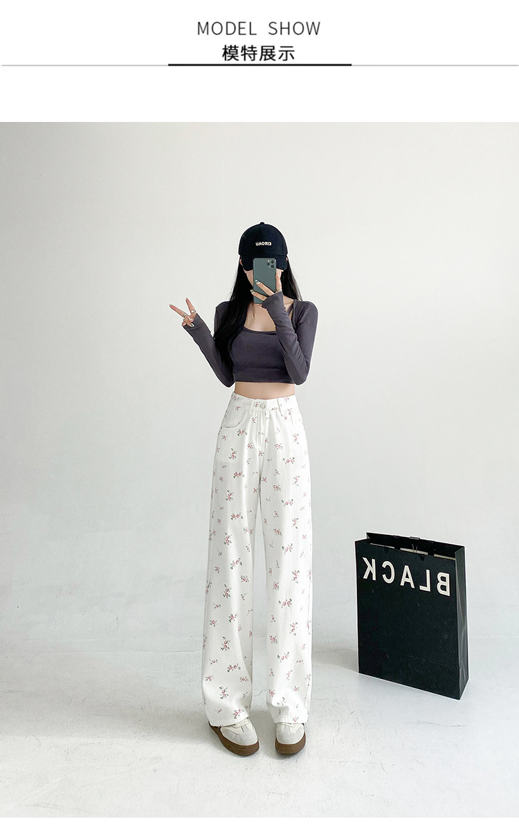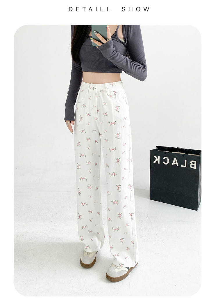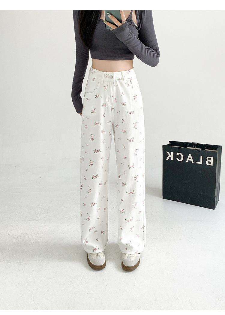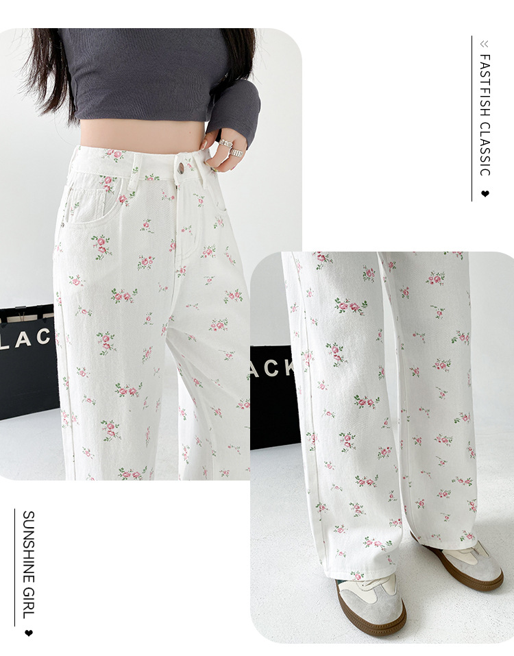화이트 플로럴 패션 올 매치 스트레이트 청바지 여성의 2024 가을 새로운 높은 허리 슬리밍 넓은 다리 바지스토어 가기