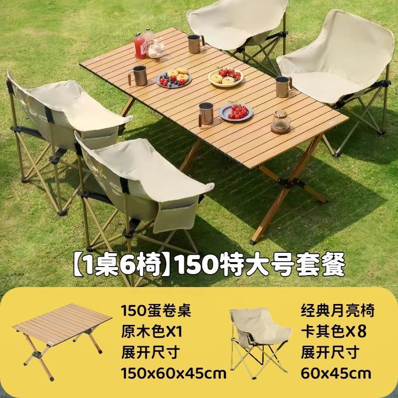 • [클래식 우드 컬러] 고탄소강 합금 접이식 테이블-[테이블 1개, 의자 4개] 150cm 에그롤 테이블 + 달의자*8
