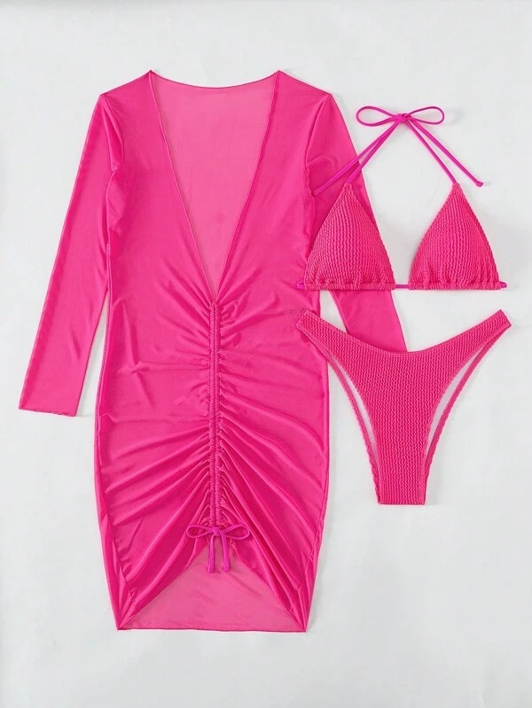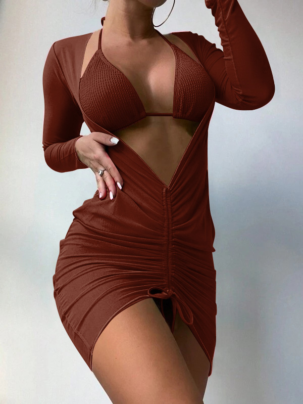 2025 새로운 솔리드 컬러 비키니 섹시 드로우 스트링 수영복 3 조각 국경 아마존 타이트 슬림 수영복 여성