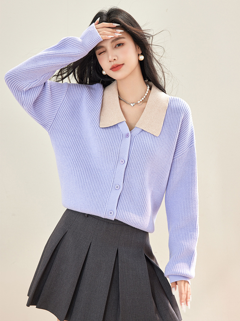 부드러운 스타일 느슨한 대조 컬러 옷깃 니트 스웨터 카디건 여성의 2024 가을 및 겨울 스웨터 코트 부드러운 스타일 외부 탑스토어 가기
