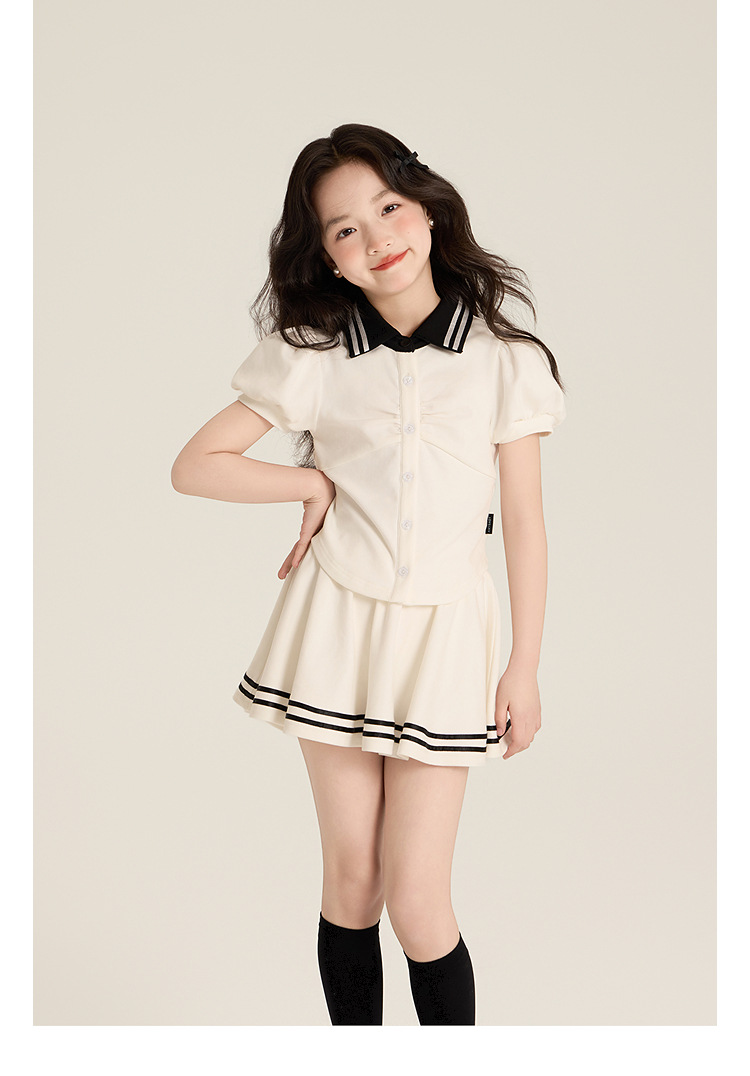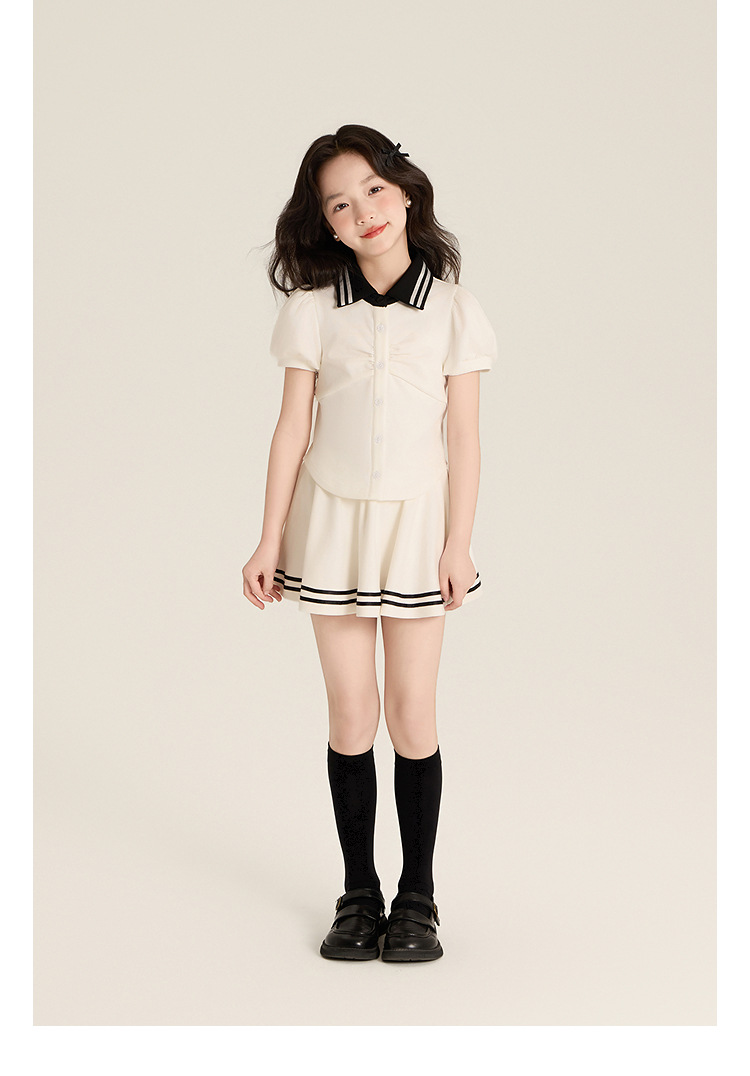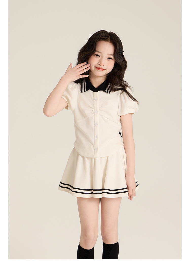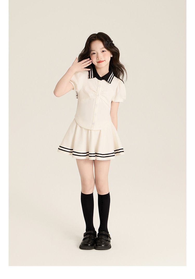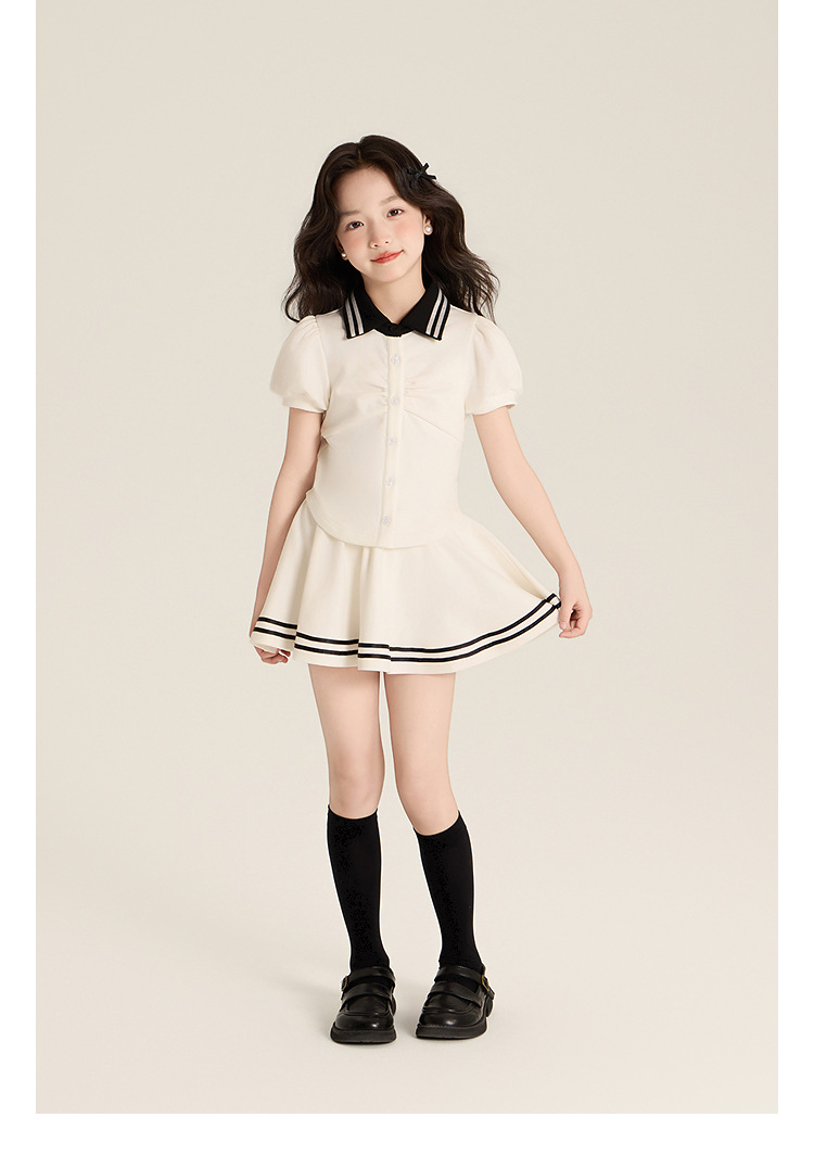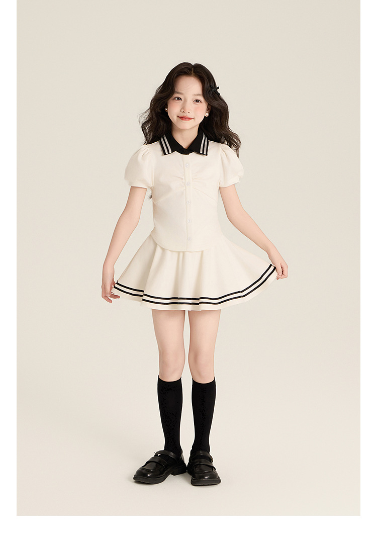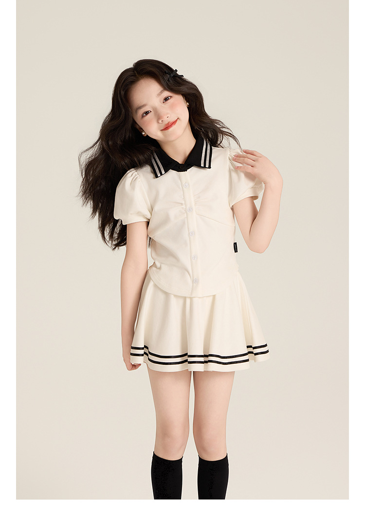 Amybaby Girls 세트 여름 2025 새로운 대비 색상 슬리밍 허리 짧은 소매 톱 스트라이프 스커트