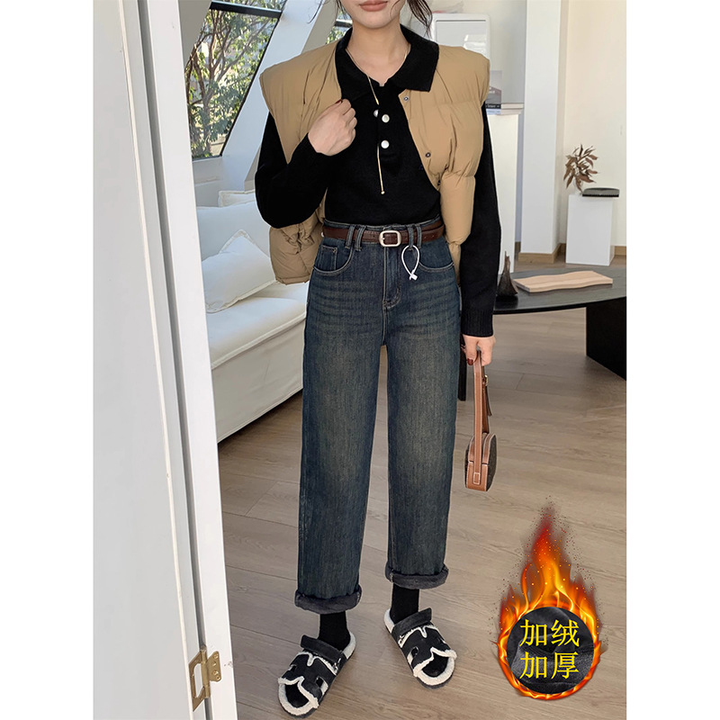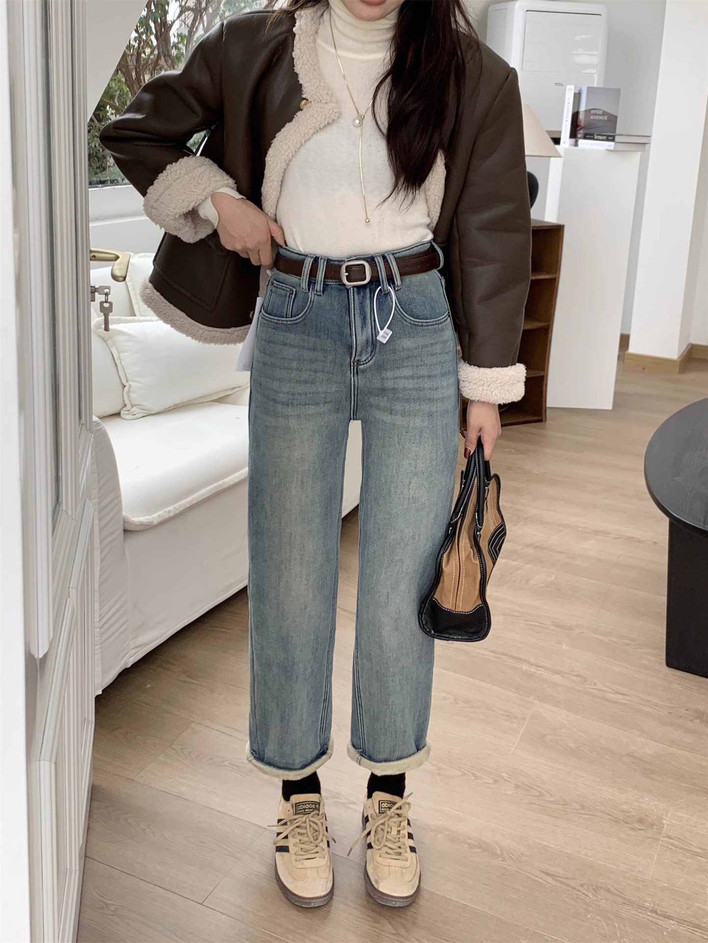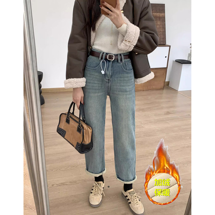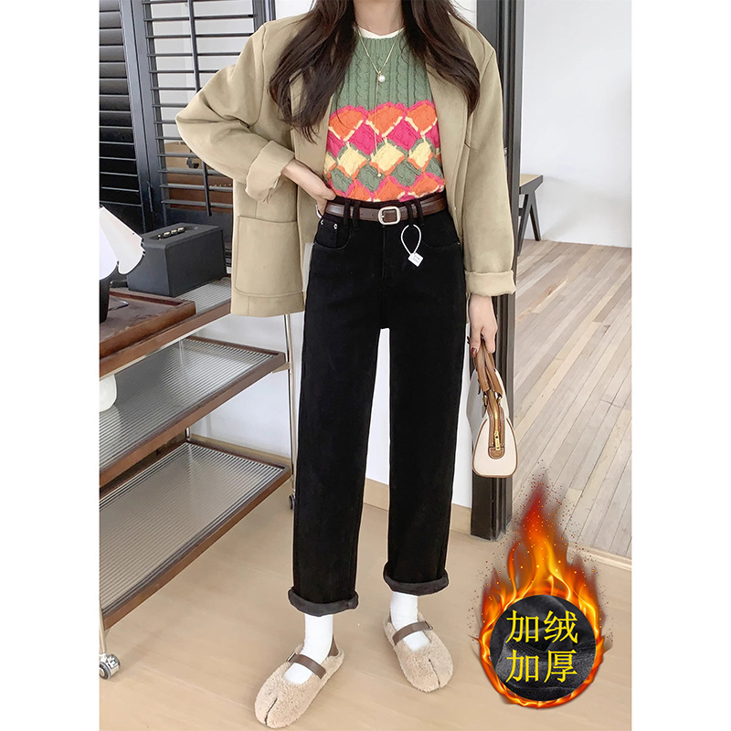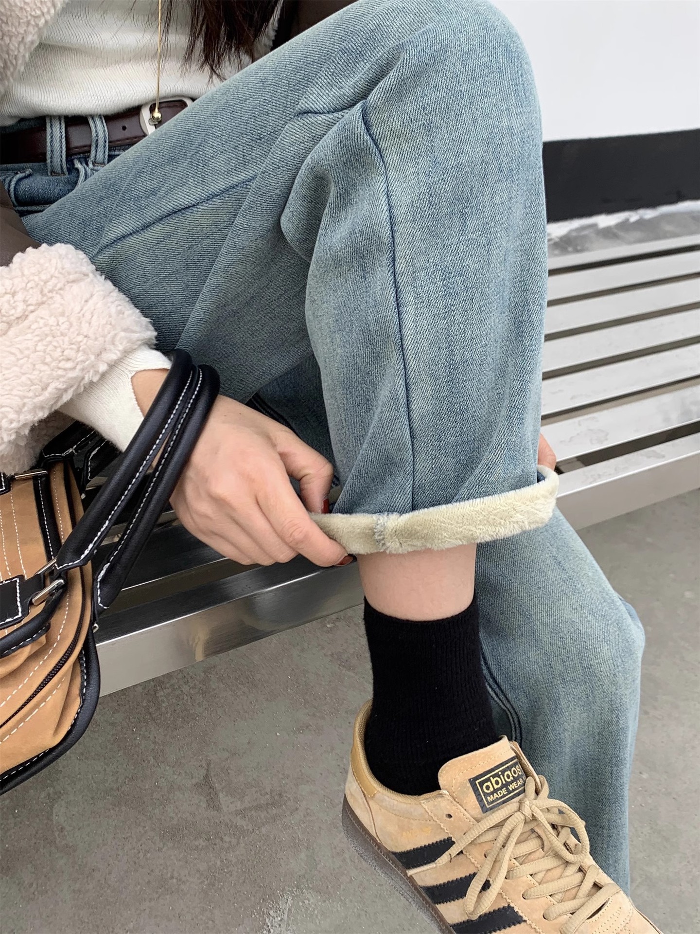 안티 시즌 라이트 기모 두꺼운 청바지 여자 2024 겨울 높은 허리 스트레치 할란 무 데님 남자 친구 바지스토어 가기