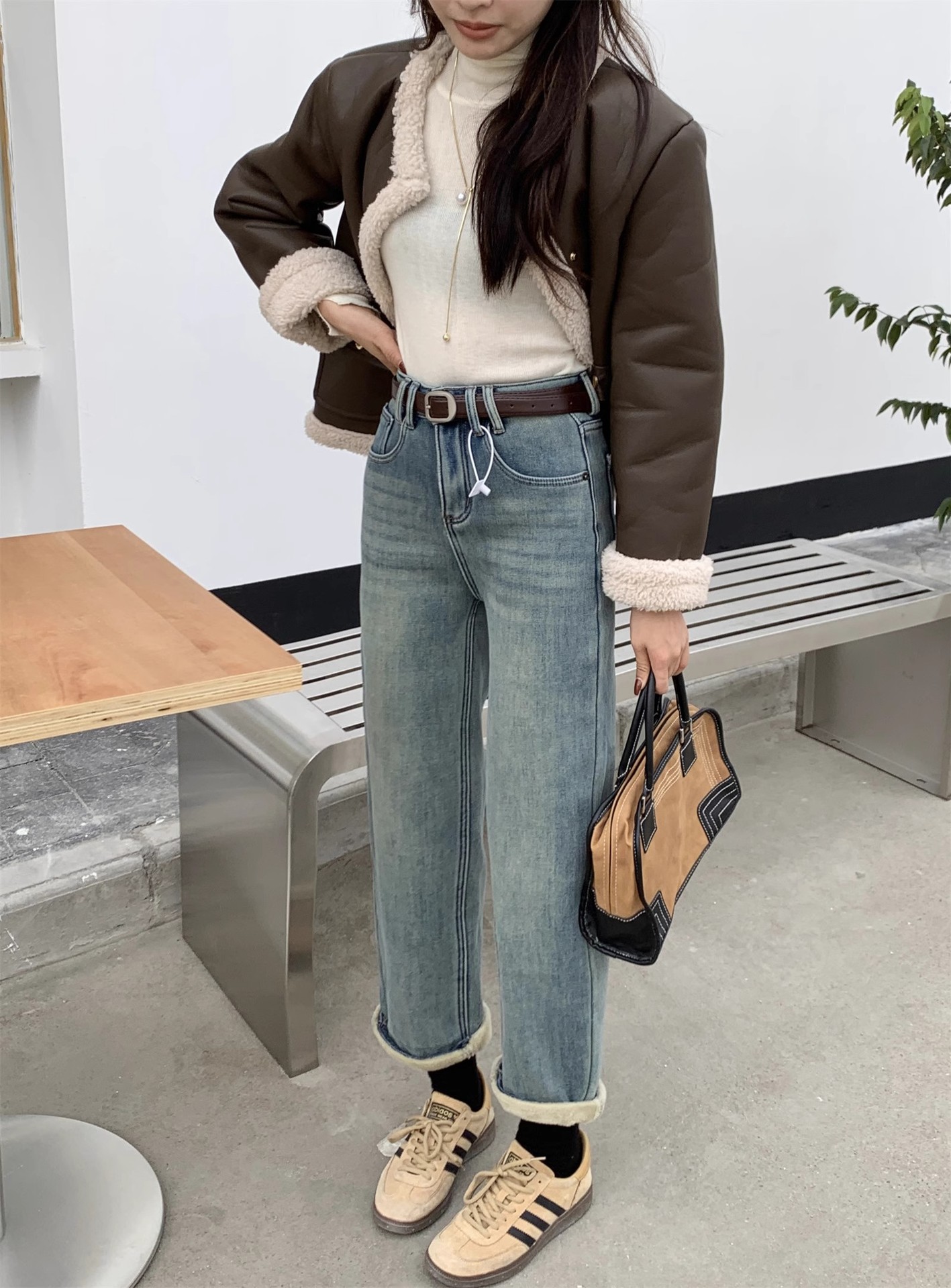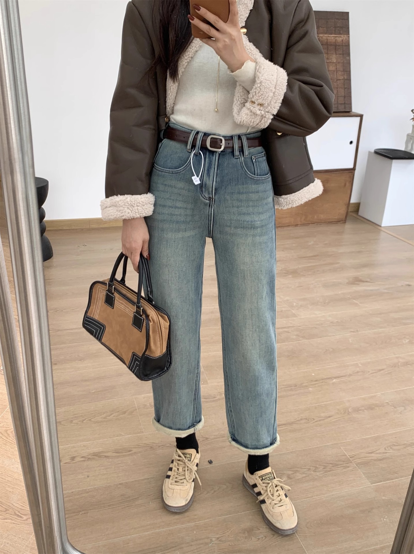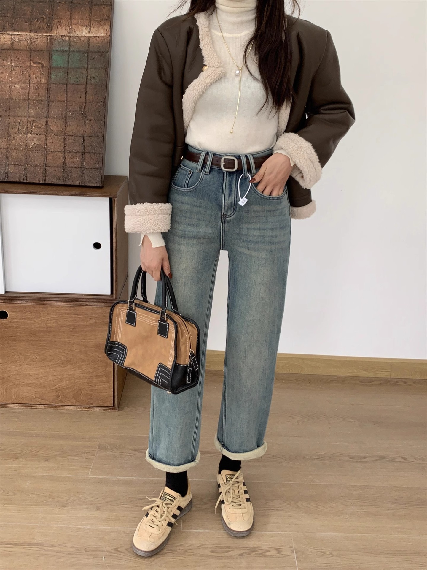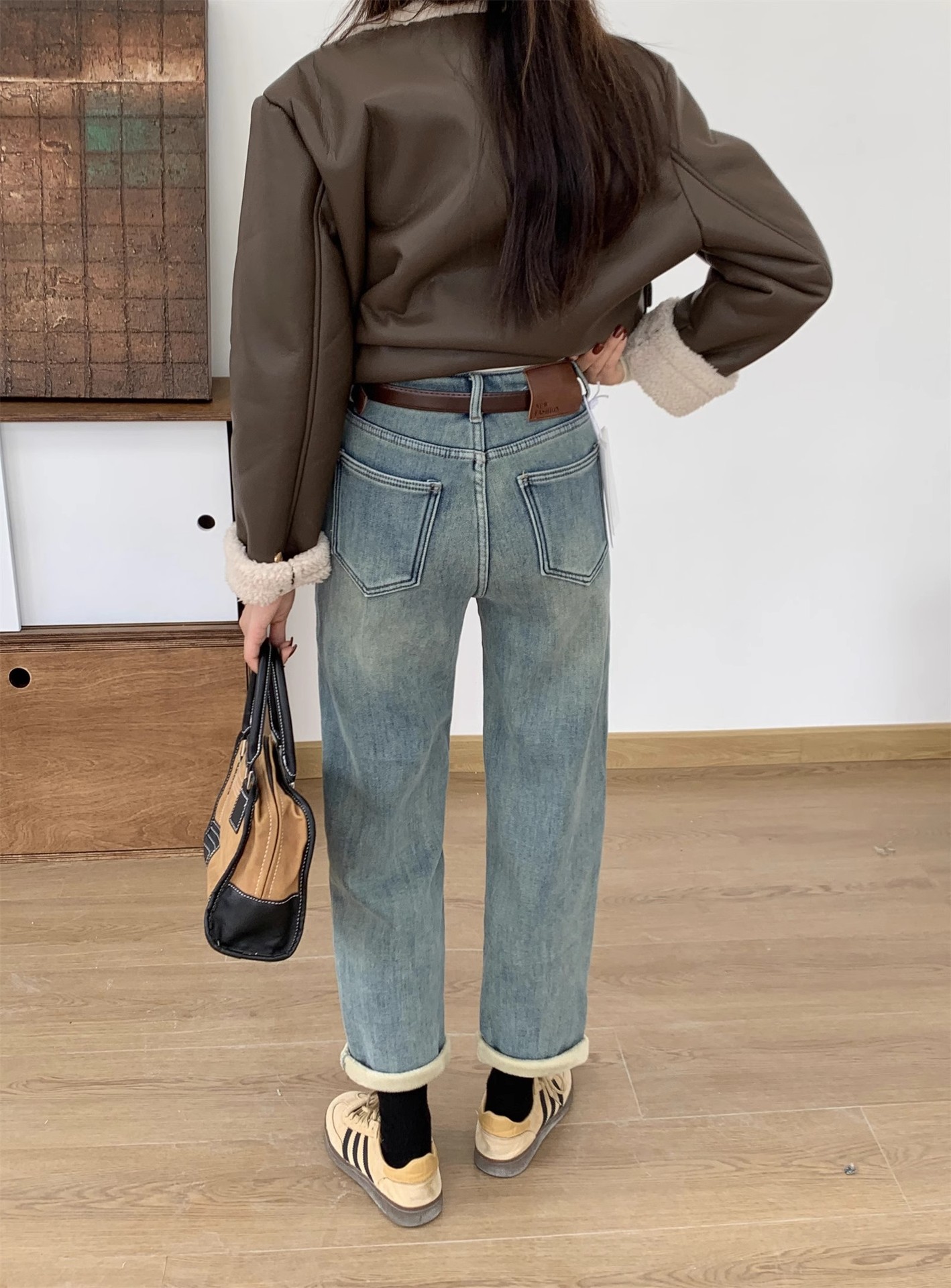 안티 시즌 라이트 기모 두꺼운 청바지 여자 2024 겨울 높은 허리 스트레치 할란 무 데님 남자 친구 바지스토어 가기