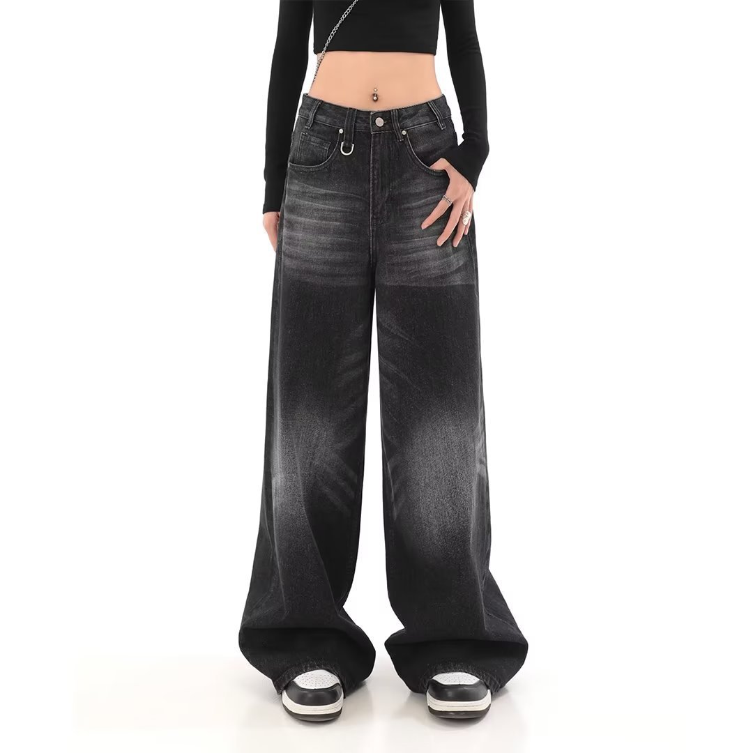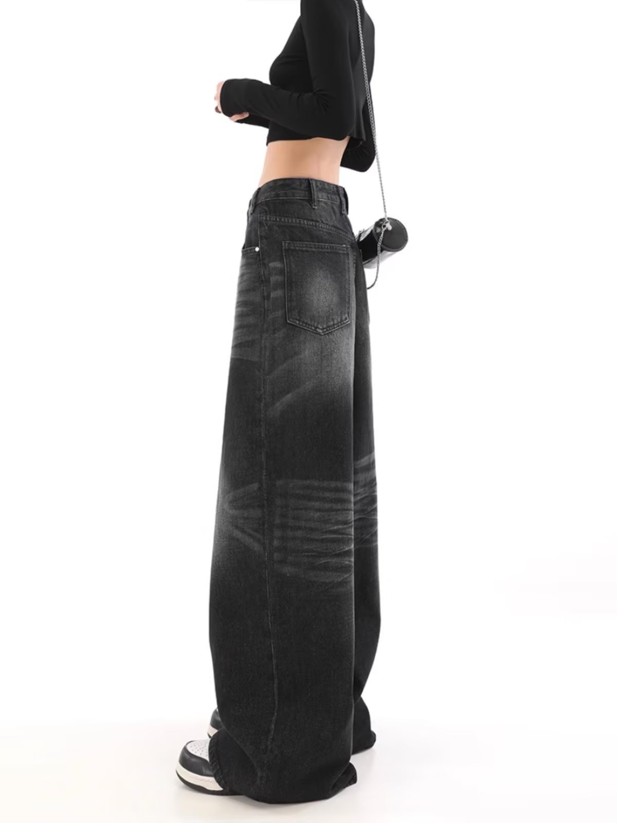 复古水洗做旧黑色阔腿牛仔裤女秋季新款高腰宽松直筒拖地长裤子潮