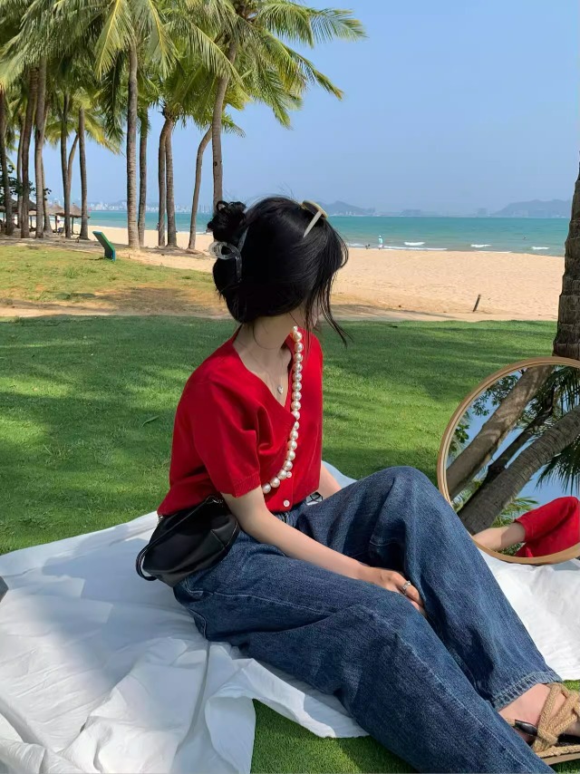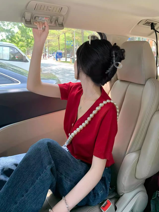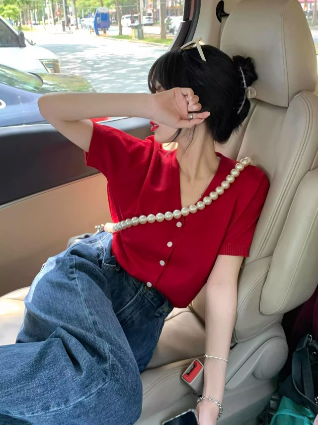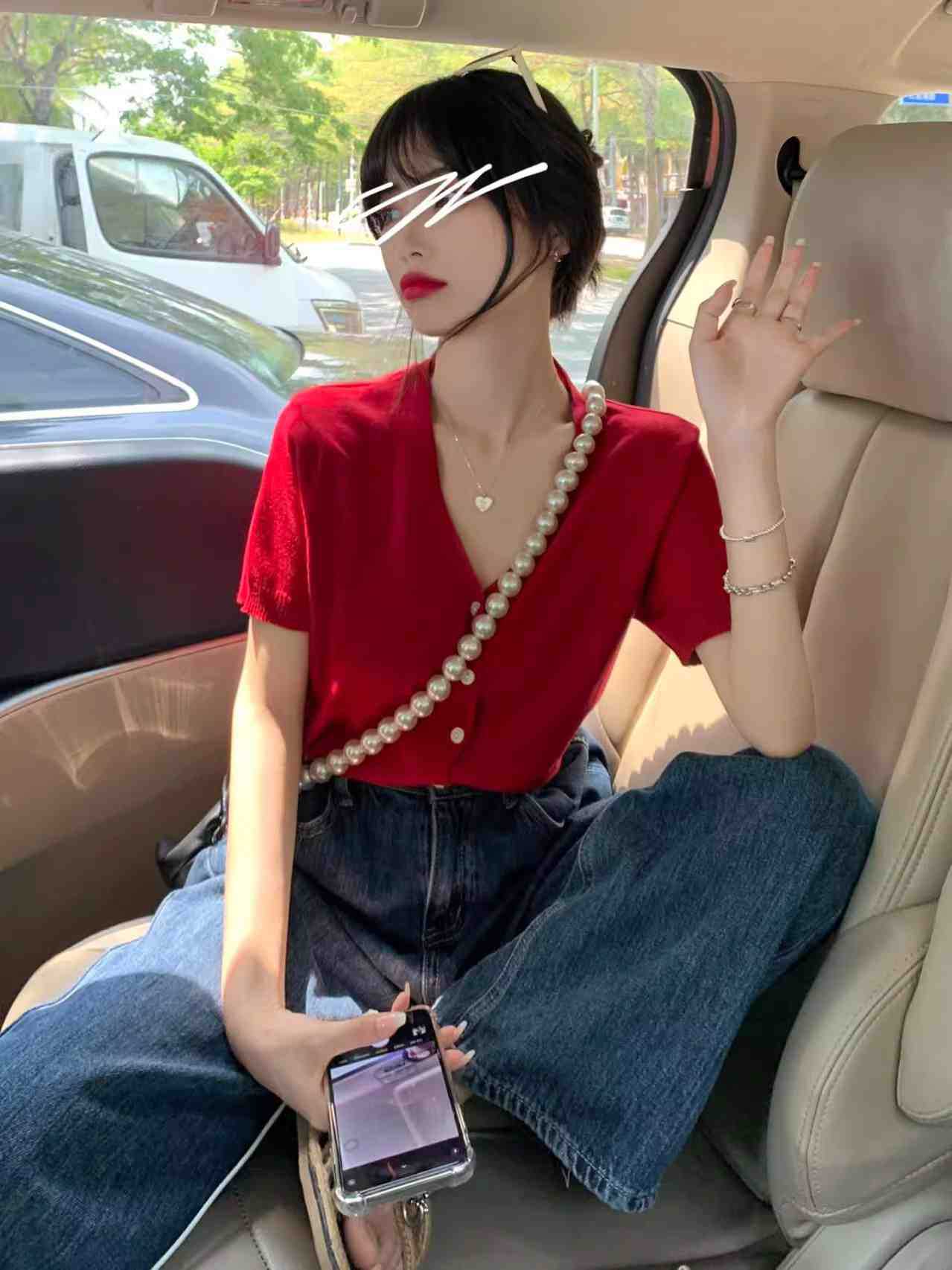 샤넬 스타일 레드 아이스 실크 니트 카디건 반팔 티셔츠 여성 여름 독특한 세련된 아름다운 디자인 센스 V 넥 탑