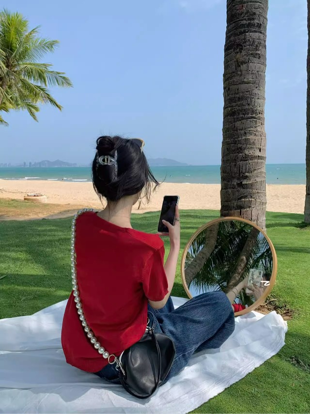 샤넬 스타일 레드 아이스 실크 니트 카디건 반팔 티셔츠 여성 여름 독특한 세련된 아름다운 디자인 센스 V 넥 탑스토어 가기