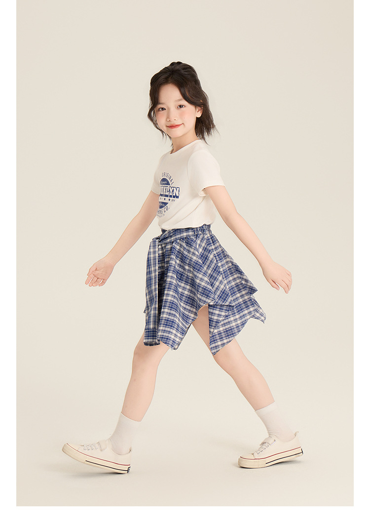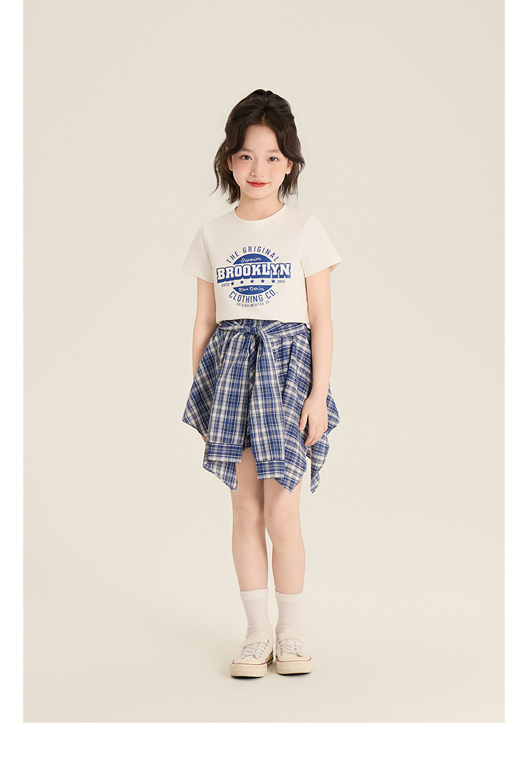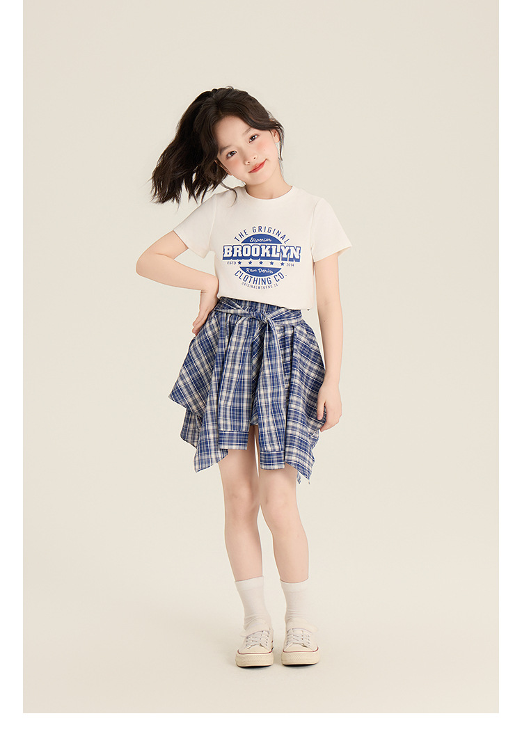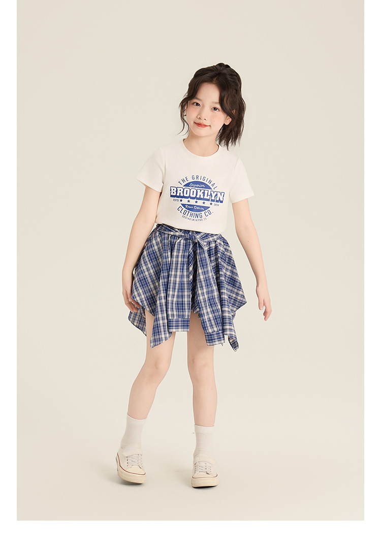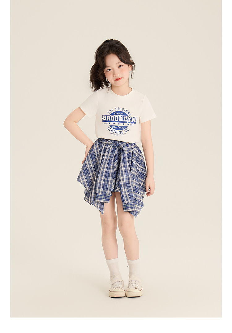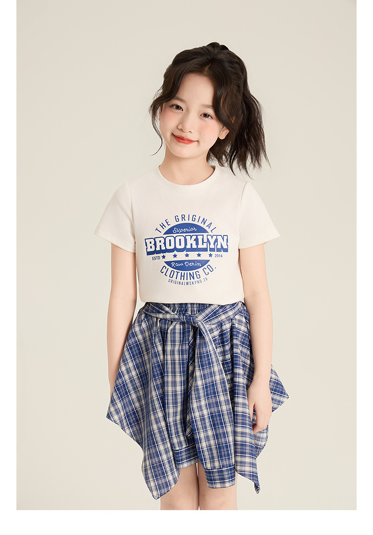 Amybaby 소녀 세트 여름 2025 새로운 둥근 목 편지 T 불규칙한 디자인 격자 무늬 스커트