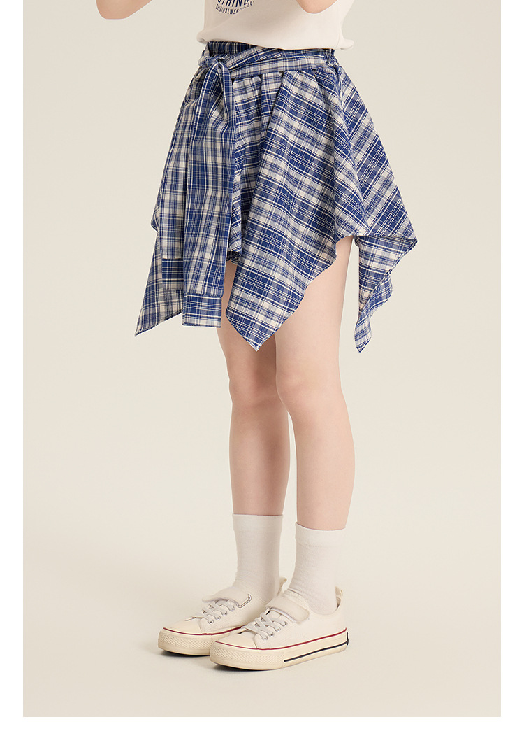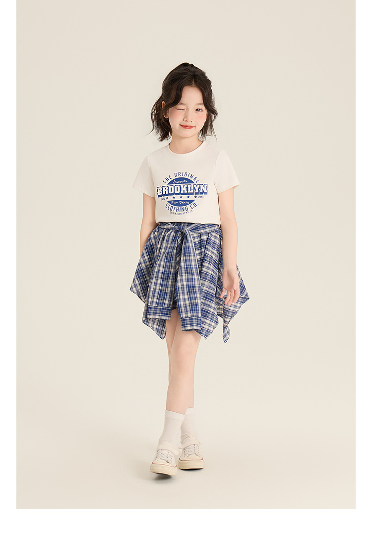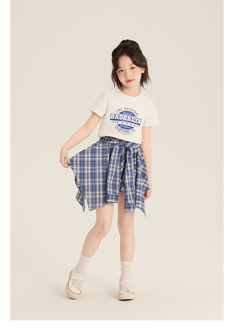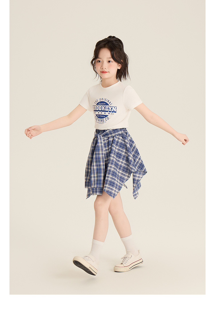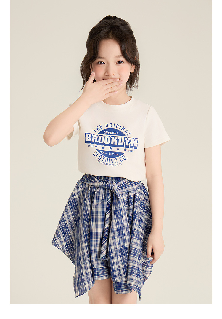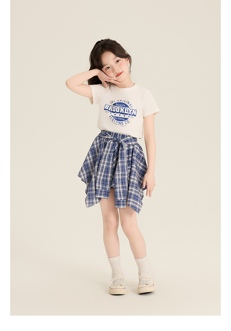 Amybaby 소녀 세트 여름 2025 새로운 둥근 목 편지 T 불규칙한 디자인 격자 무늬 스커트