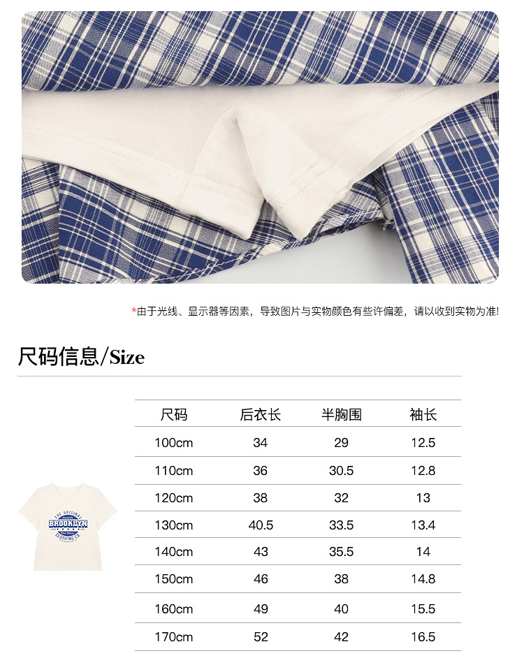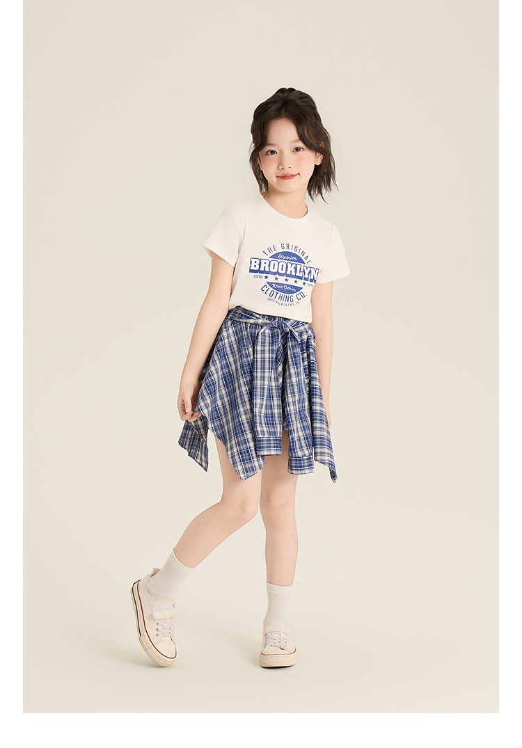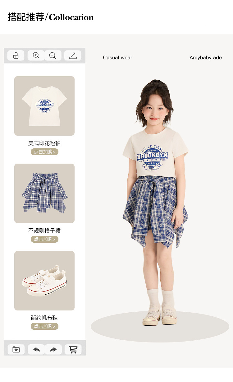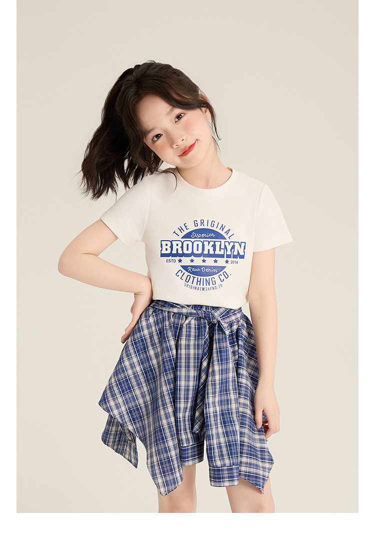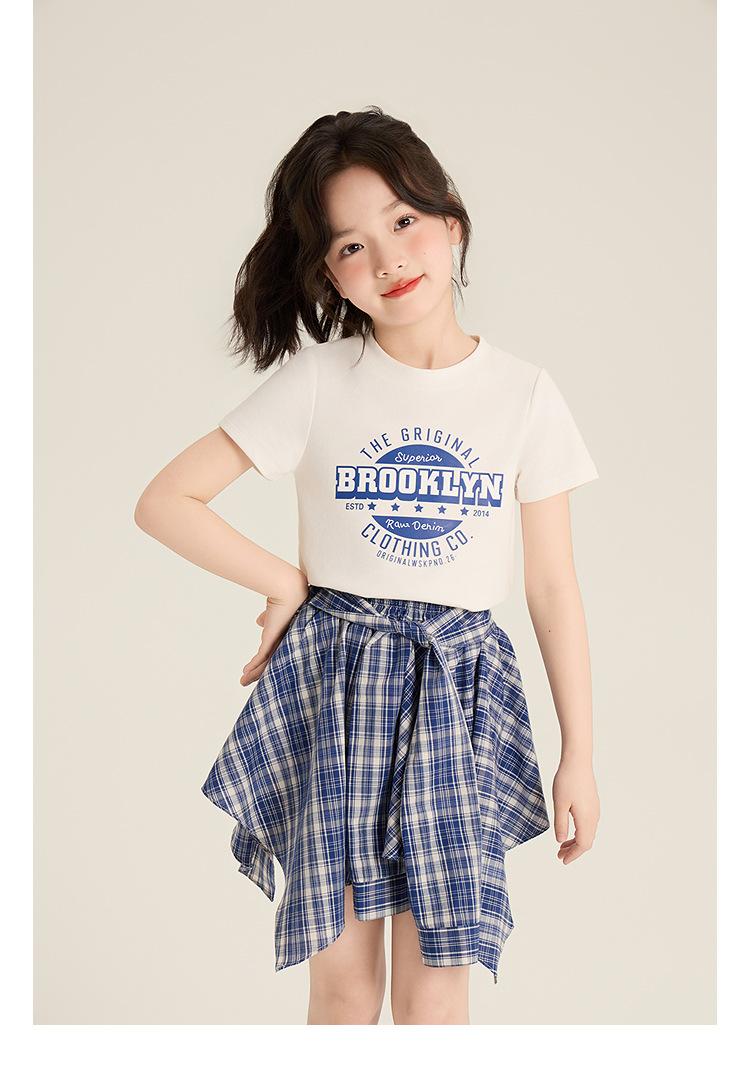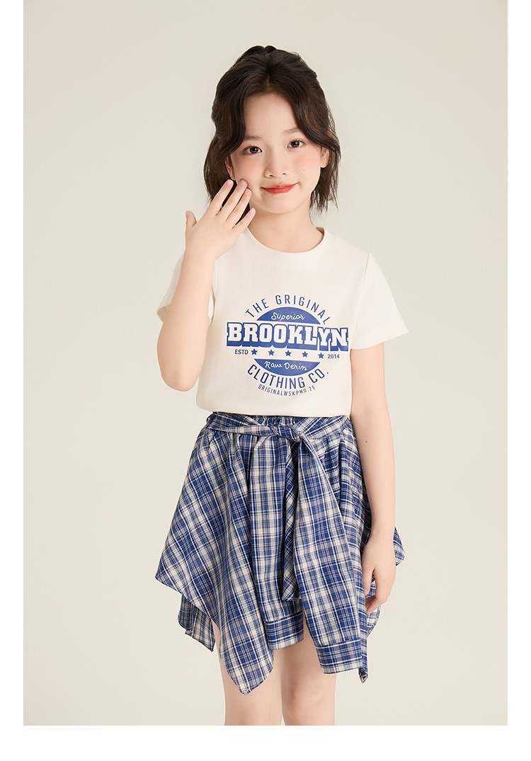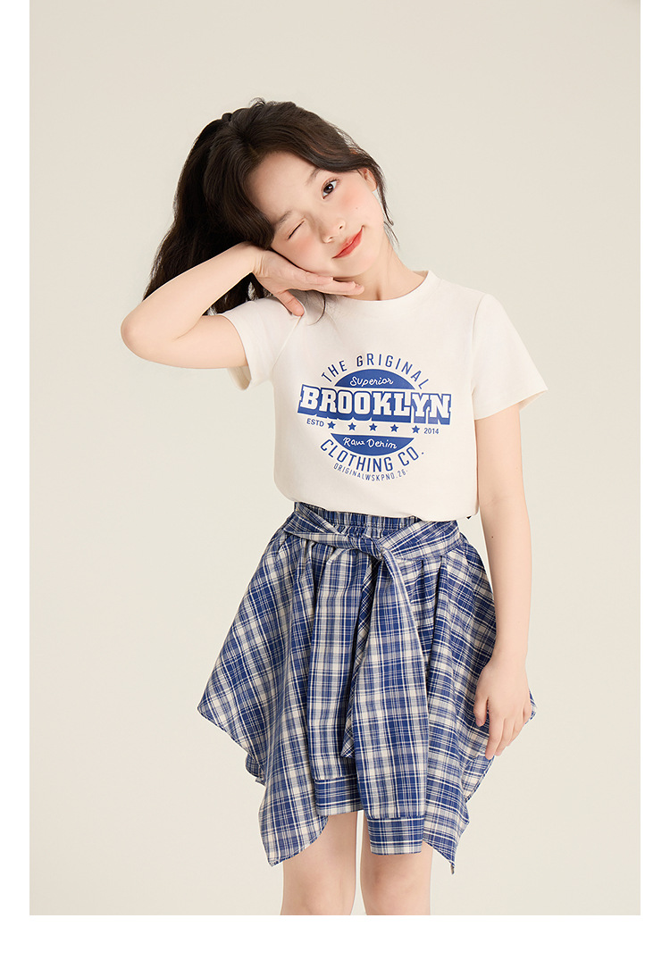 Amybaby 소녀 세트 여름 2025 새로운 둥근 목 편지 T 불규칙한 디자인 격자 무늬 스커트스토어 가기