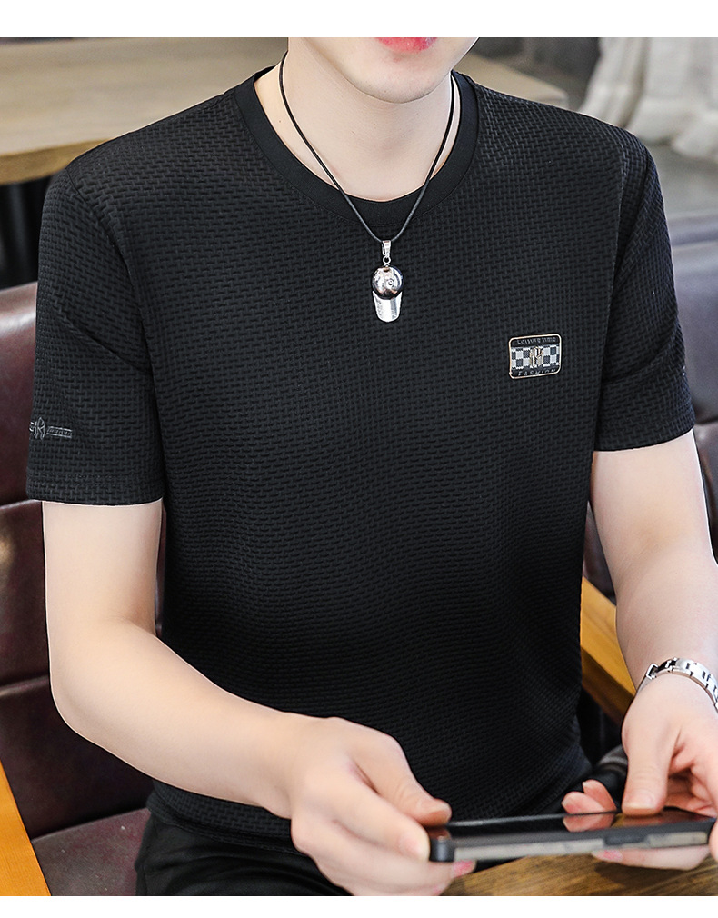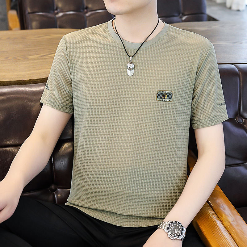 남성용 아이스 실크 빠른 건조 반팔 티셔츠 라운드 넥 여름 유행 청소년 반소매 아이스 감지 티셔츠 체크 무늬스토어 가기