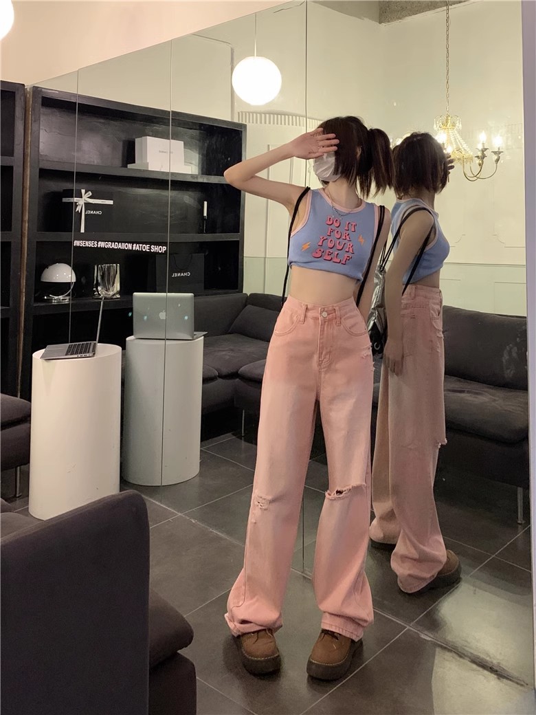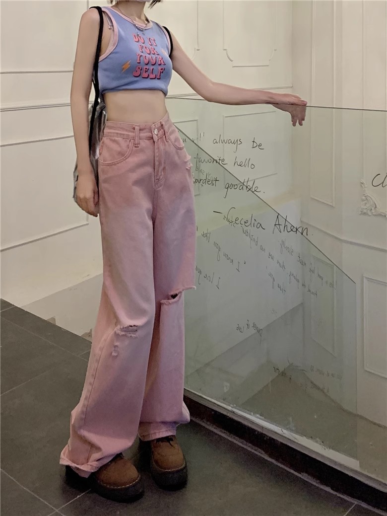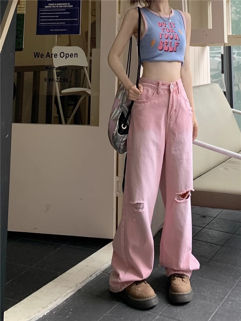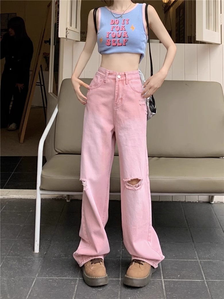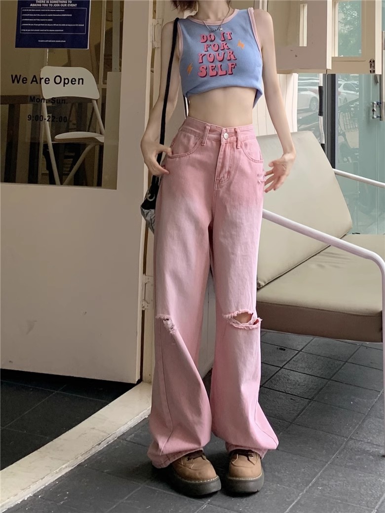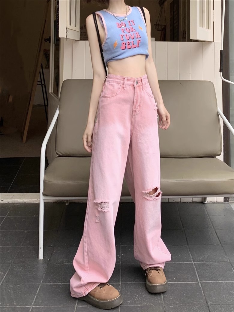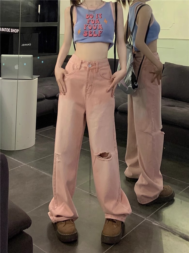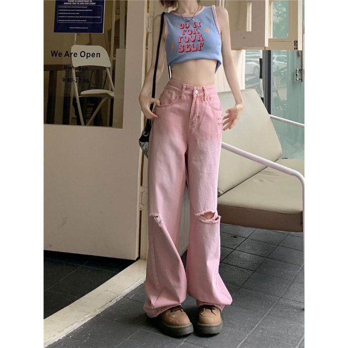 핑크색 하이웨이스트 스트레이트 데미지 진 여성용 2025 여름 신상 루즈핏 슬림 와이드 레그 롱 팬츠스토어 가기