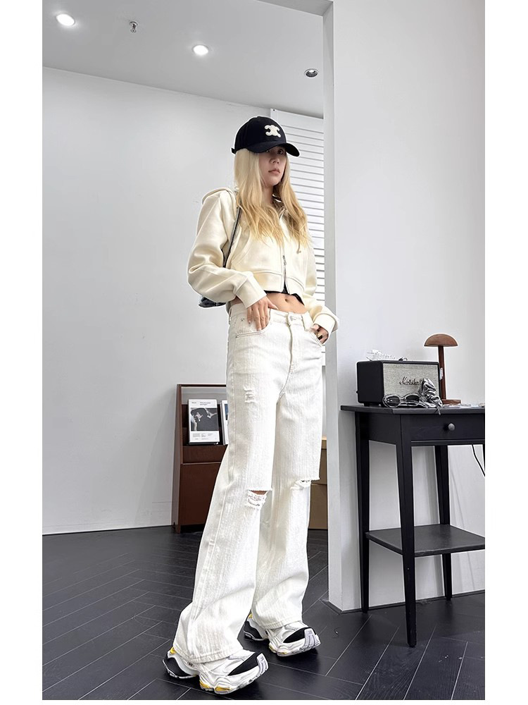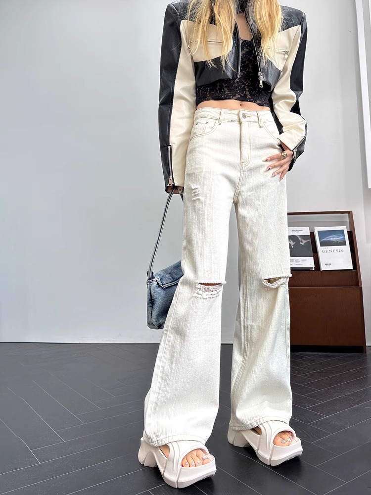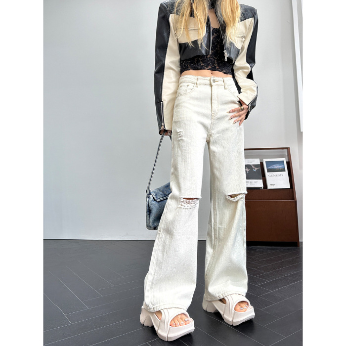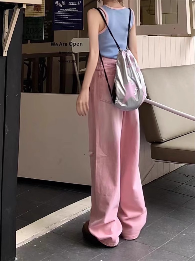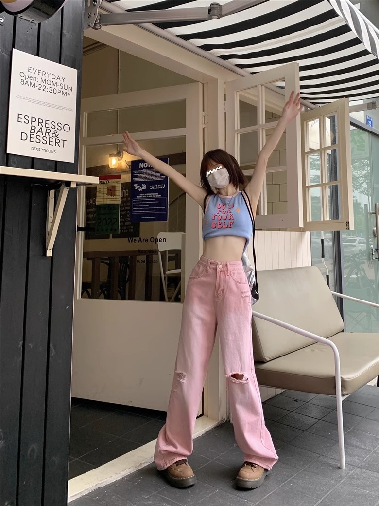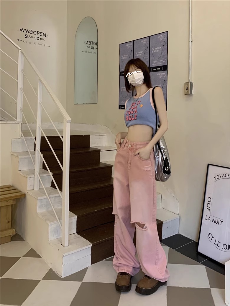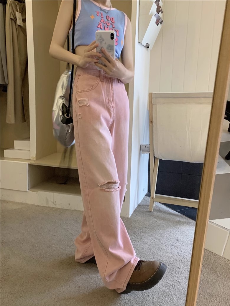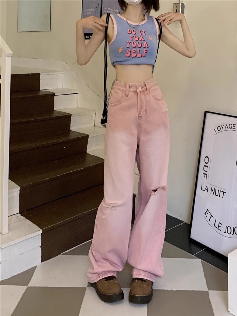 핑크색 하이웨이스트 스트레이트 데미지 진 여성용 2025 여름 신상 루즈핏 슬림 와이드 레그 롱 팬츠스토어 가기