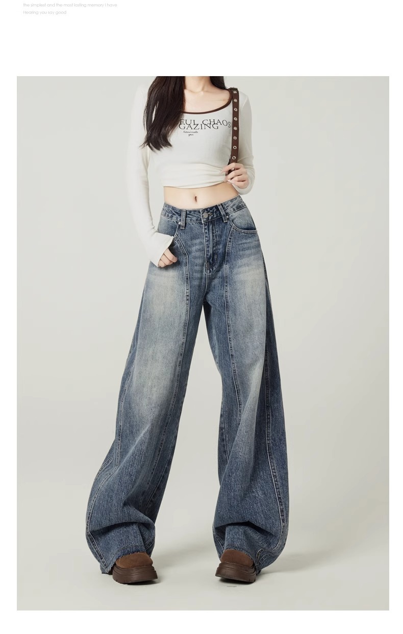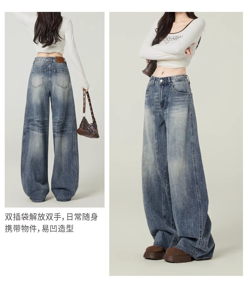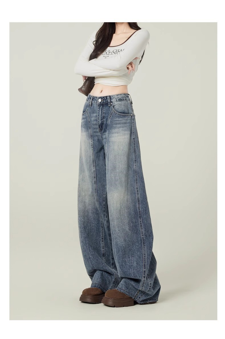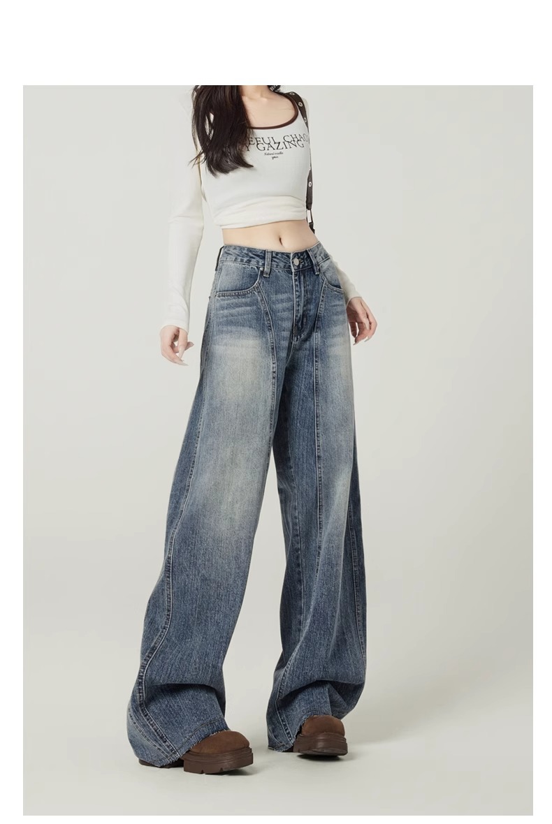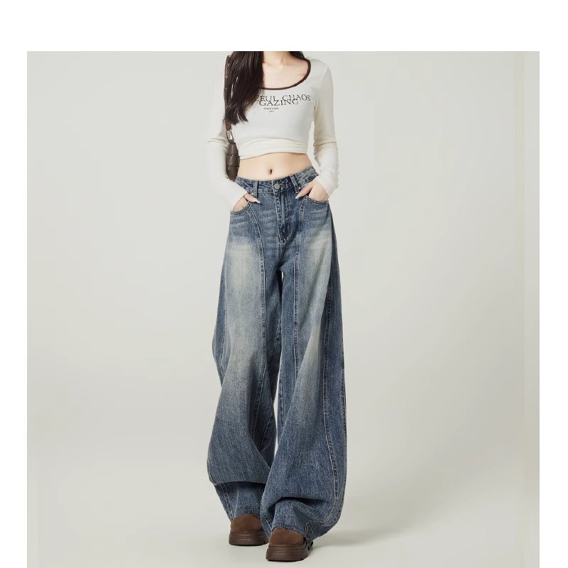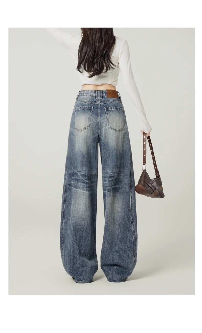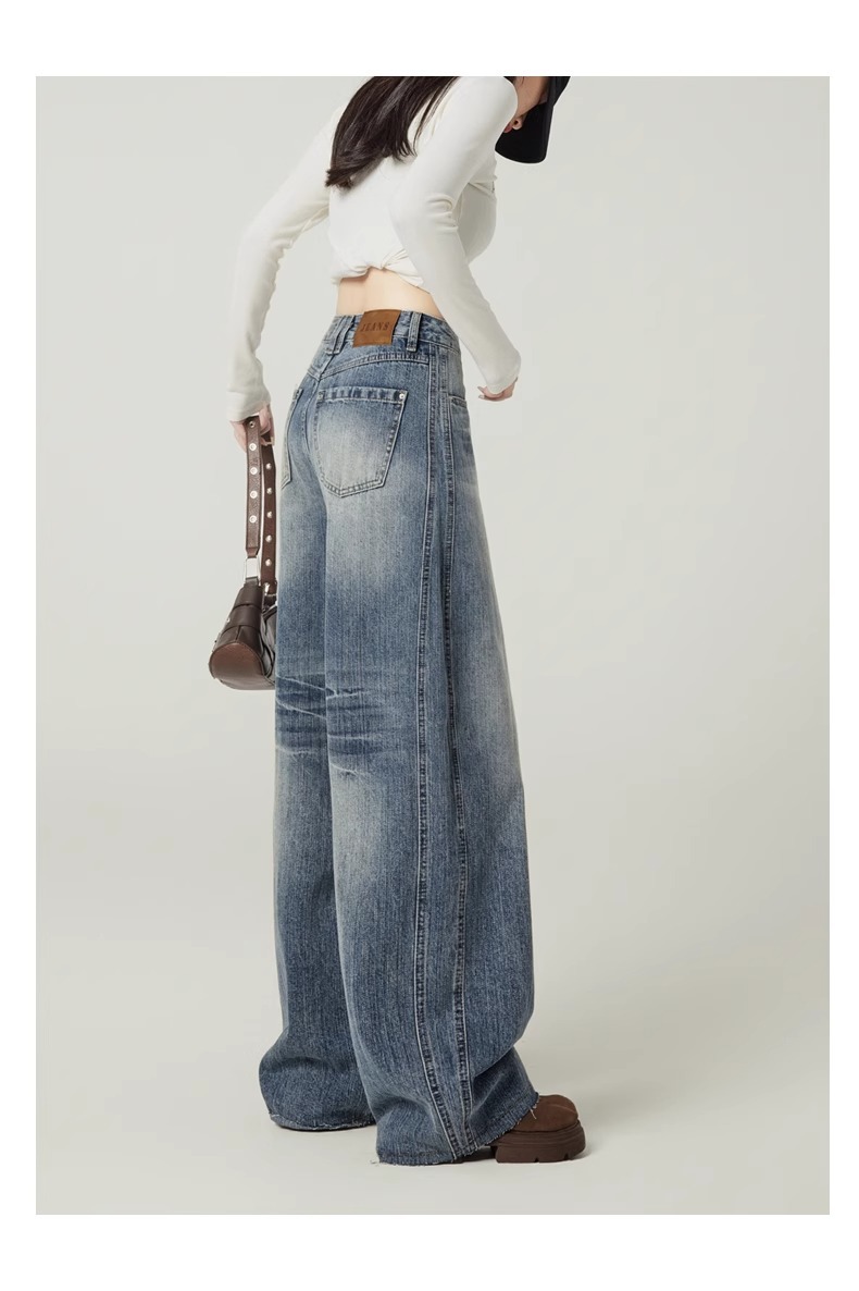 빈티지 블루 하이 스트리트 루즈 와이드 레그 청바지 여성용 트렌디 올 매치 아메리칸 스타일 디자인 센스 하이 허리 데프 센스 마체테 바지스토어 가기