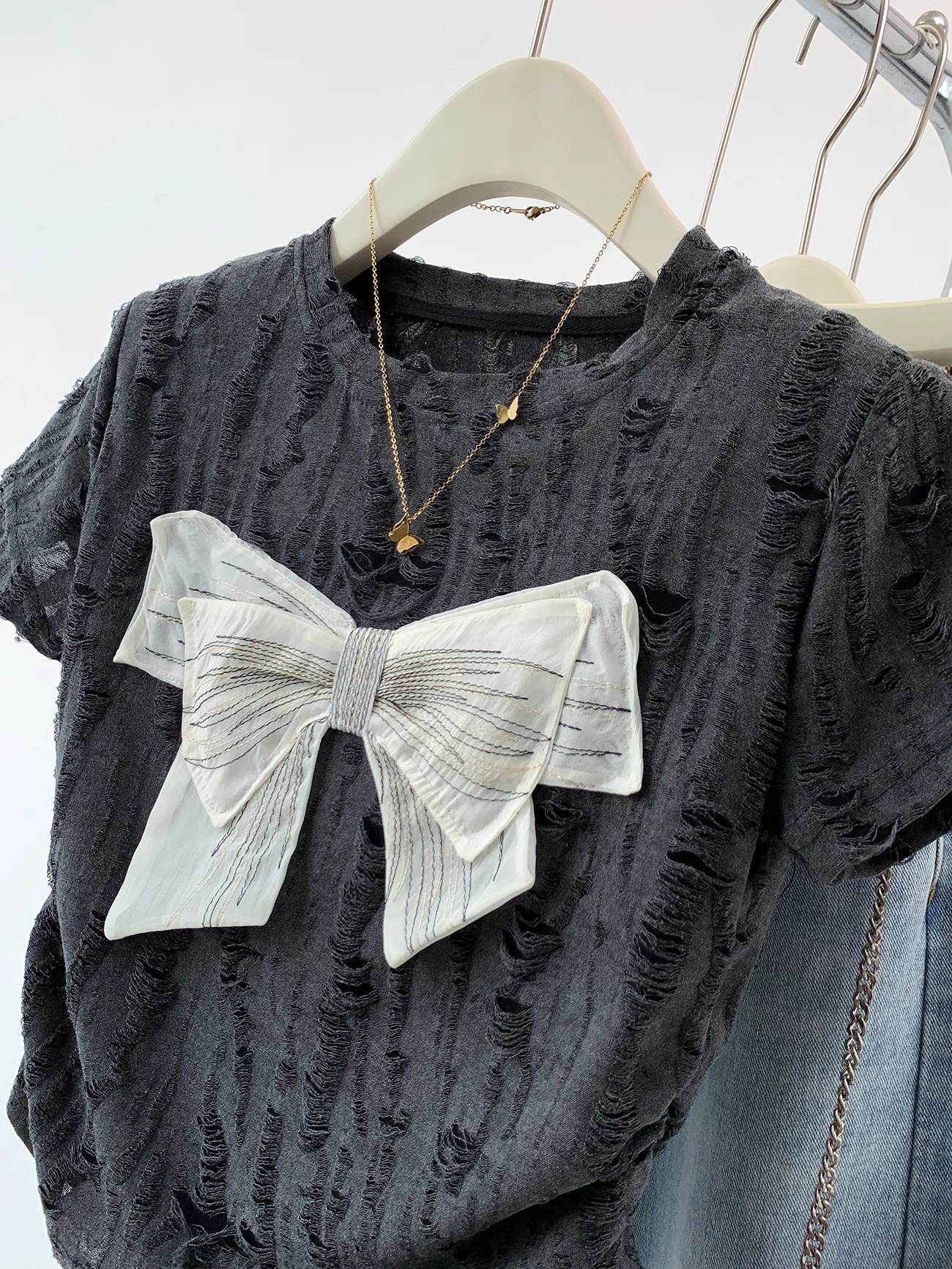 활 회색 어깨 반팔 티셔츠 여성 여름 2025 새로운 디자인 센스 니쉬 짧은 슬림 핏 탑스토어 가기