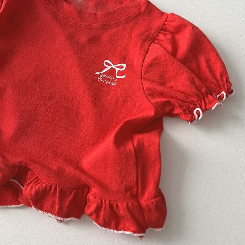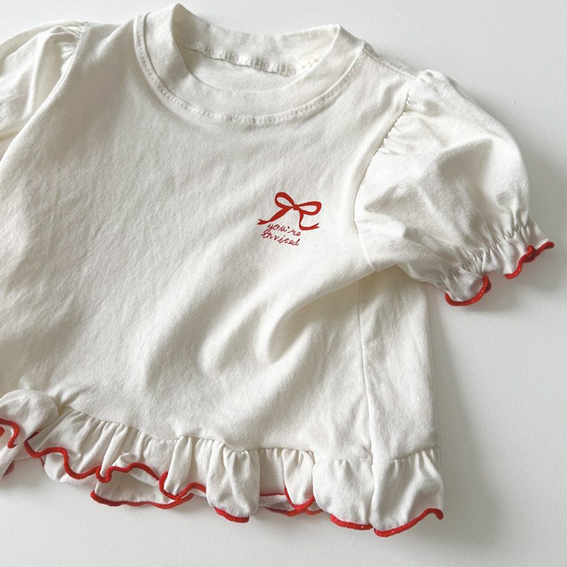 여름 새로운 소녀 활 편지 인쇄 둥근 목 귀여운 짧은 소매 티셔츠 탑 퍼프 슬리브 레이스 셔츠스토어 가기