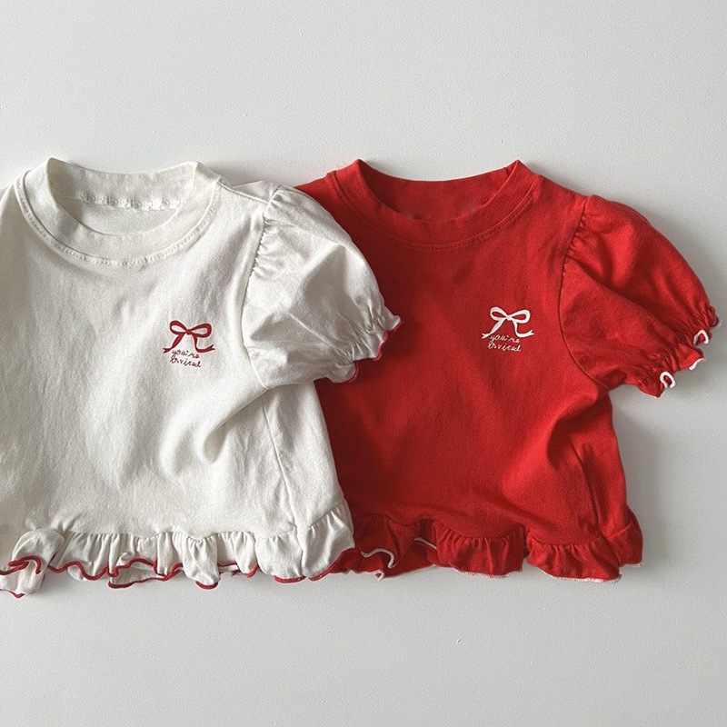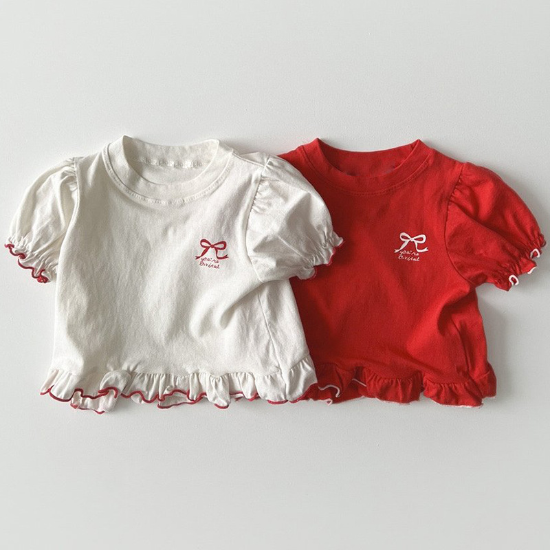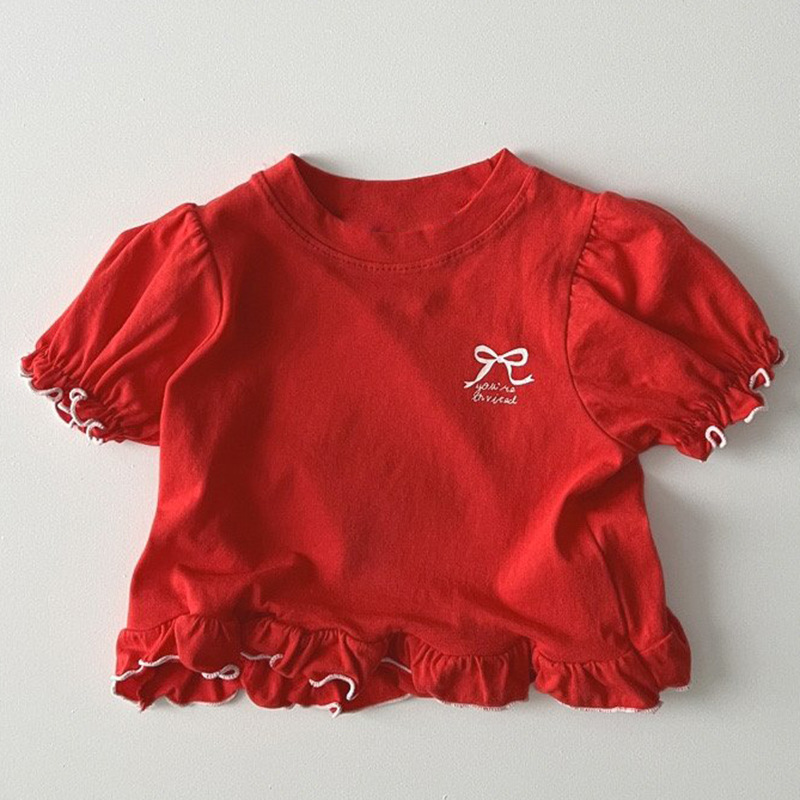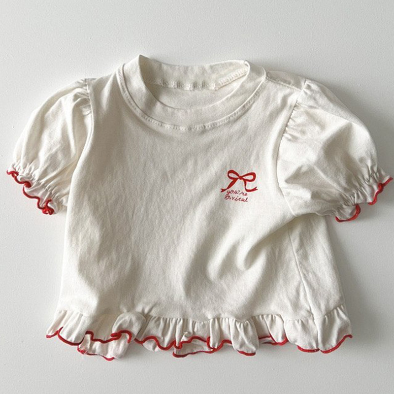 여름 새로운 소녀 활 편지 인쇄 둥근 목 귀여운 짧은 소매 티셔츠 탑 퍼프 슬리브 레이스 셔츠