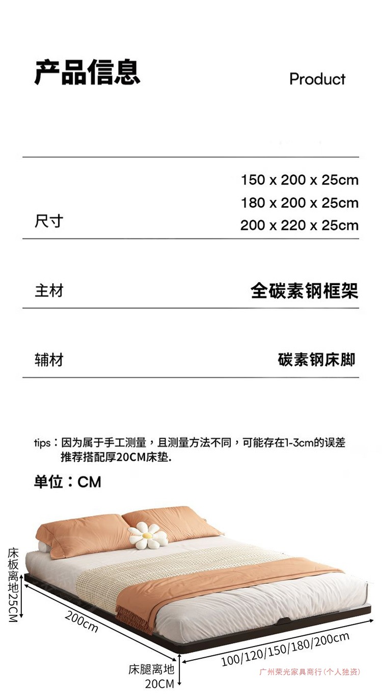 • (쿨 블랙) 탄소강 프레임 침대 + 침대 옆 테이블 * 1 (라이트 스트립 포함)