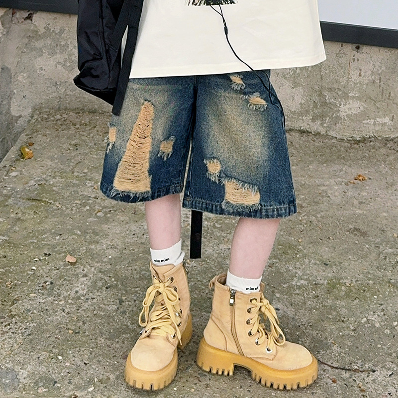 미국 스타일 짧은 소매 소녀 2025 여름 새로운 도착 강아지 인쇄 모든 경기 복고풍 직선 느슨한 구멍 중간 바지