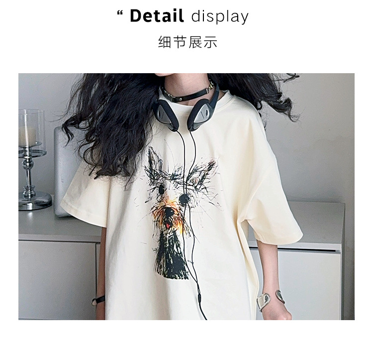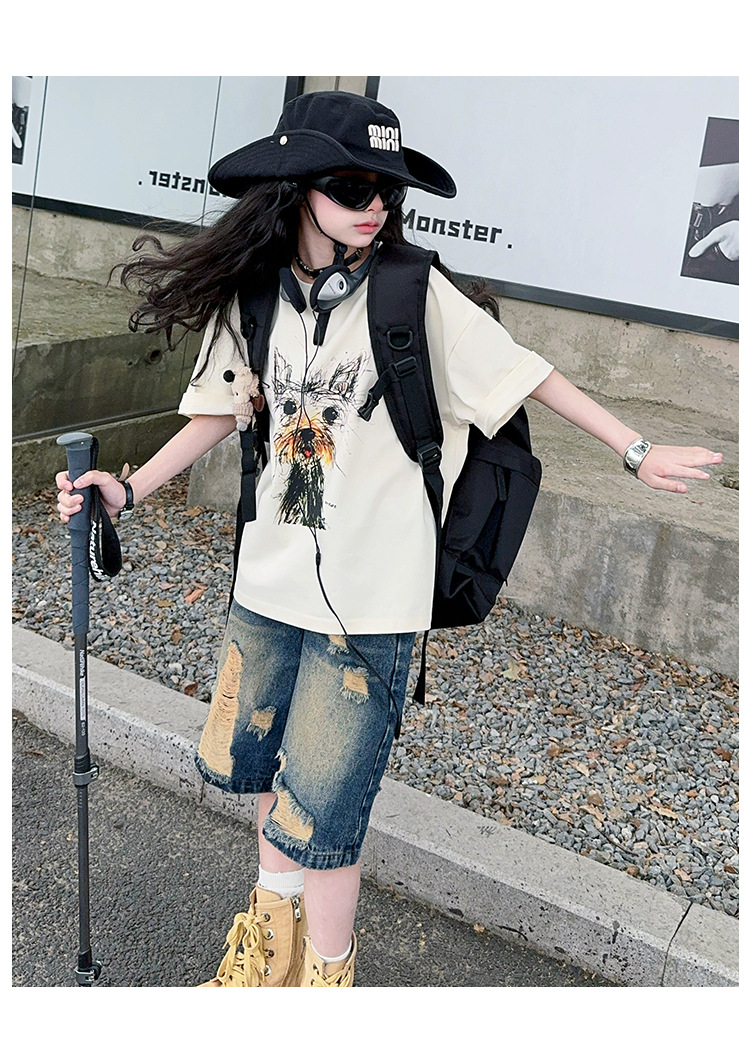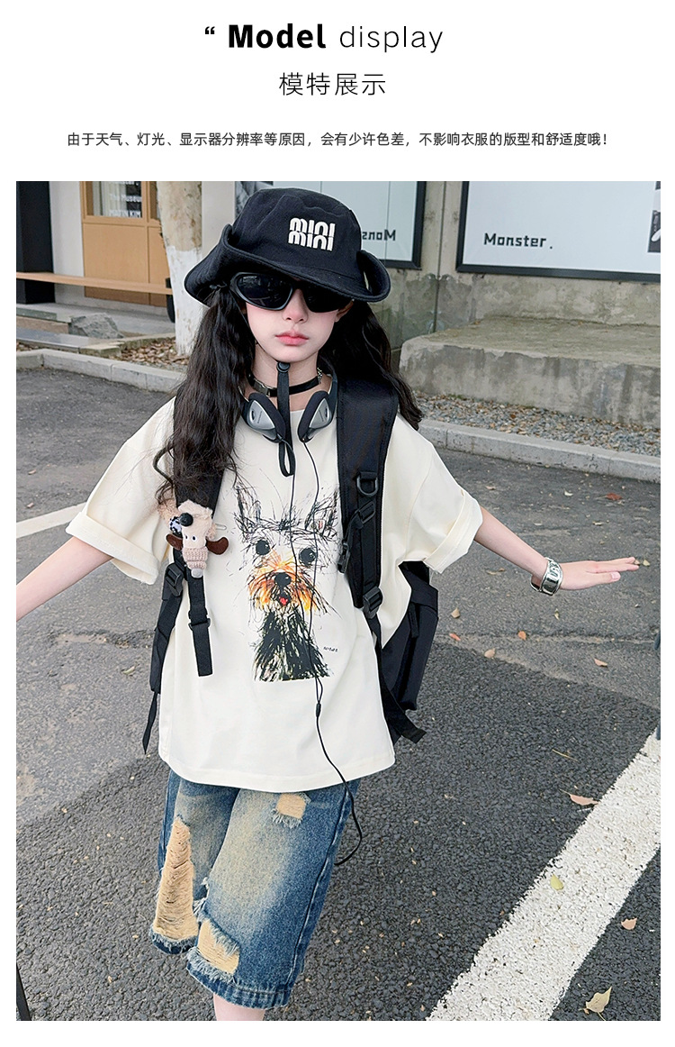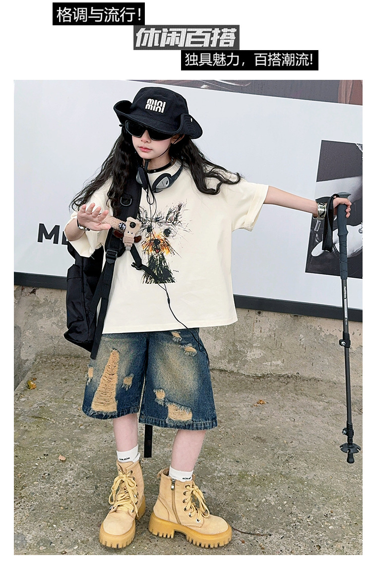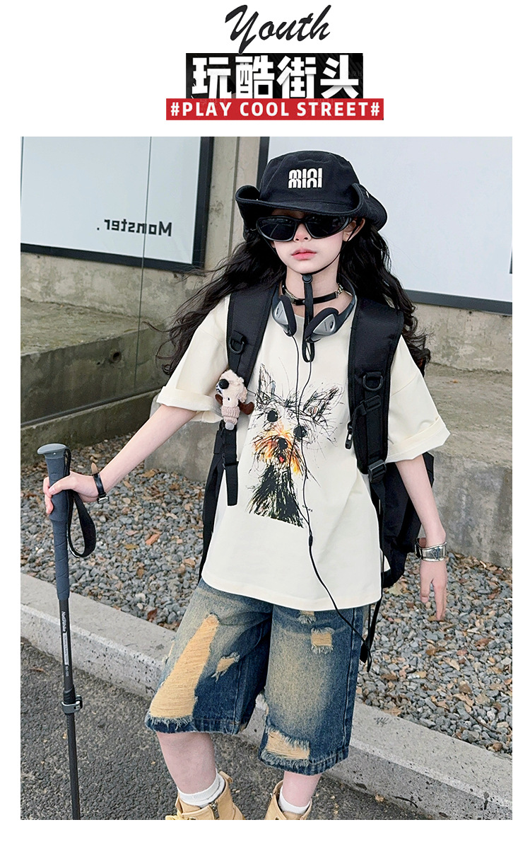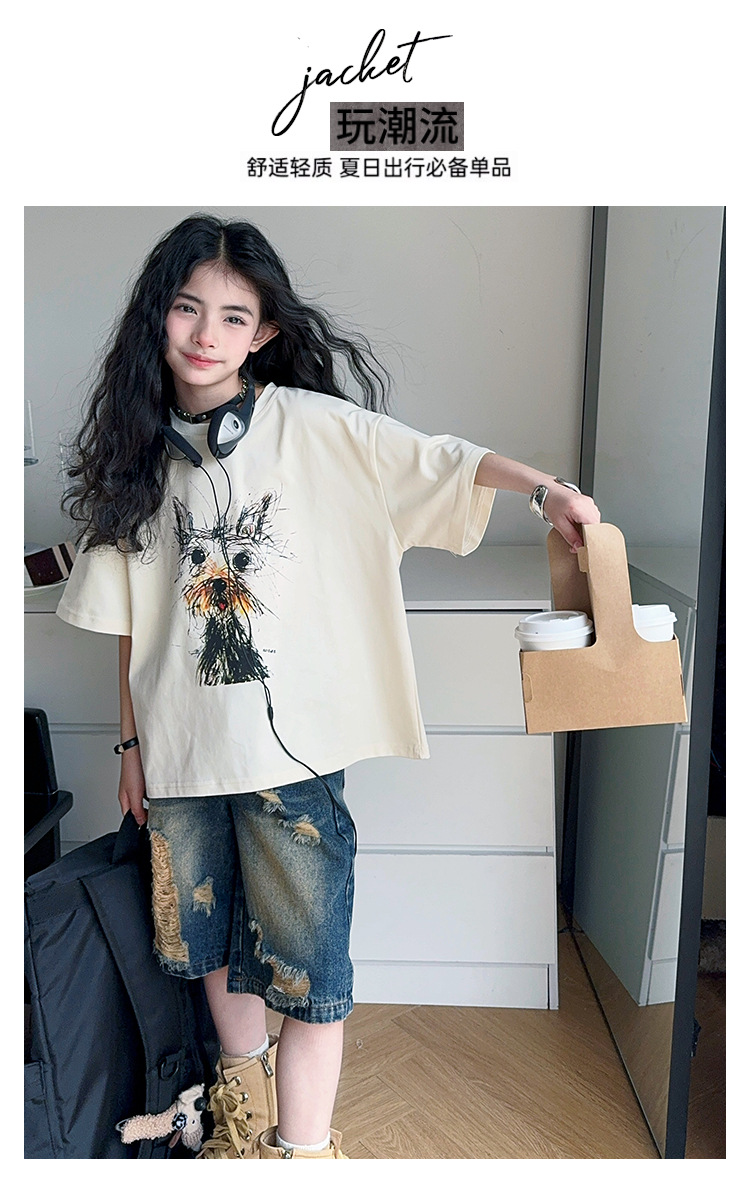 미국 스타일 짧은 소매 소녀 2025 여름 새로운 도착 강아지 인쇄 모든 경기 복고풍 직선 느슨한 구멍 중간 바지스토어 가기