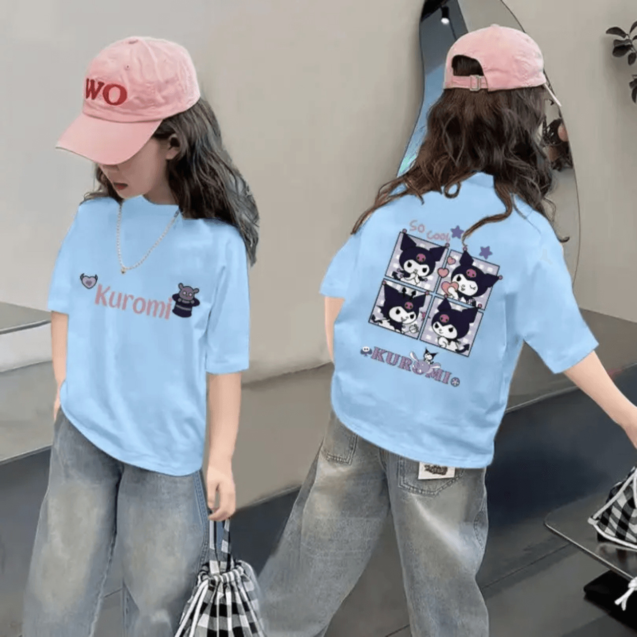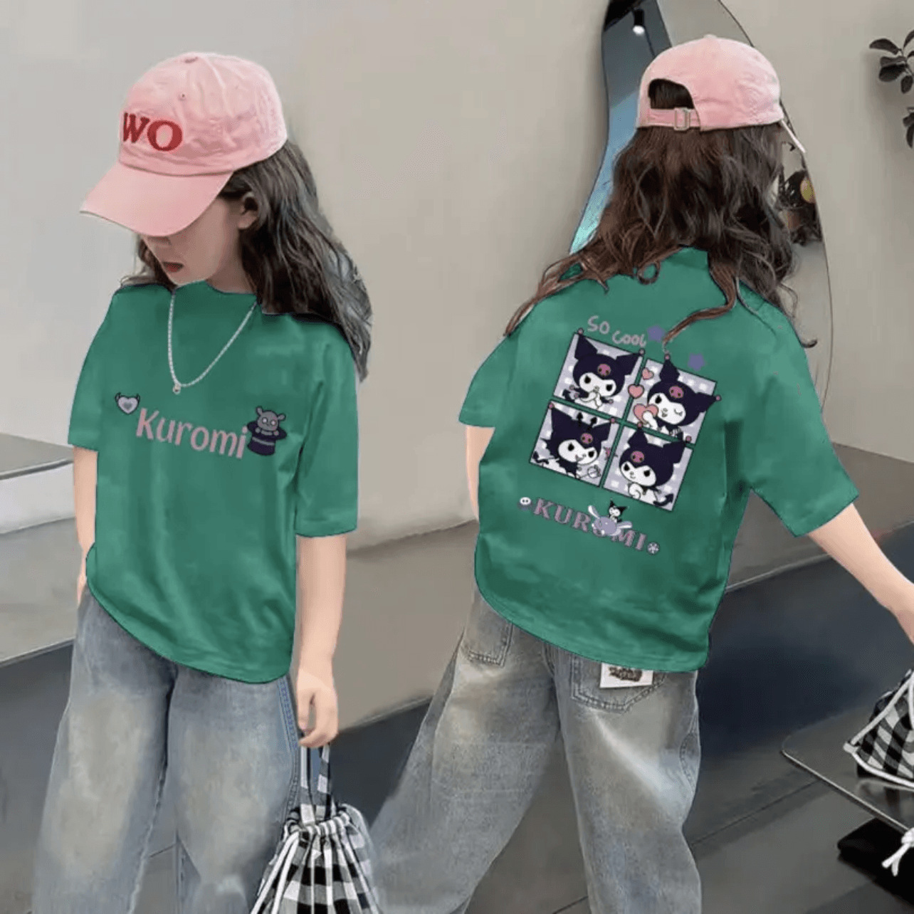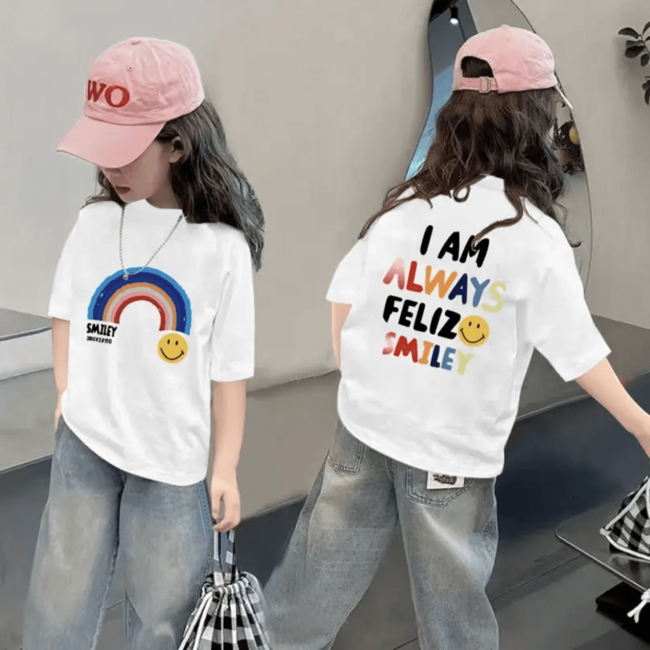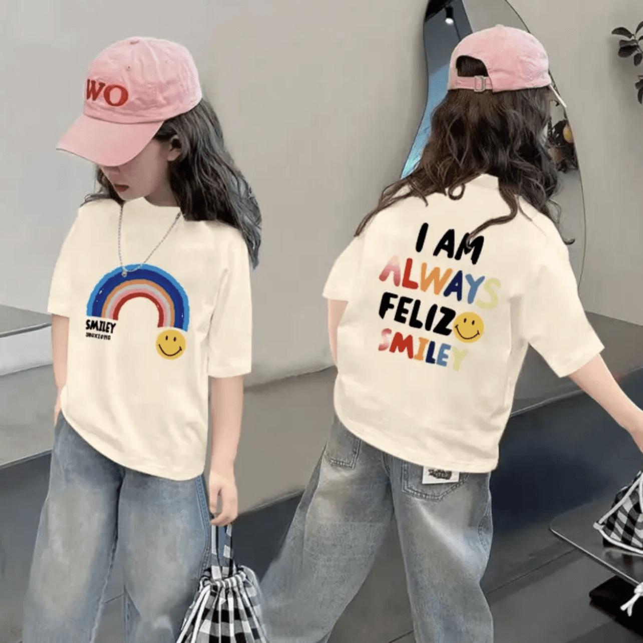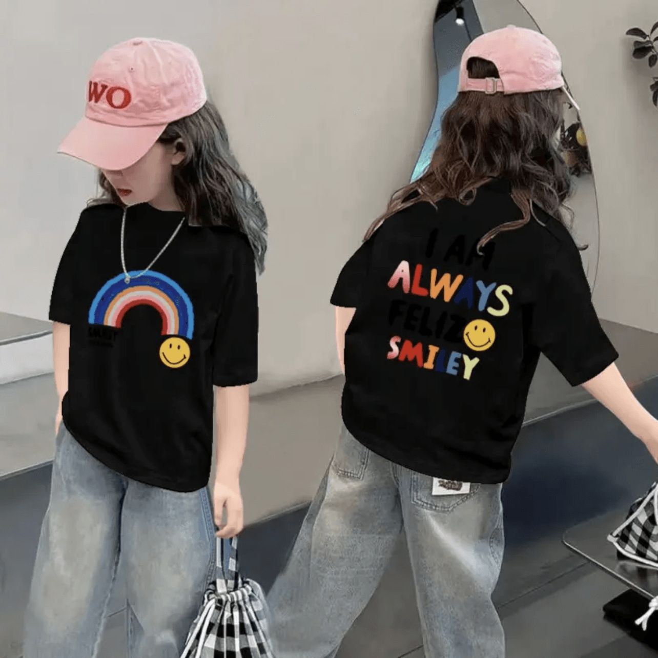 소녀 2025 년 새 여름 퓨어 코튼 카툰 프린트 반팔 티셔츠 빅 키즈 캐주얼 올 매치 반소매 탑 트렌디 티셔츠스토어 가기