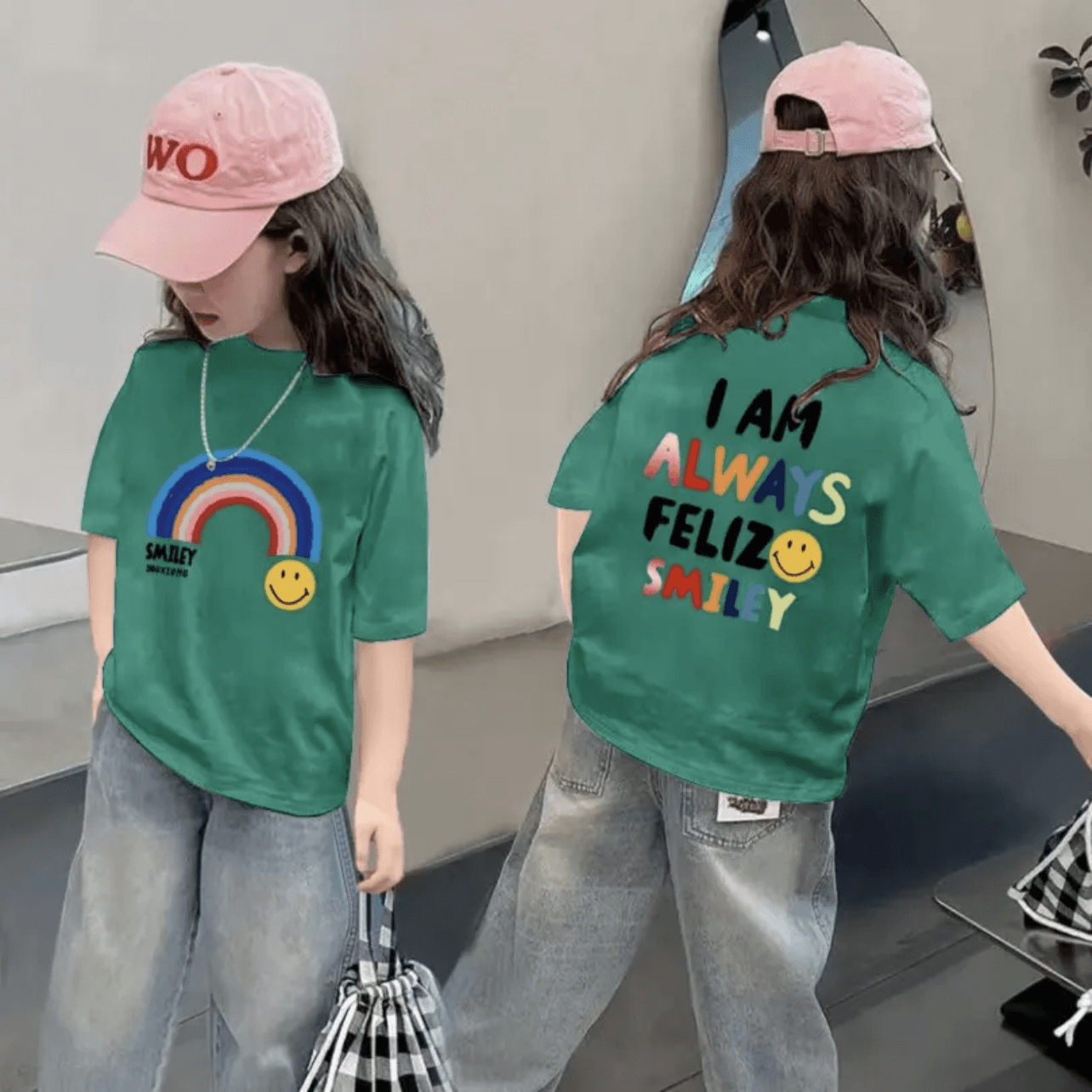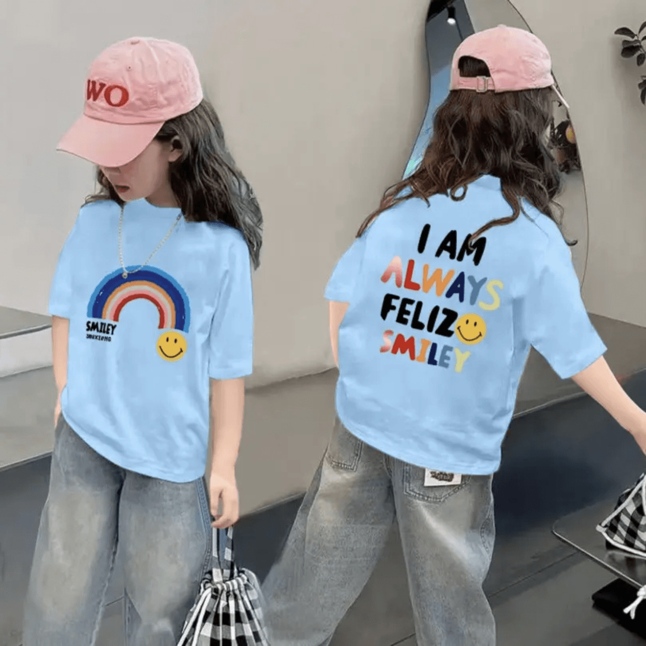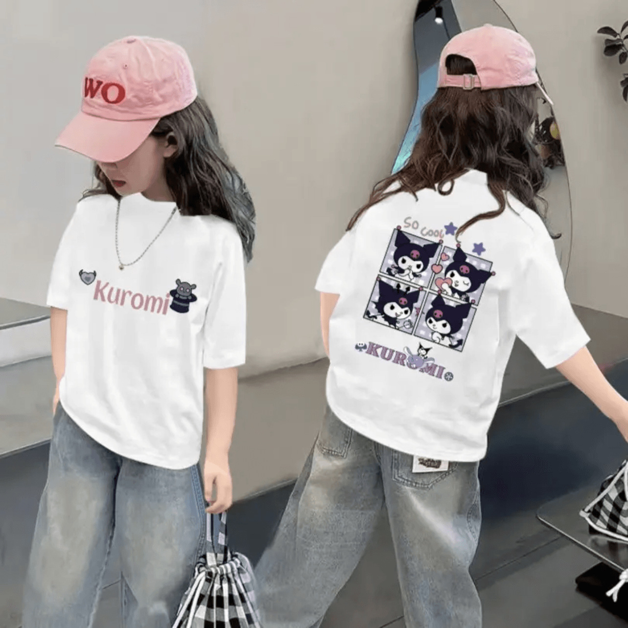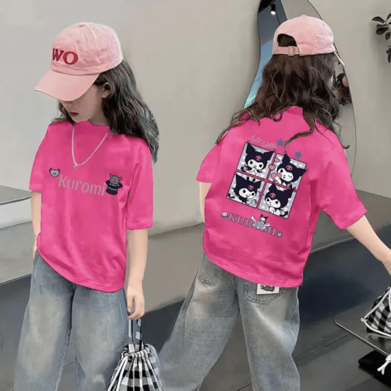 소녀 2025 년 새 여름 퓨어 코튼 카툰 프린트 반팔 티셔츠 빅 키즈 캐주얼 올 매치 반소매 탑 트렌디 티셔츠스토어 가기