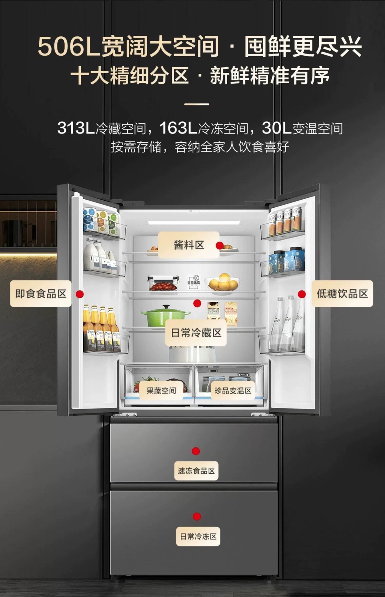 하이얼 냉장고 506L 프랑스 더블 도어 멀티 레벨 주파수 변환 서리없는 대용량 냉장고 가구 공식