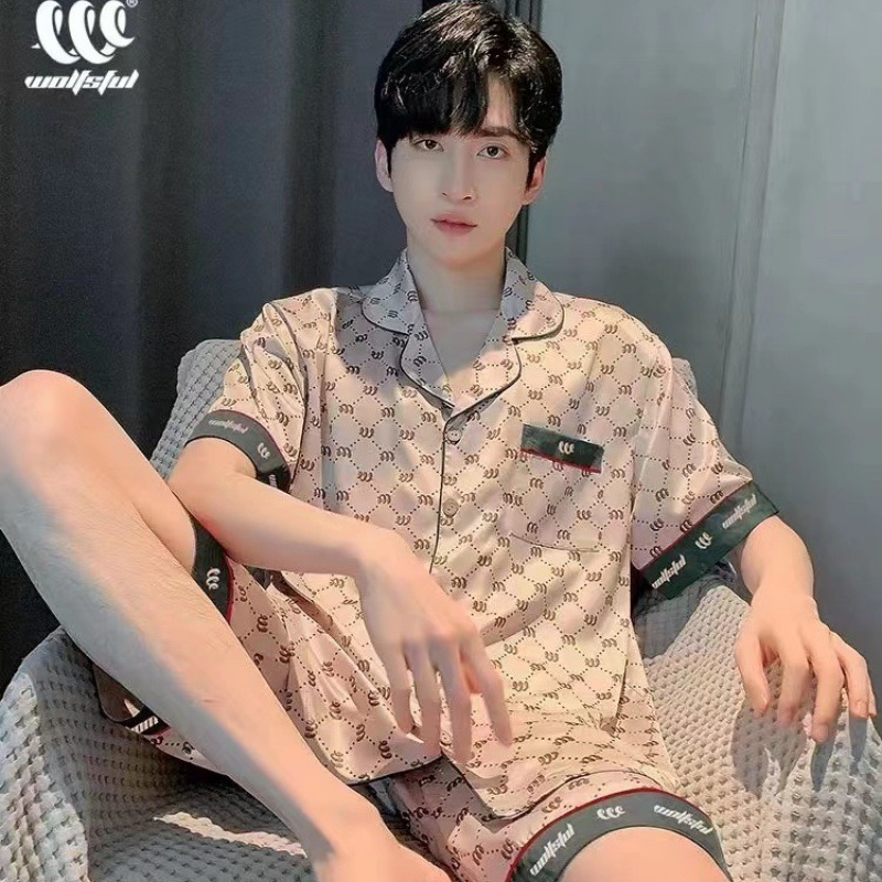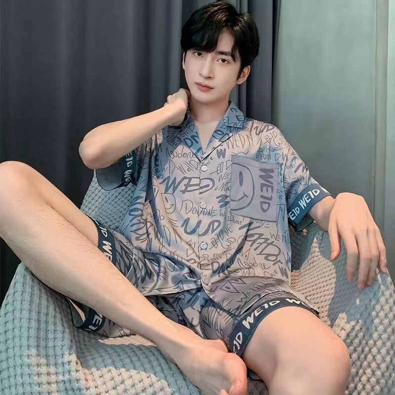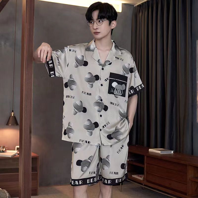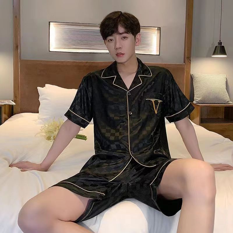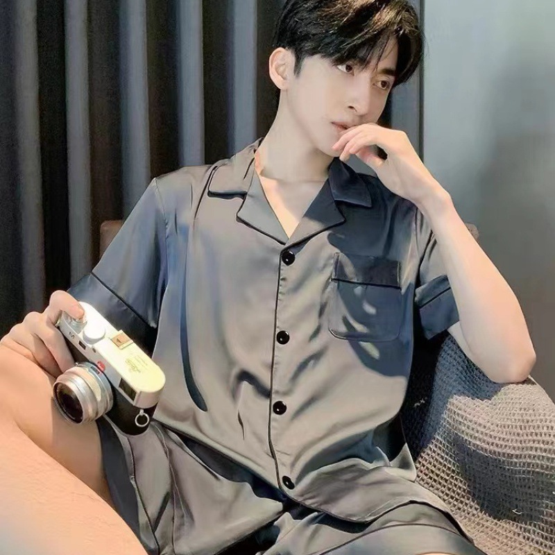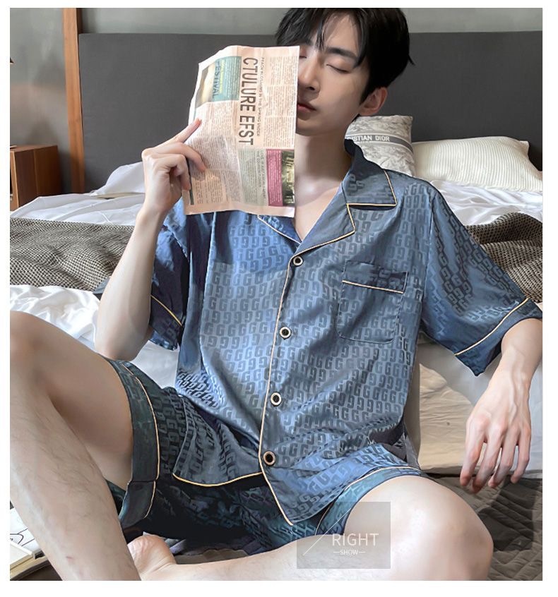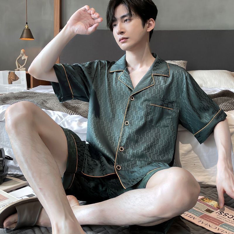 남성용 잠옷 여름 얼음 실크 반팔 반바지 새틴 실크는 청소년 가정복 세트 여름 얇은 스타일 외부에 착용 가능