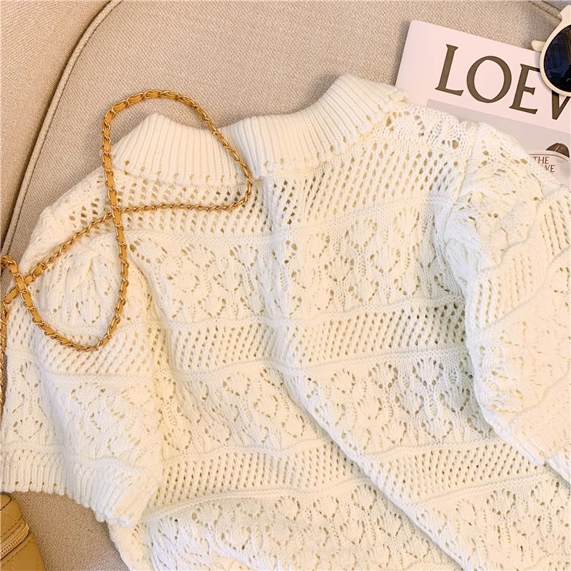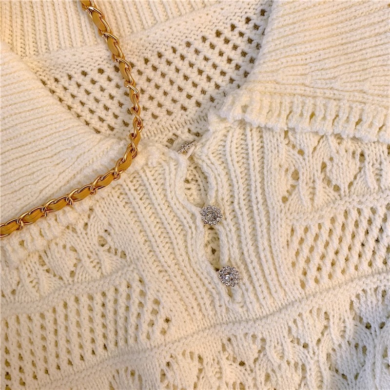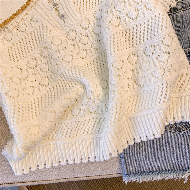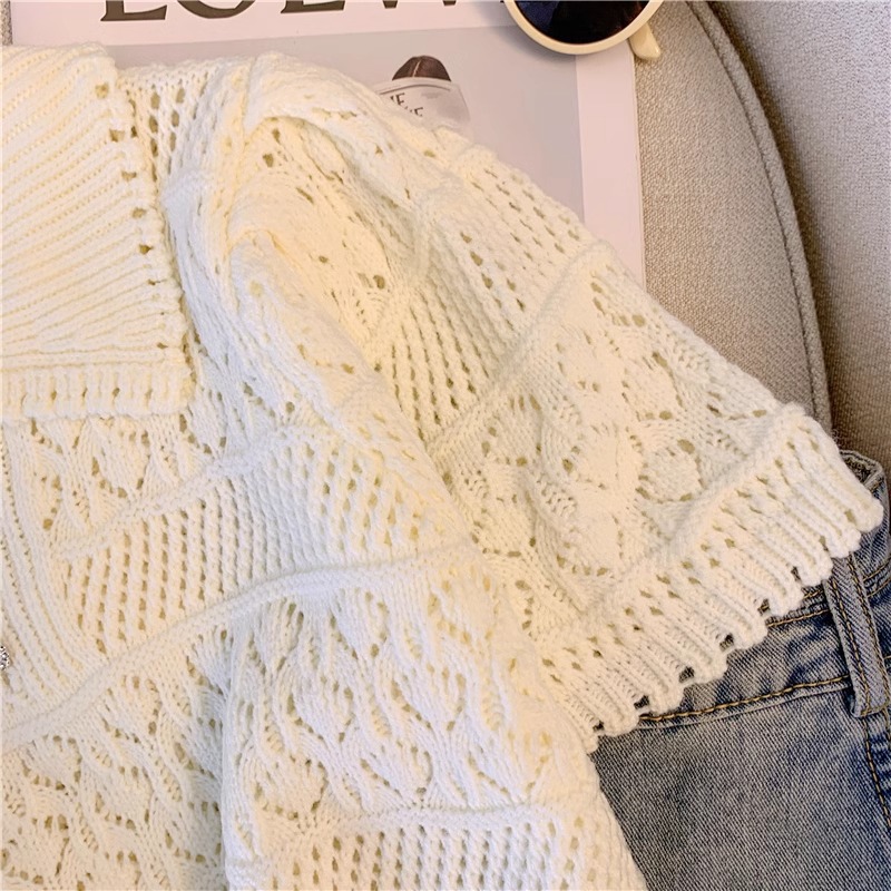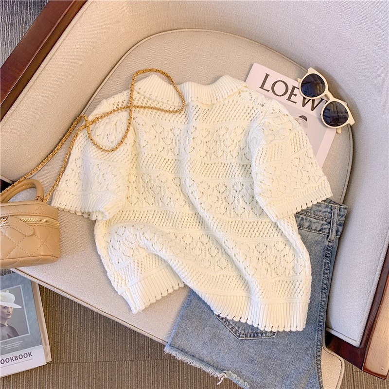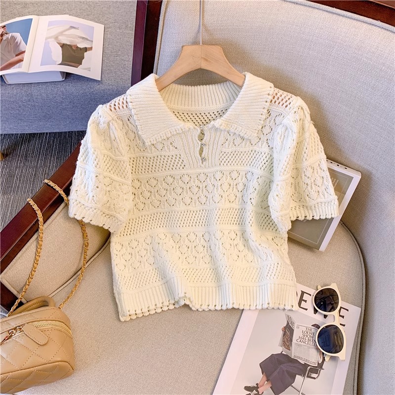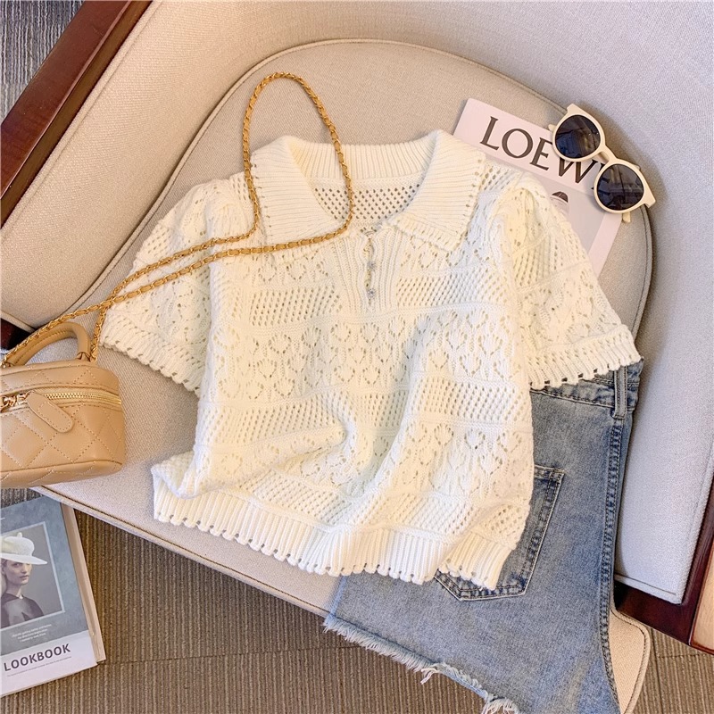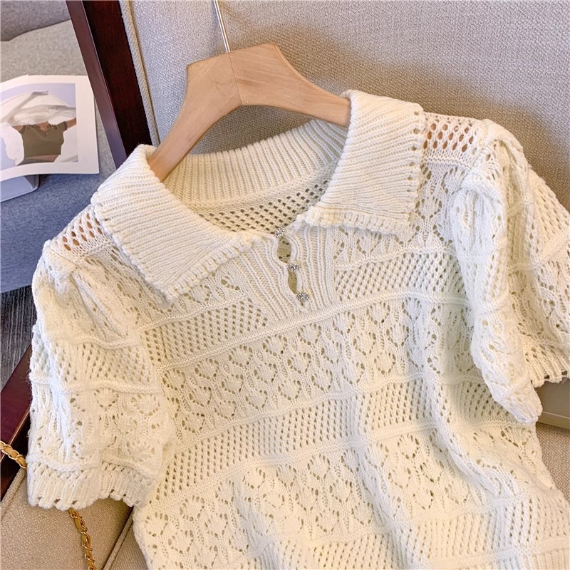 여름 독특한 세련된 빈 크로 셰 뜨개질 스웨터 여성의 달콤한 느슨한 폴로 칼라 조끼 티셔츠 새로운 얇은 탑