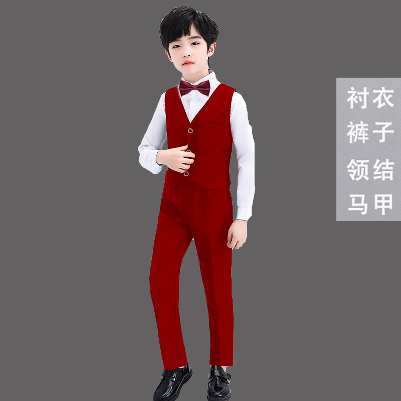 • 빨간 조끼, 흰색 긴 소매, 빨간 바지, 버건디 나비넥타이